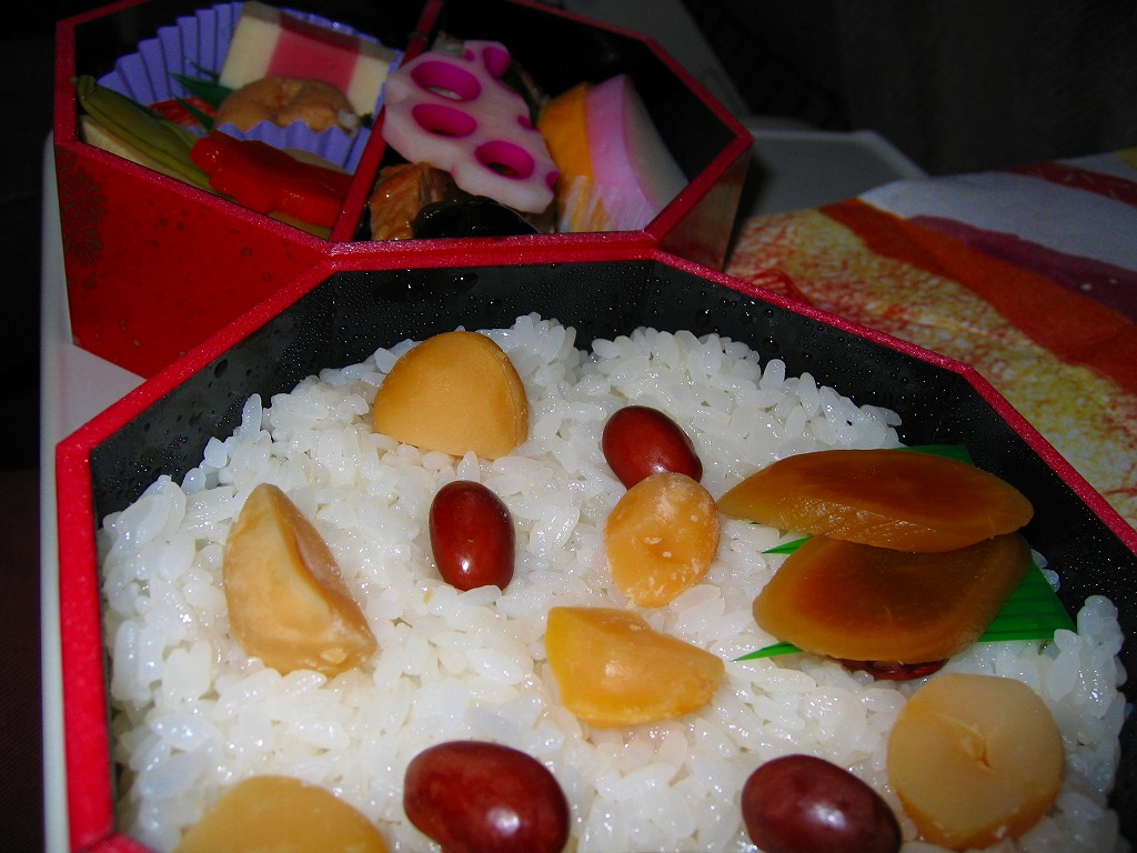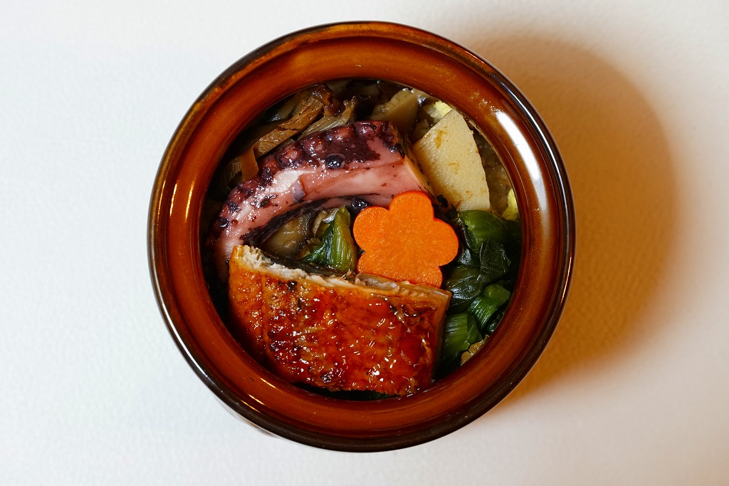 極彩柄の正八角形の容器を二段重ねにして、和紙風の紙袋に収納する。中身は下段が栗おこわ、上段が焼サワラ、穴子八幡焼、チキンロール、昆布巻、玉子焼、蒲鉾、海老、昆布巻、タケノコや里芋などの煮物など。
