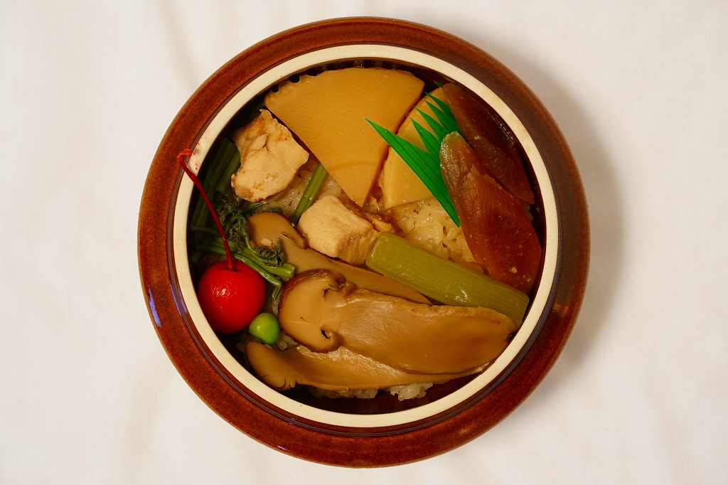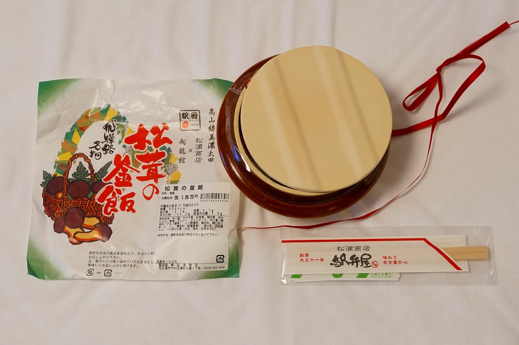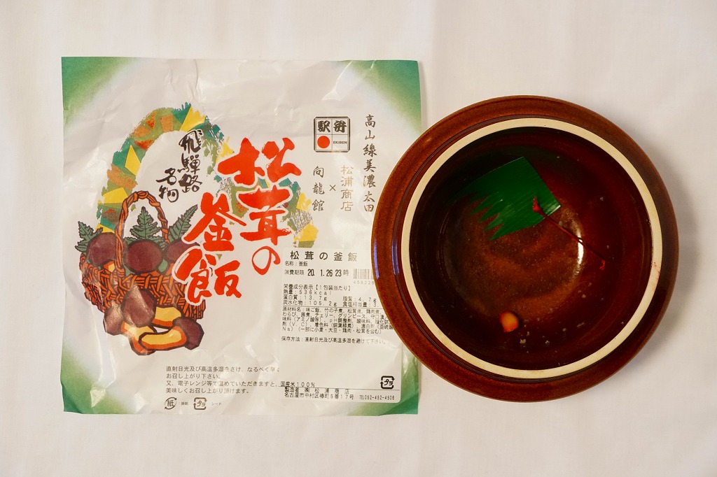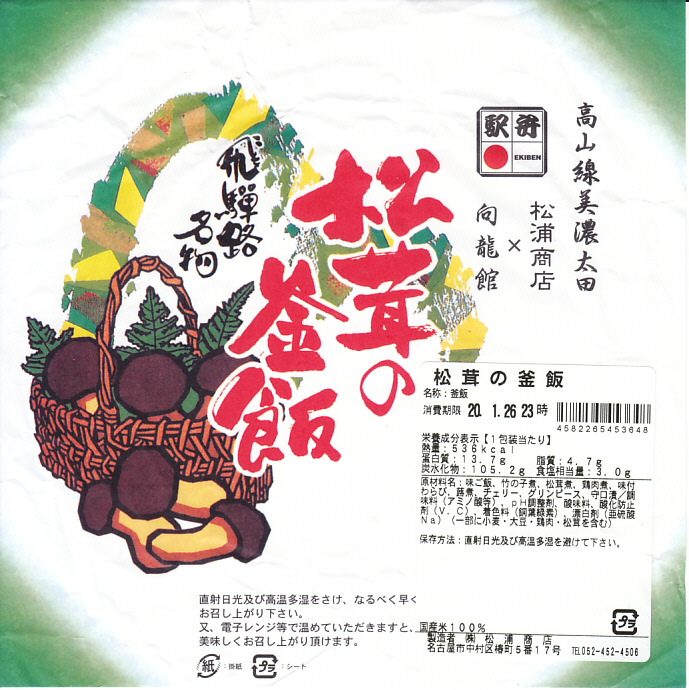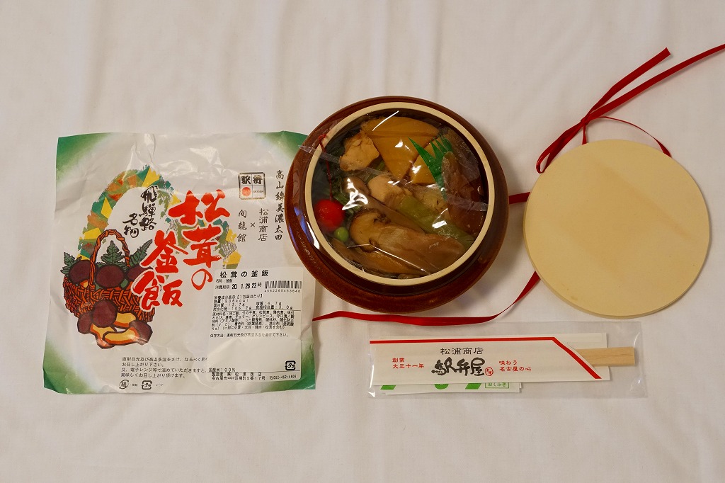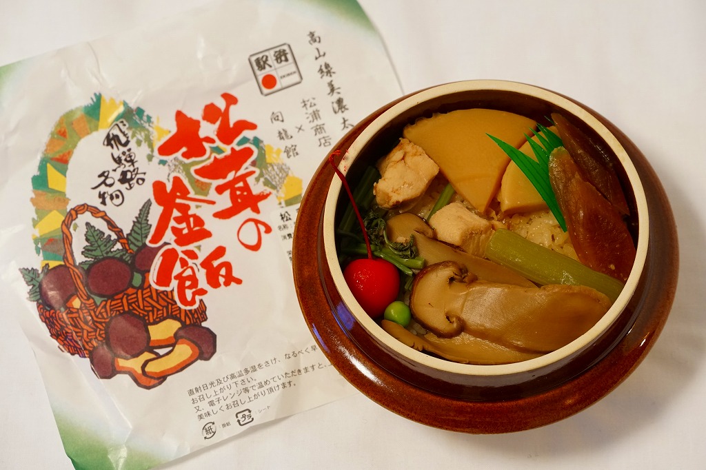 2019(令和元)年の秋からスーパーの駅弁大会で売られるようになったらしい商品。同年5月に失われた美濃太田駅弁「松茸の釜飯」が、名古屋駅の駅弁屋に引き継がれたようで、早くも復刻販売となった模様。見た目は以前と区別が付かず、よく見ると掛紙に「松浦商店×向龍館」の記載が加わっている。陶製の釜飯容器に茶飯を詰め、松茸、鶏肉、タケノコ、ワラビを載せて、グリーンピースを散らしてさくらんぼを添えるのは、美濃太田駅の駅弁だった頃と同じ。名古屋駅で買えたという話は、まだ聞かれない。2022年秋冬の駅弁大会シーズンには、出てきていない模様。