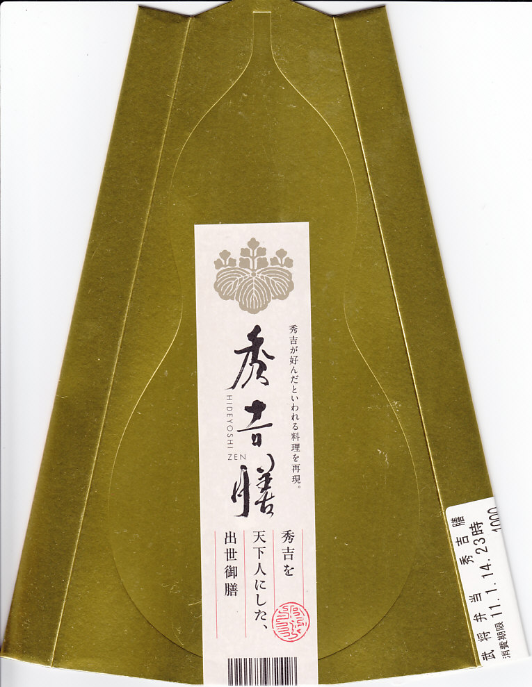 戦国時代に天下統一を果たした豊臣秀吉を徳川家康が招いた餐応料理を再現したという。食材は御飯を除きすべて豊臣秀吉にちなんでいることが、正方形に折りたたまれたしおりで確認できる。その他にも秀吉へのこだわりが垣間見える、よく考えられた作品であり、戦国時代を舞台にした漫画作品やゲームの流行による歴史ブームの中で堂々と京王百貨店駅弁大会へ出陣してきたにもかかわらず、会場では三英傑揃って閉店まで山積みという惨敗を喫した印象。駅弁大会ではやはり、シンプルなものが好まれるのだろうか。この京王百貨店の駅弁大会で引退か。