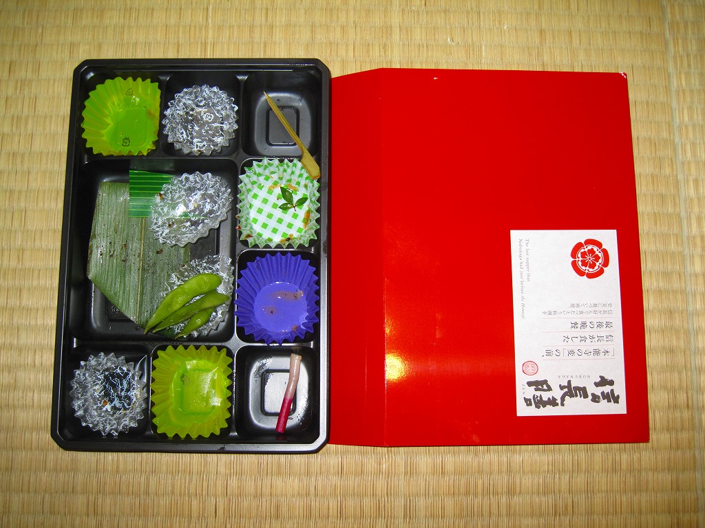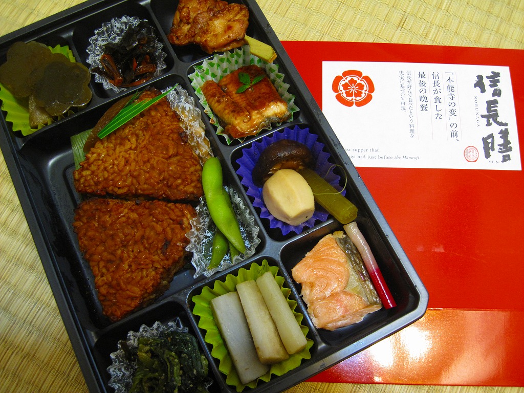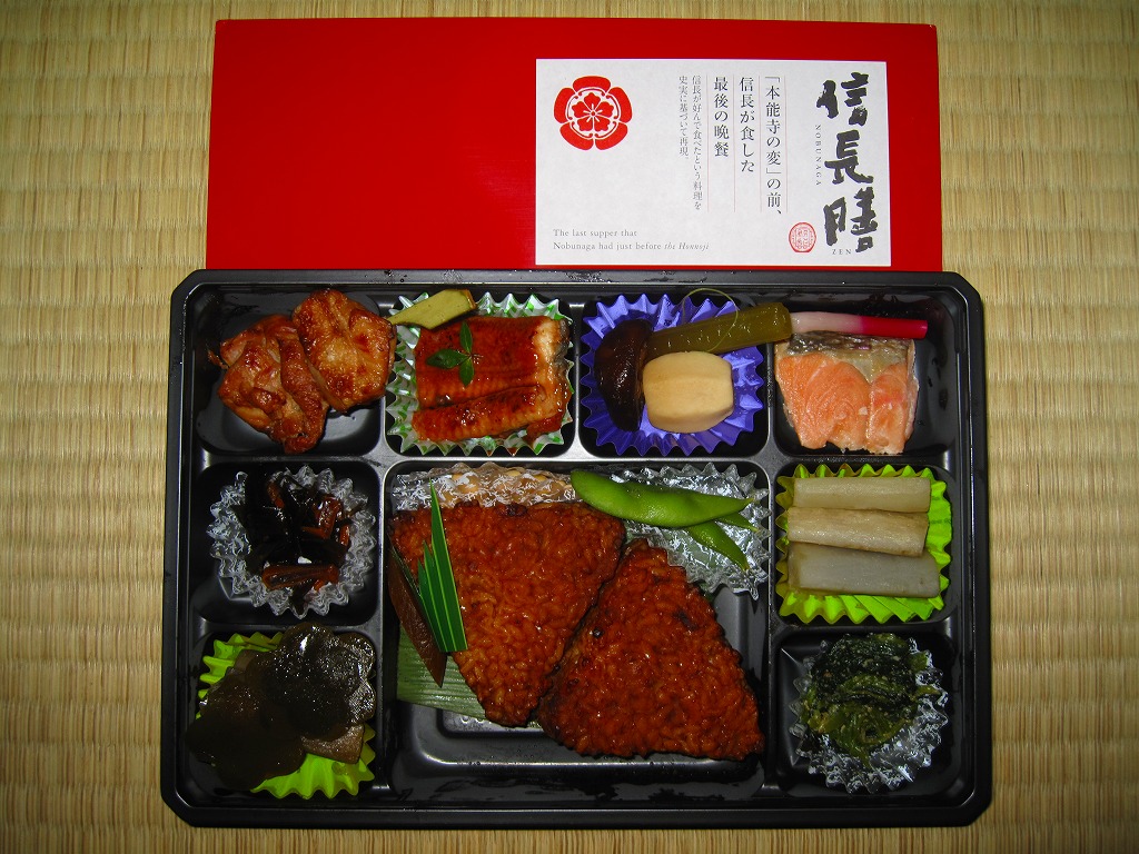 中身は焼き味噌おにぎり2個、焼マス、ウナギ蒲焼、焼き鳥、サトイモとフキとシイタケの煮物、酢ごぼう、ホウレンソウおひたし、昆布とニンジンの和え物、花形昆布やダイコン味噌漬など。天正10年(1582年)5月に織田信長が安土城で徳川家康をもてなした晩餐「安土御献立」を、資料「続群書類従」に基づきできるだけ再現したという。