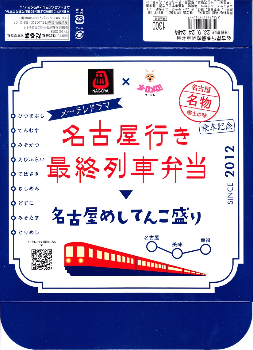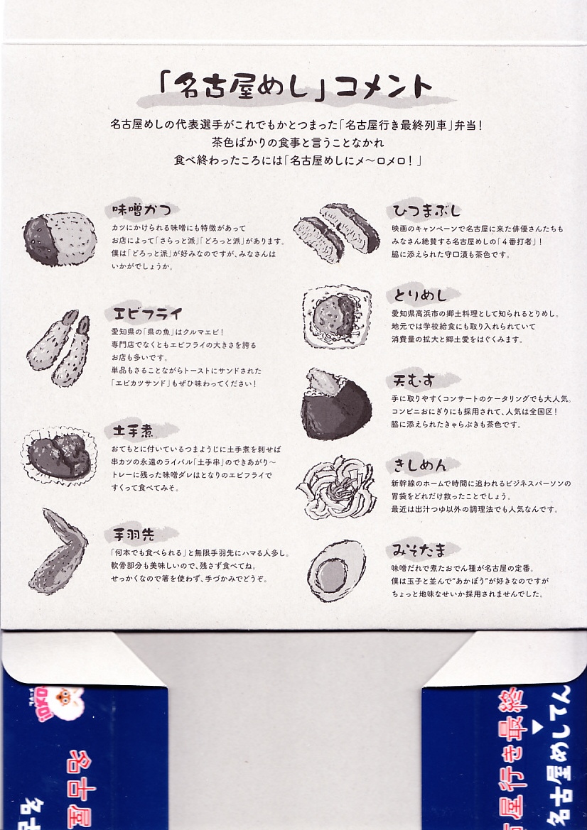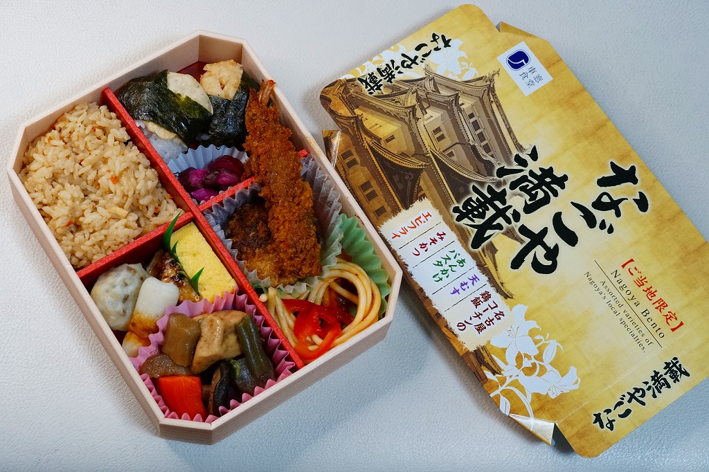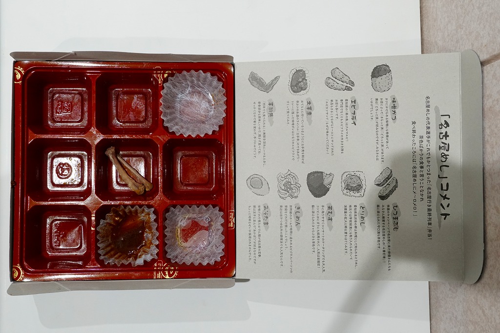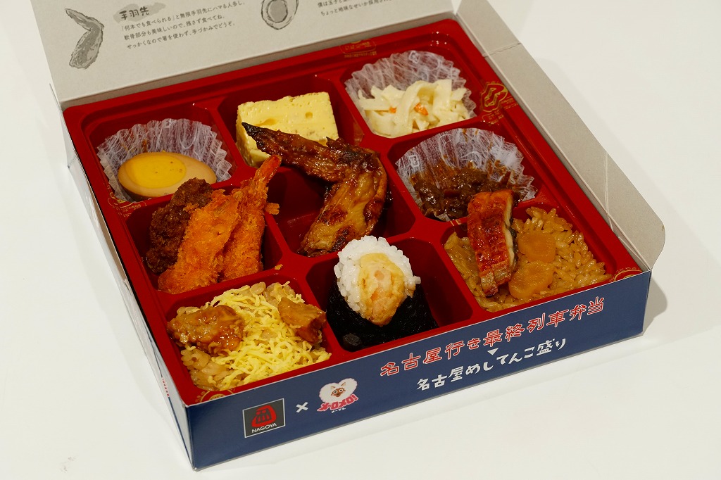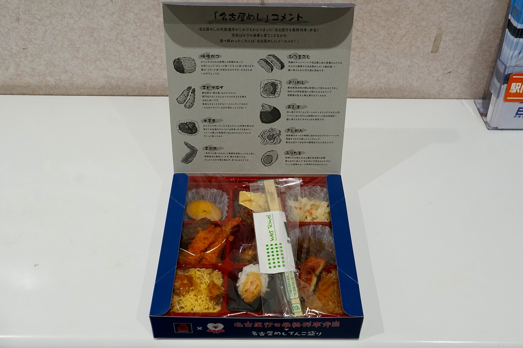 2022(令和4)年10月1日に名古屋駅で発売。名古屋テレビ放送が2012年から断続的に製作するテレビドラマ「名古屋行き最終列車」のお弁当。調製元とロケ弁当にはうるさいドラマスタッフが吟味を重ねたのだという。9区画の中身は専用の紙箱の表面と内面に記され、「味噌かつ」「エビフライ」「土手煮」「手羽先」「ひつまぶし」「とりめし」「天むす」「きしめん」「みそたま」となる。確かな「名古屋めしてんこ盛り」。茶色だらけの中身で、名古屋の食を過不足なく学習できる。価格は2022年の発売時で1,200円、2023年の購入時で1,300円。