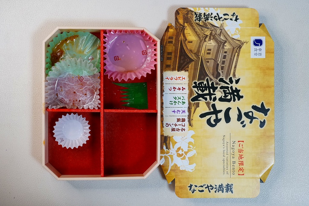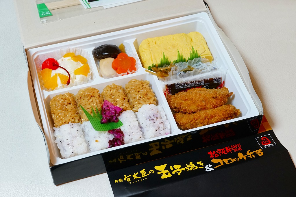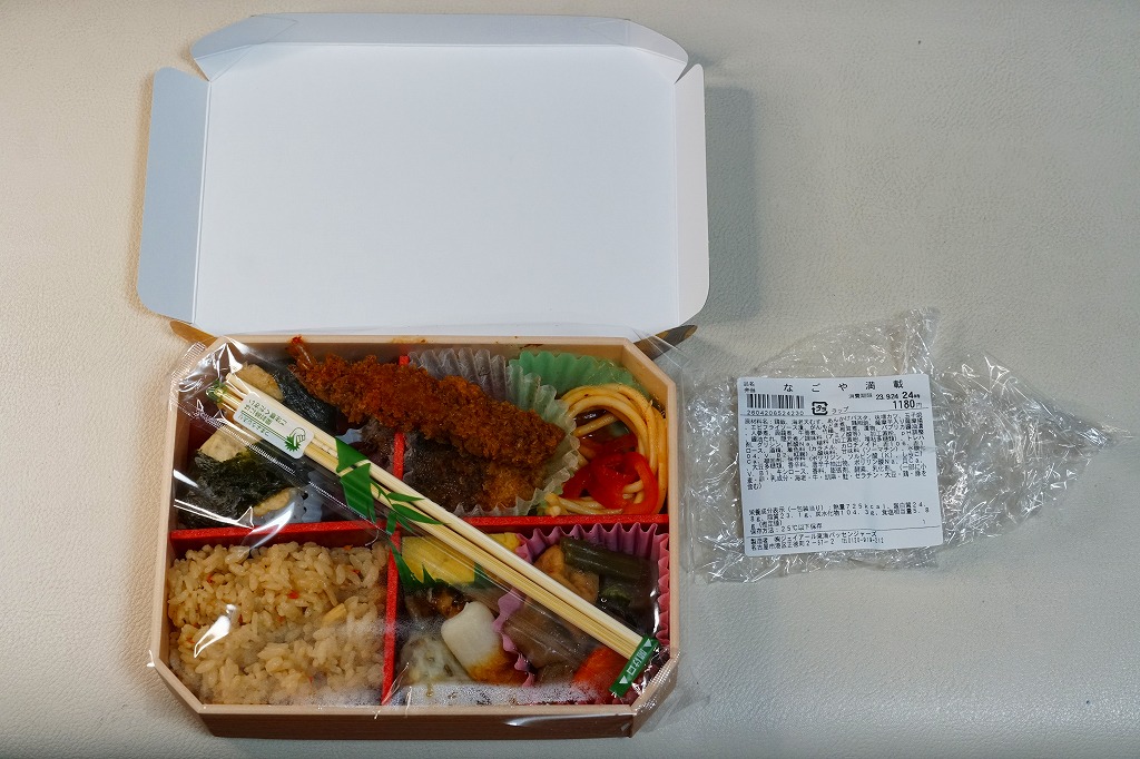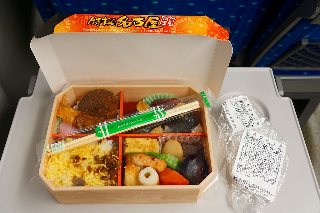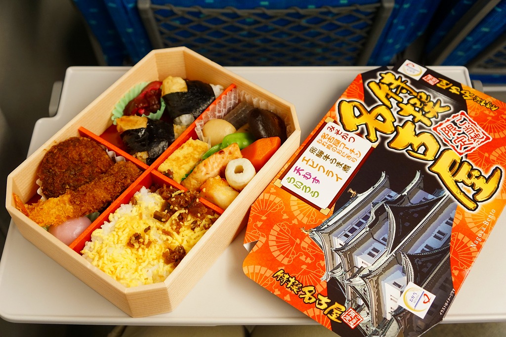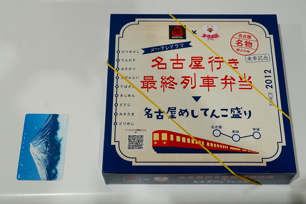 2022(令和4)年10月1日に名古屋駅で発売。名古屋テレビ放送が2012年から断続的に製作するテレビドラマ「名古屋行き最終列車」のお弁当。調製元とロケ弁当にはうるさいドラマスタッフが吟味を重ねたのだという。9区画の中身は専用の紙箱の表面と内面に記され、「味噌かつ」「エビフライ」「土手煮」「手羽先」「ひつまぶし」「とりめし」「天むす」「きしめん」「みそたま」となる。確かな「名古屋めしてんこ盛り」。茶色だらけの中身で、名古屋の食を過不足なく学習できる。価格は2022年の発売時で1,200円、2023年の購入時で1,300円。