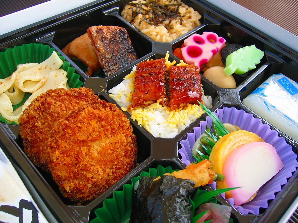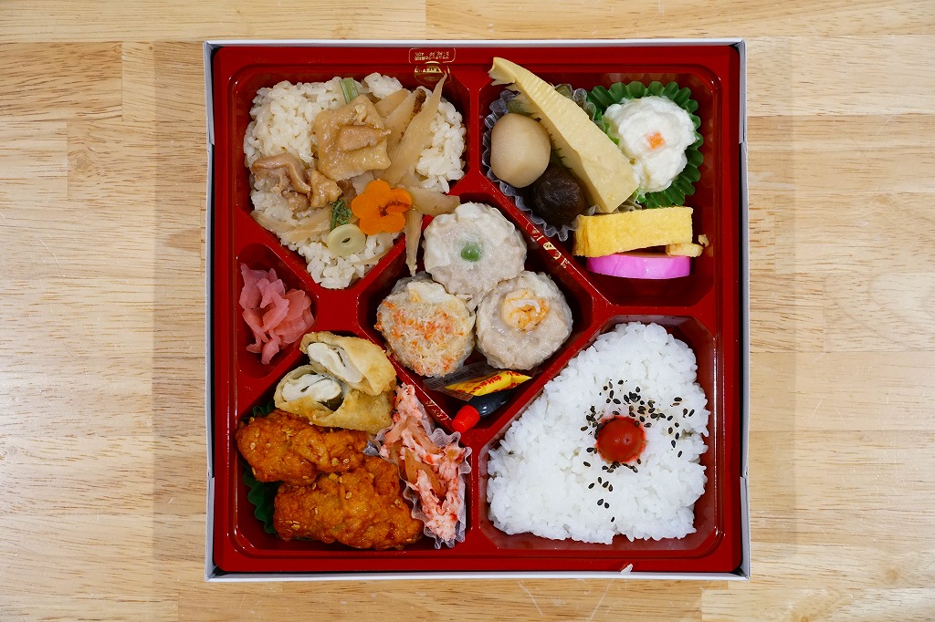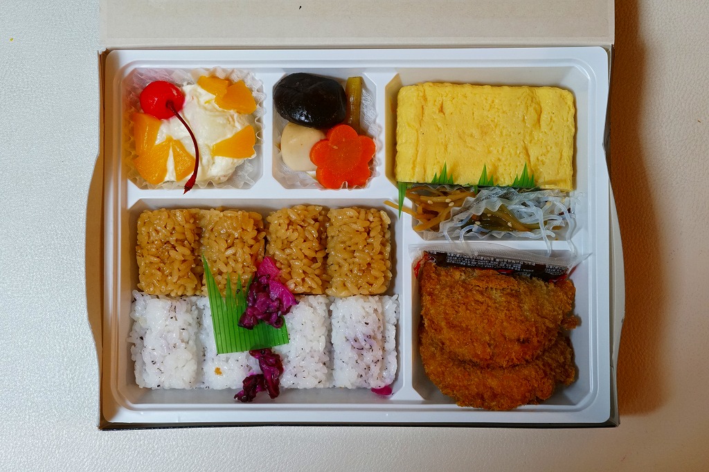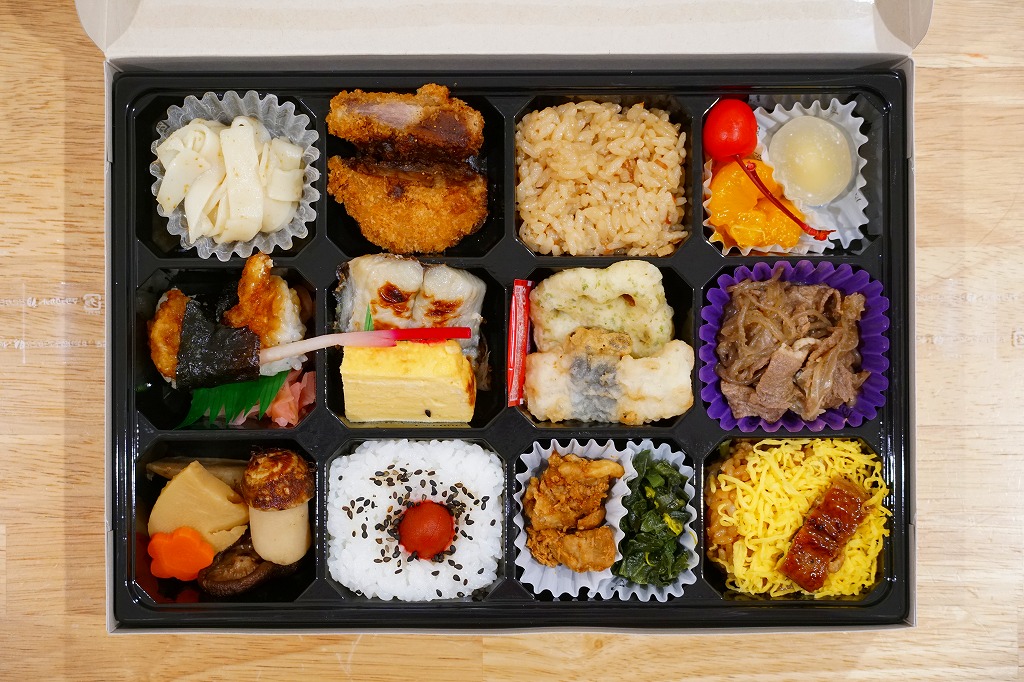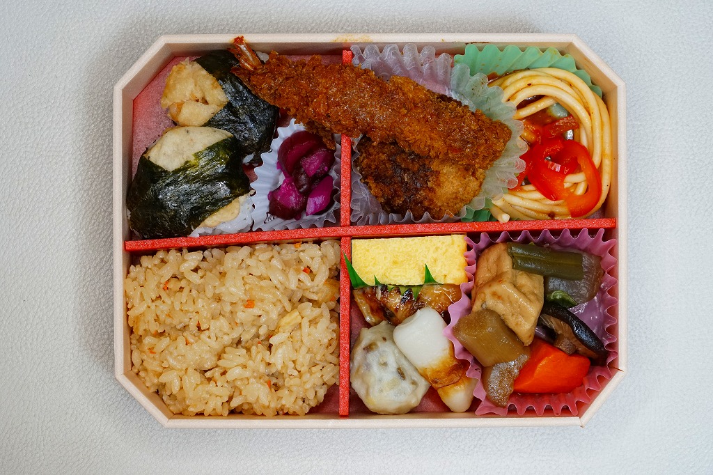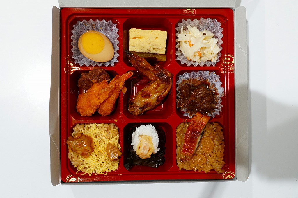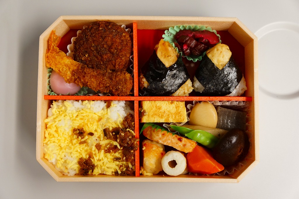 正八角形の黒い発泡材製容器をラップで密封し、商品名や中身のイラストなどを記した紙帯を巻く。4区画の中身はそれぞれ、桜でんぶで桜色になったちらし寿司という名の握り飯、ひつまぶし風うなぎめし、味噌だれロースカツとおからときんぴらごぼう、玉子焼きと鶏つくねと根菜類の煮物など。