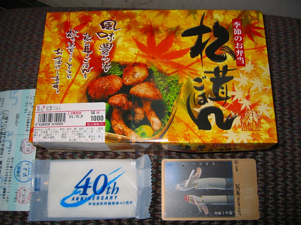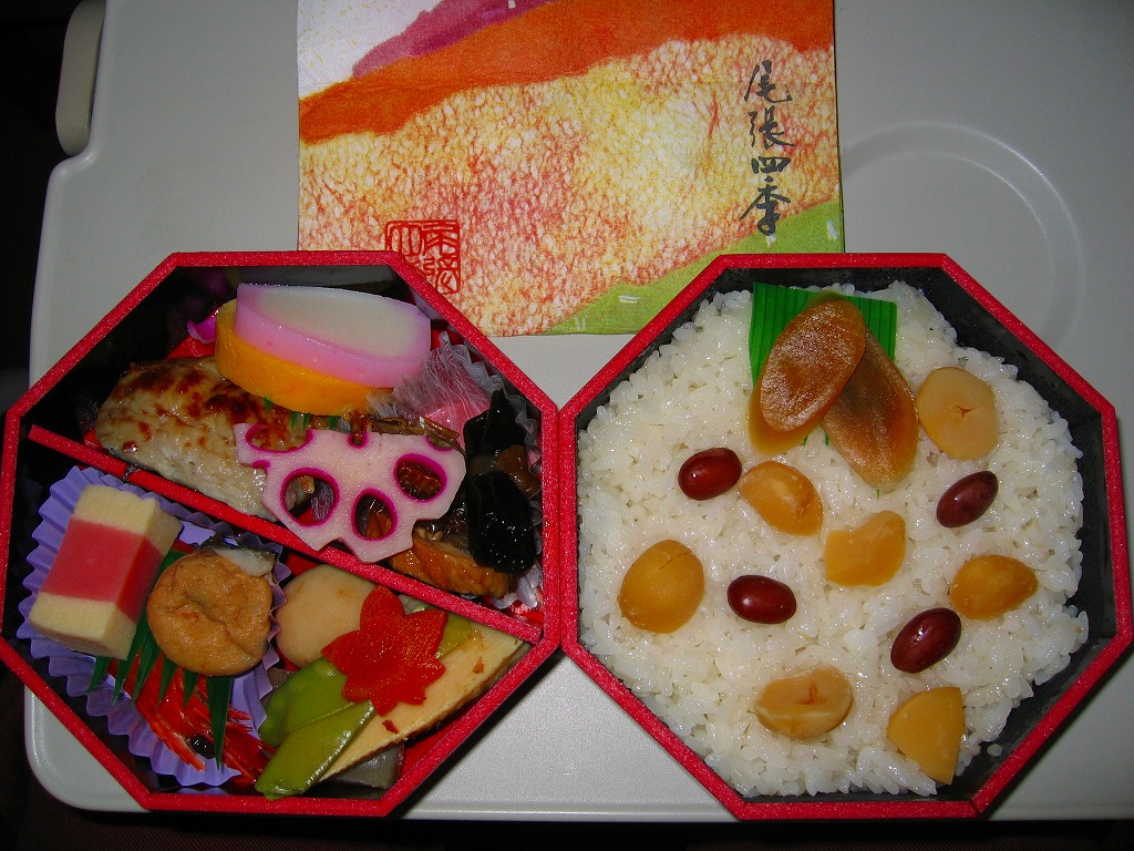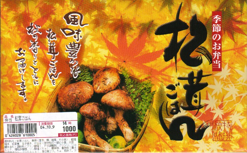 名古屋のJRCPの、季節のお弁当。小さな経木枠の長方形の容器に枠付きの紙のふたをかける。中身は駅弁の名前そのままの松茸御飯、エンドウマメと紅葉型人参に彩られて、50×20×2mm程度と駅弁にしては大きい松茸が6切れも御飯の上に載り、松茸の味と香りがいつまでも口の中に残る。