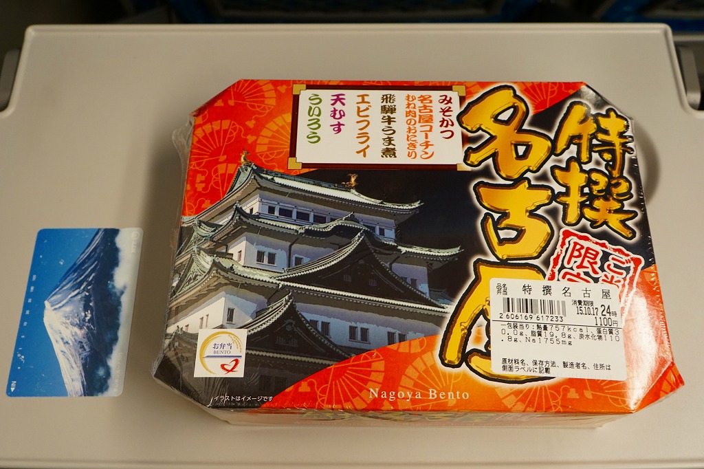 2015(平成27)年5月28日のリニューアル。従前は「特撰弁当名古屋」という、東京・名古屋・京都・新大阪の各駅別に設定した季節の幕の内弁当であったが、名古屋以外のものは消えた。名古屋城天守閣の写真を使う派手な絵柄のボール紙ふたにリストを書くとおり、中身はみそかつ、鶏おにぎり、牛うま煮、エビフライ、天むす、ういろうなど。東京の人が期待する名古屋を、一覧としてしっかり押さえた。2016年11月に「なごや満載」へリニューアル。