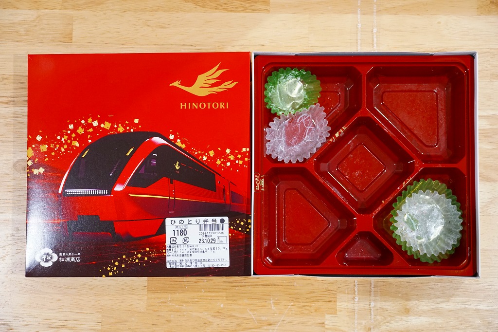 2021(令和3)年7月までに近鉄名古屋駅で発売か。2020年3月に近鉄の名阪甲特急で、近鉄名古屋駅と大阪難波駅を約2時間で結ぶ特急列車でデビューした80000系電車「ひのとり」にちなむお弁当。大阪難波駅では2020年8月に神戸駅弁の淡路屋が「名阪特急ひのとり弁当」を発売、こちらの調製元は名古屋駅弁の松浦商店なので、名阪の駅弁屋が同じ題材で駅弁を競演する。外箱の絵柄はいずれも特急電車「ひのとり」で、おそらく近畿日本鉄道から公式に提供されたCGだろうから、見た目はほぼ同じ。ふたを開けて食べ比べて、その違いに気が付くことになる。