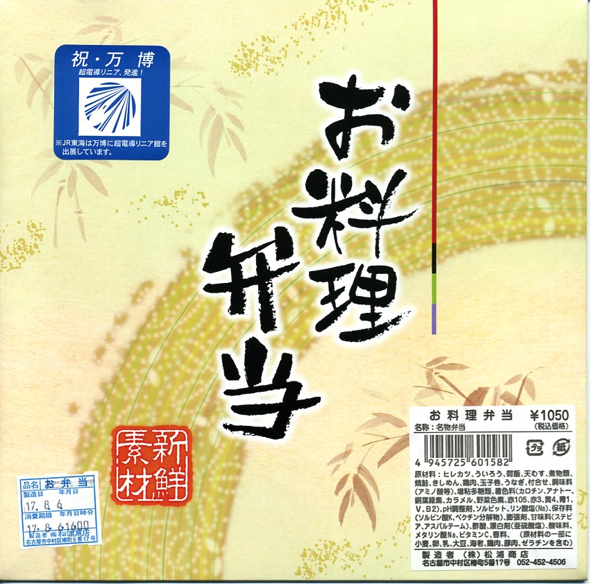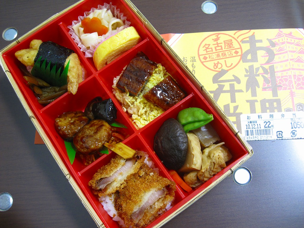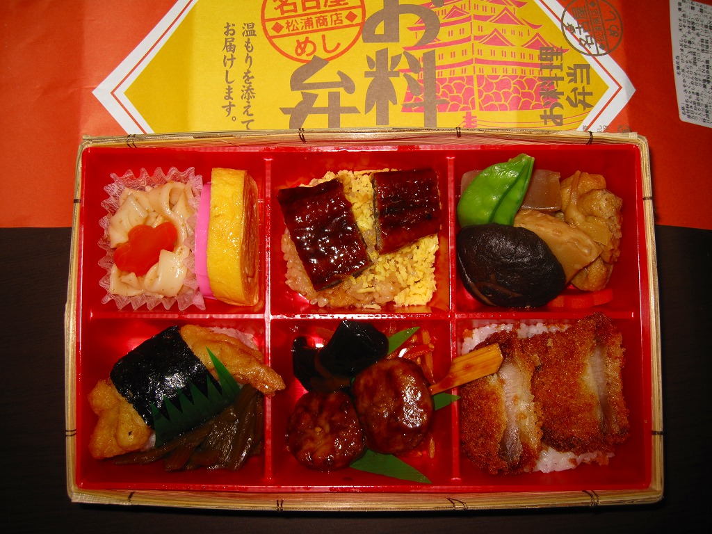 名古屋駅の普通駅弁。黒い9区画プラ製トレーを入れた正方形のふた付きボール紙容器を赤い紙帯で留める。中身はひつまぶし風鰻重、天むす風海苔巻、きしめんサラダ、鶏飯、みそカツ、ういろうなど。名古屋を主張する内容で、価格なりの風味と品質がある。パッケージには名古屋の絵柄も駅弁マークも入らないが、代わりに愛知万博JR東海リニア館のマークが入っていた。