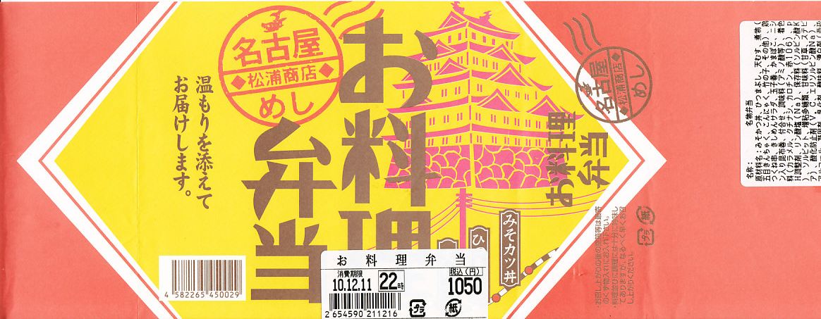 名古屋駅弁「お料理弁当」の、2010(平成22)年時点での姿。駅弁の名前と調製元は確かに同じだが、まったく別のものに生まれ変わっている。竹皮製の長方形の容器に名古屋城と商品名などを印刷した掛紙を巻く。赤いトレーで6区画に分けられた中身は、みそかつ丼、ひつまぶし、天むす、シイタケやタケノコなどの煮物、鶏つくね串と昆布巻き、きしめんサラダと玉子焼とかまぼこ。丼などと言っても、分量は大きな一口サイズ程度であるが、名古屋らしさが細々と詰まってはいる。2016年までの販売か。