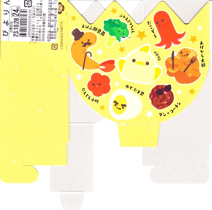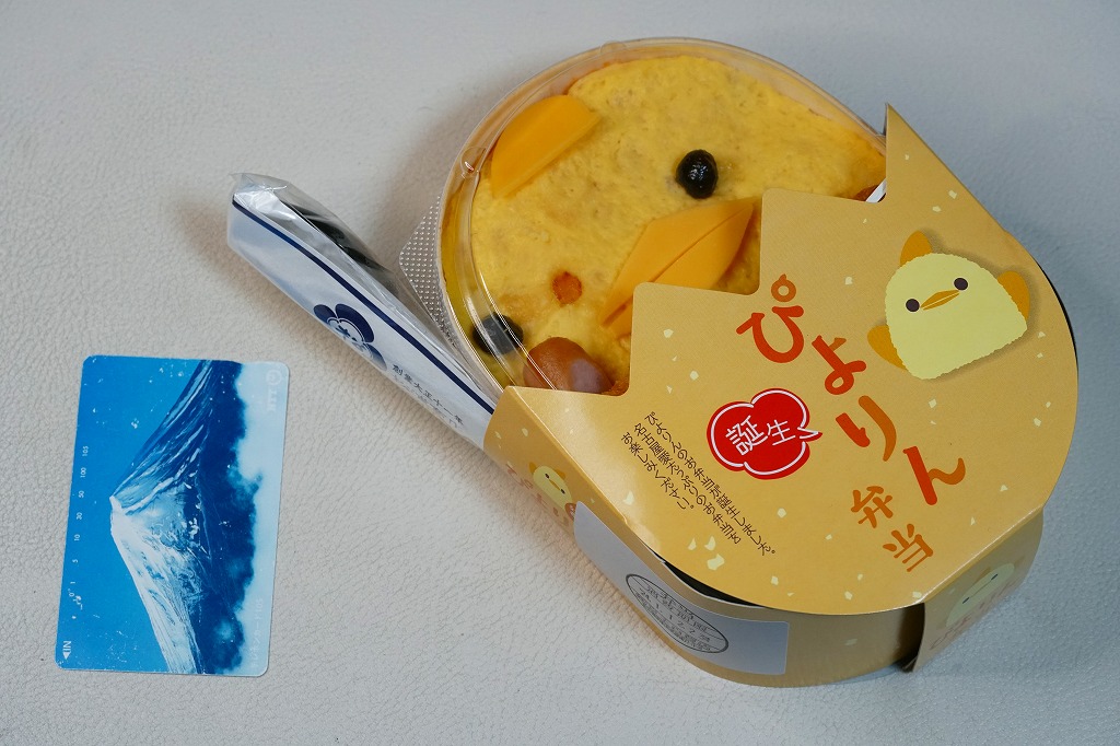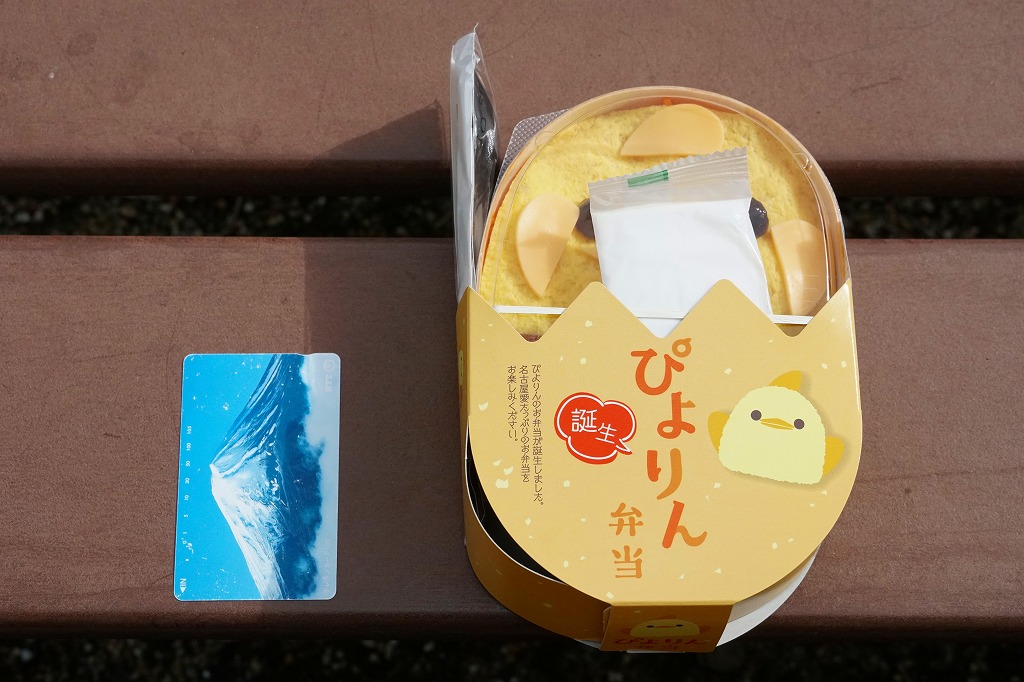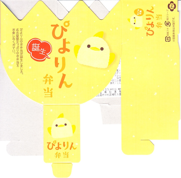 2023(令和5)年10月1日から名古屋駅の売店「グランドキヨスク」「デリカステーション」各1店舗で一日計200個を販売。名古屋駅で人気のスイーツ「ぴよりん」がテーマの駅弁で、調製元は名古屋駅弁の松浦商店。楕円形の容器は鶏卵を、この容器を半分だけ覆うスリーブは卵の殻を、そこから顔を出す中身の一部はひよこを表すのだろう。スリーブの底面では中身の食材をかわいらしく描く。