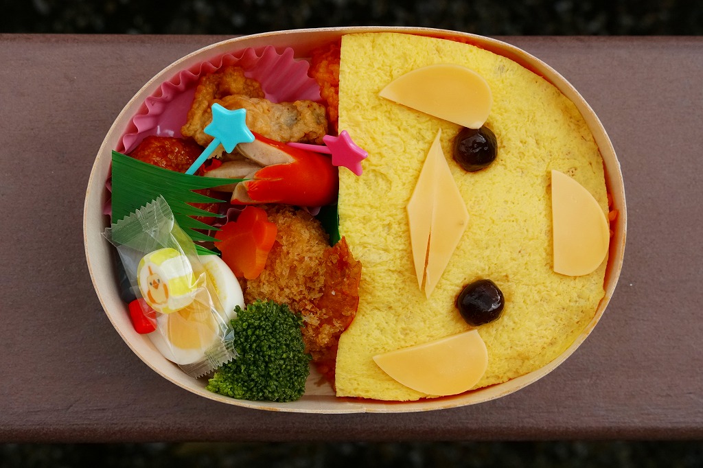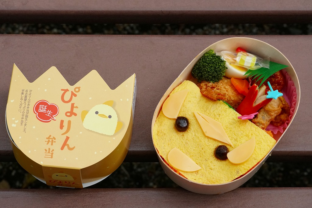 この木質容器の半分に、ケチャップライスを敷いて玉子焼で覆い、チーズとタピオカでひよこの顔を描く。半分はおかずで、名古屋コーチンの鶏唐揚と鶏肉団子とゆで卵、エビフライ、たこ型ウインナー、ブロッコリー、花型にんじん、ぴよりん柄のキャンディ。このかわいらしい鶏肉駅弁は、朝8時の名古屋駅で奪い合われていた。ぴよりん人気、恐るべし。
