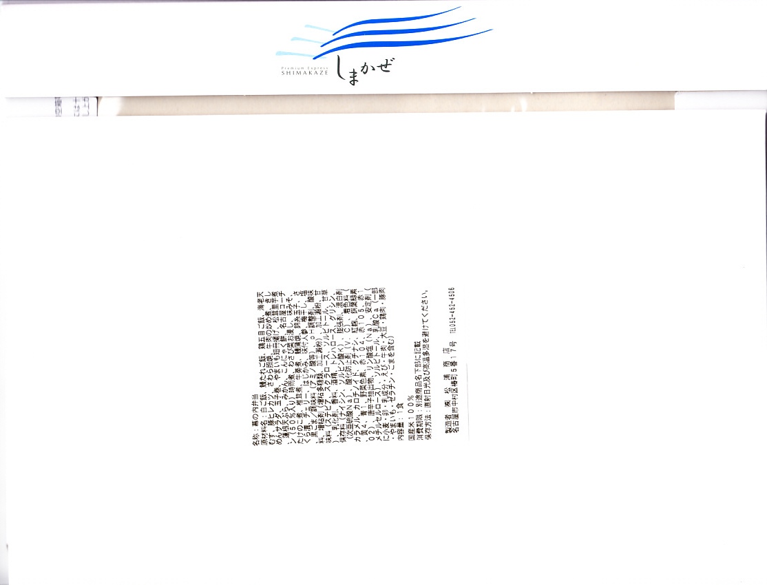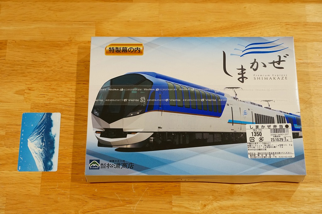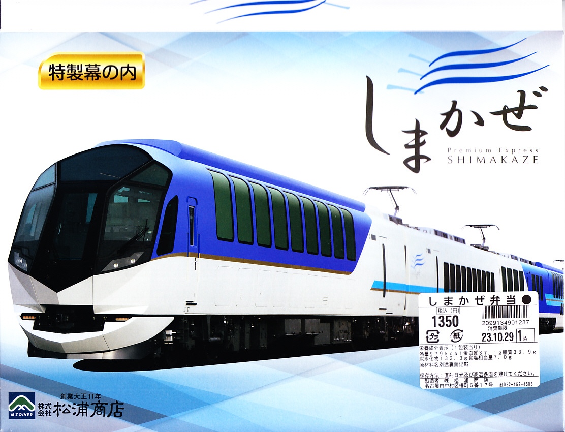 2013(平成25)年に近鉄名古屋駅で、1,200円にて発売か。2013年3月に大阪難波駅や近鉄名古屋駅と賢島駅を結ぶ特急列車でデビューした、50000系電車「しまかぜ」にちなむお弁当。発売当時の「幕の内なごや」風の容器と内容に掛紙をかけたものを、2015年にこの内容へリニューアルし、2017年に掛紙を紙箱へ改めた。駅弁の名前は、食品表示で「しまかぜ弁当」、近鉄特急しまかぜのCGを載せた専用の紙箱では「特製幕の内しまかぜ」、おしながきでは「近鉄観光特急しまかぜ弁当」と読める。大阪難波駅では2015年までに「特製幕の内しまかぜ」が神戸駅弁の淡路屋の調製となり、こちらの調製元は名古屋駅弁の松浦商店なので、名阪の駅弁屋が同じ題材で駅弁を競演する。