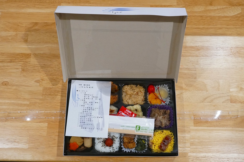 中身は12区画のなんでもまるごと弁当で、日の丸、鶏五目、うなぎ、天むすで4種類もの御飯に、きしめんサラダ、八丁味噌のヒレカツ、ヤマイモ磯辺揚とレンコン天ぷら、根菜の煮物、さわら照焼と玉子巻、牛肉しぐれ煮、名古屋コーチン入り時雨煮とわさび菜おひたし、みかんとチェリーとこんにゃく餅。主に名古屋の食を、いろいろ詰め込んだ感じで、分量の多い大型の駅弁。価格は2015年時点で1,240円、2023年時点で1,350円。