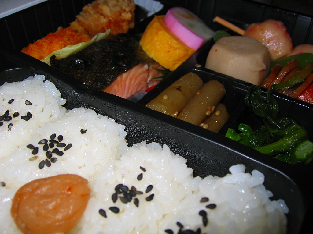 2008(平成20)年か、それ以前の発売か。仕出し弁当風の専用紙箱に収まる黒いトレーの中に、白御飯と赤飯の俵飯、焼きサバ、かまぼこ、玉子焼、カボチャやサトイモなどの煮物、山菜、うの花、インゲンのごま和え、春雨、ピーナッツ煮、桃とチェリーなど。駅弁ではまず見ないうの花(おから)が入ることが印象的。