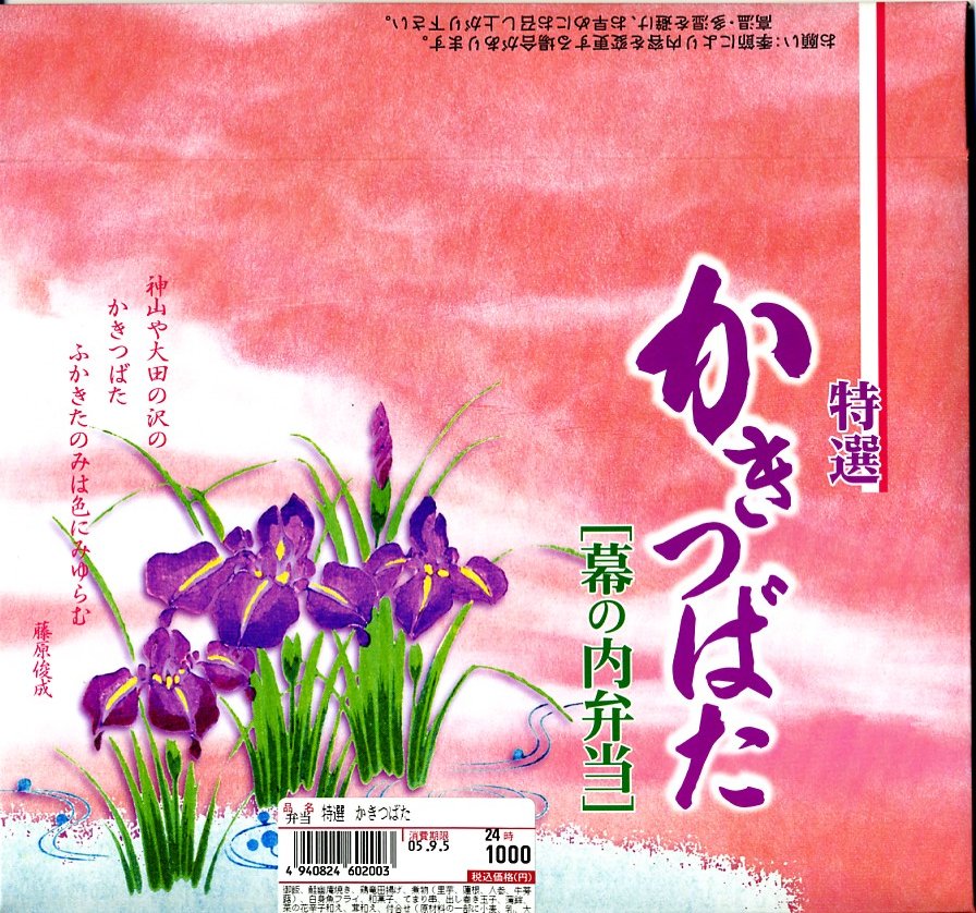 名古屋駅の無名なJRCP版上等幕の内駅弁。カキツバタの花を描いた長方形ボール紙容器を使用、中身は日の丸俵飯に焼鮭・蒲鉾・玉子焼、白身魚フライに鶏竜田揚、菜の花にゴボウにてまり串に煮物や付合せの各種など。意外と言っては失礼だが高品質な幕の内駅弁で、新幹線の車中食としても酒のつまみとしても使える出張の友。現存しない模様。