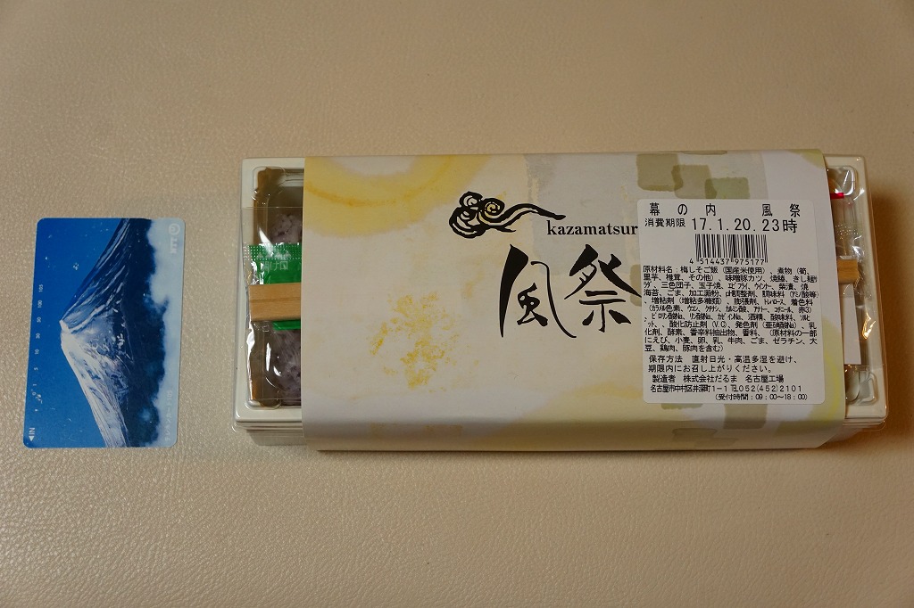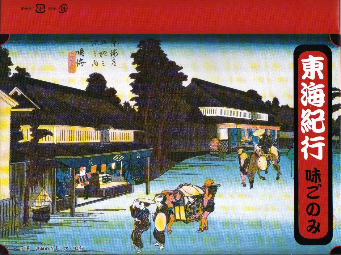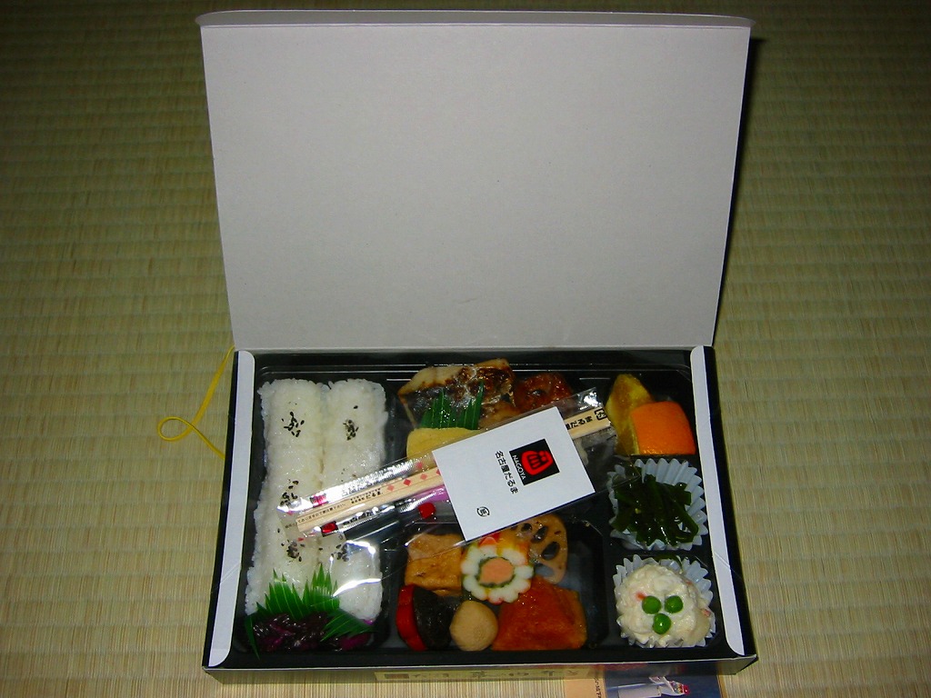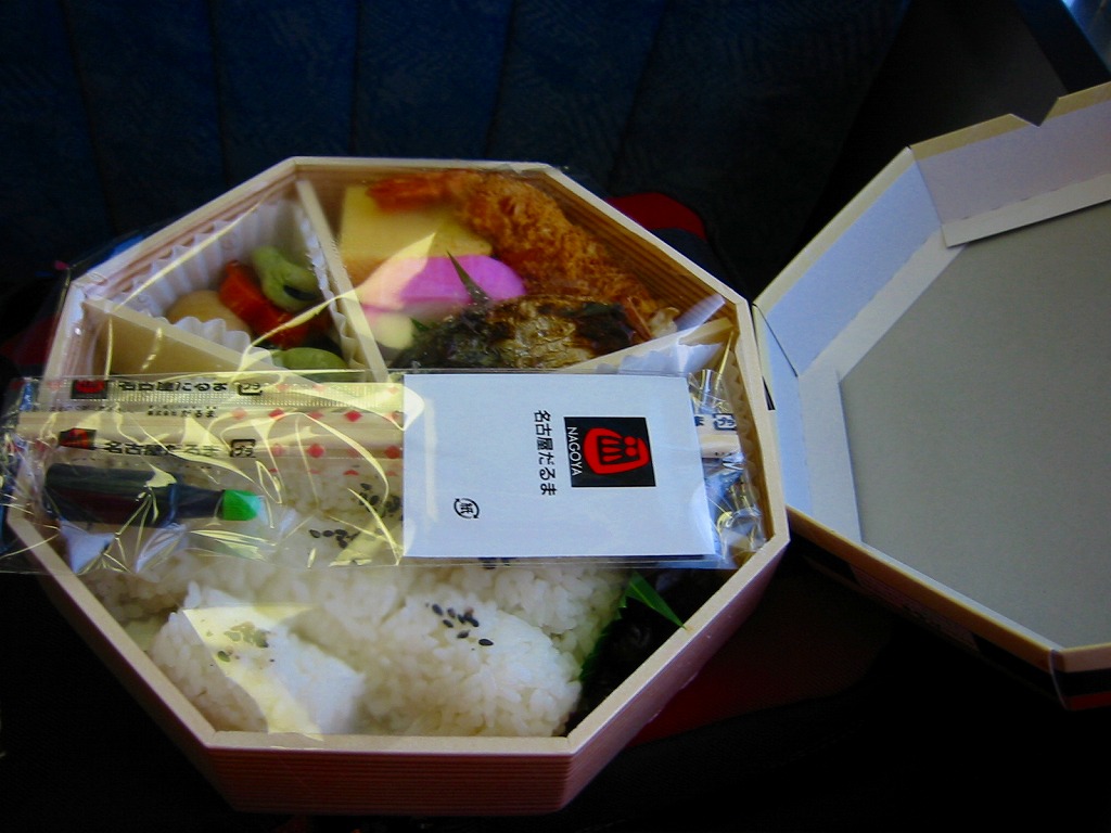 名古屋駅の幕の内弁当の、JRCP版。広重「東海道五十三次」鳴海の絵を描いた紙箱に黒いトレーを入れて、食品表示のシールで封をする。中身は幕の内駅弁なので俵飯に各種のおかずという構成なのだが、そのおかずが骨付鶏、さざえ壺焼、エビフライ、鰻蒲焼とけっこう豪華でデザートにういろうも付いており、それでいて大都市駅の幕の内駅弁なのに千円を切る価格が付けられている。2004年頃までの販売か。