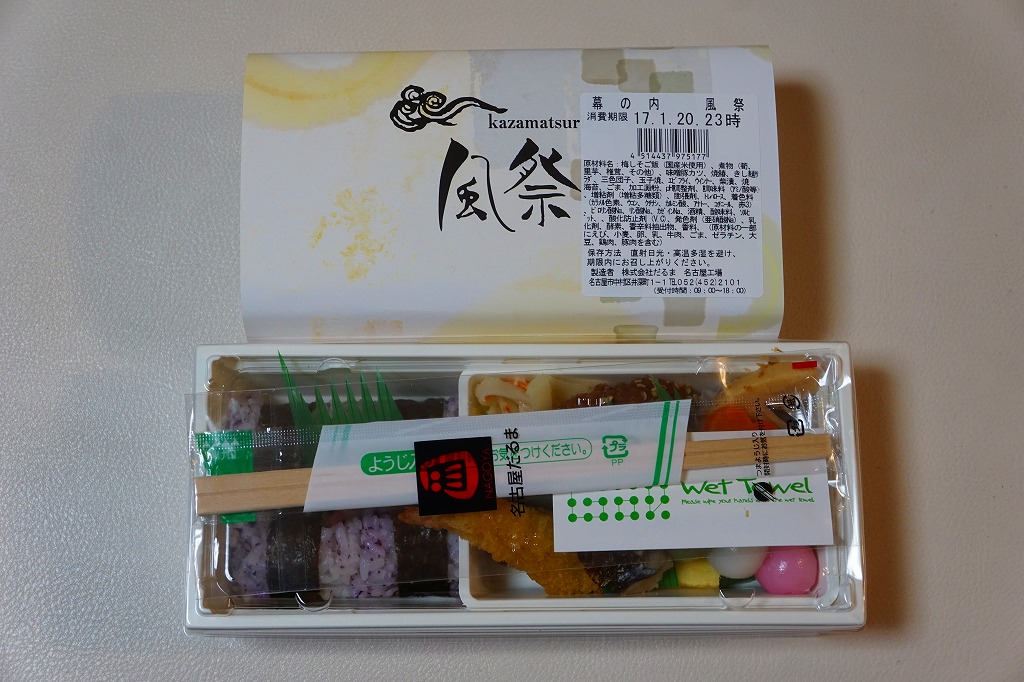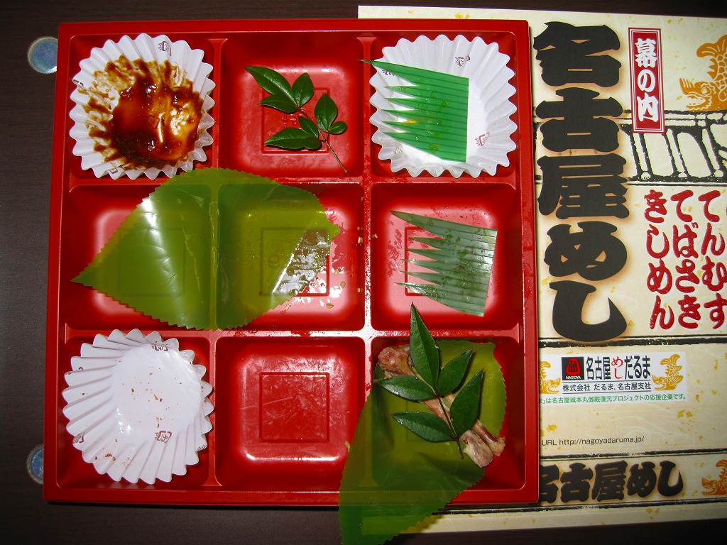 名古屋駅の幕の内弁当のだるま版。市販の仕出し弁当向け容器と同じく、ボール紙の箱にプラ製トレーを収める構造を持つが、黒と華でできた箱の絵柄に高級感があり、真っ黒なプラ製トレーもこれにリンクする。中身は正に幕の内駅弁。俵飯に鰆の焼き魚と身厚な蒲鉾と金色の玉子焼、海老焼売に鶏照焼に帆立や各種煮物、ポテトフライに茎わかめにデザートにはオレンジという内容で、地域色はないが実力のある駅弁。名古屋の駅弁にはみそカツや鶏の他にも具の種類が多いという特徴があるので、その点では名古屋を表現しているか。現存しない模様。