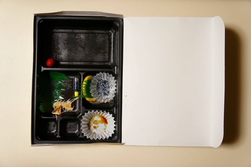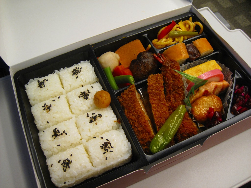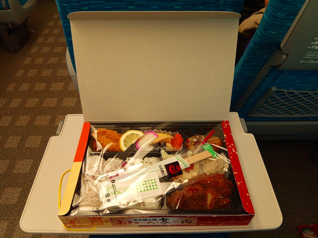 2011(平成23)年の発売か。商品名とお品書きと名古屋駅ビルを描いたボール紙製パッケージには、日の丸俵飯を収めた黒いプラ製トレーと、ソース味のチキンカツとエビフライ、鮭西京焼と玉子焼とかまぼことつくね、シイタケやカボチャなどの煮物、あんかけ風パスタ、小倉サンド風ドッグ、柴漬けなどを収めた黒いプラ製トレーが入る。JRCPっぽい東京風の素っ気なさを見せながら、個性をさらりと突っ込んで名古屋らしさに染め上げた、幕の内タイプの駅弁。価格は購入時で900円、2014年4月の消費税率改定で930円。2015年までの販売か。
