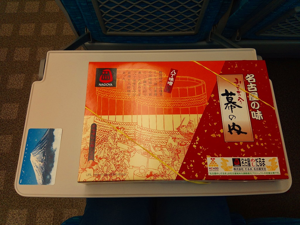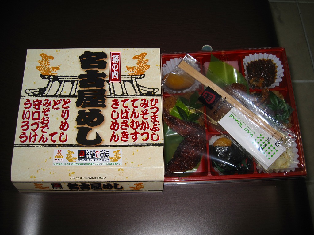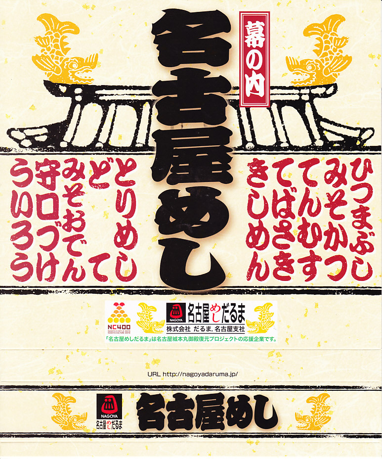 2007(平成19)年6月の新作だそうな。9区画の正方形のプラ製容器を、中身と駅弁の名前を賑やかに描いたボール紙の枠にはめる。中身はひつまぶしことウナギの小片を載せたタレ御飯と、錦糸卵を載せたとりめし、天むす、みそかつ、手羽先、きしめんサラダ、みそおでんこと煮玉子、どて、ういろう、守口漬。これのどこが「幕の内」なのかと思うが、見た目で確かな名古屋ないし愛知。よそ者には厳しい味や食べ方についても容赦ない。2013年頃までの販売か。