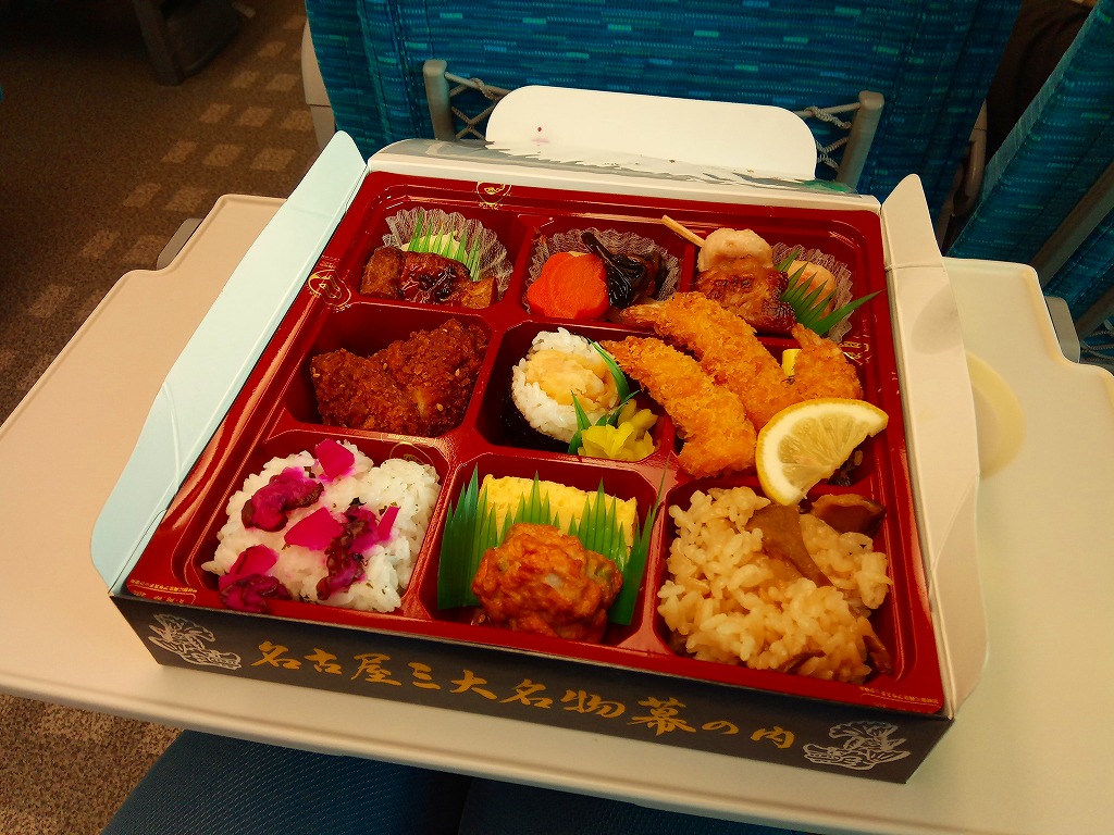 2008(平成20)年の発売か。路線を省略する度合いが不思議な鉄道路線図と、名古屋城やテレビ塔などを描いたボール紙のパッケージを使用。黒いプラ製トレーに収めた中身は、日の丸俵飯、サケ焼とかまぼこと玉子焼、白身魚フライ、しゅうまい、焼き鳥、牛しぐれ煮、ちくわ天、金時豆など。中身はその内容も姿も分量も、幕の内駅弁の定番と基本を押さえながら、少しだけ愛知県してる。価格は2012年の購入時で680円、2015年時点で756円、2016年時点で700円、2023年時点で750円。2023年までの販売か。