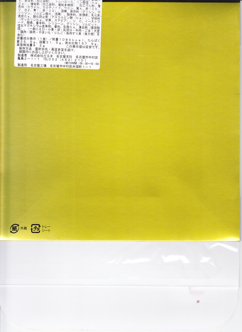 2014(平成26)年にナゴヤドームのお弁当として発売か。駅での販売は翌2015(平成27)年からか。幕の内弁当らしくなく9区画に仕切る中身は、金色に輝く専用紙箱に書かれた「みそかつ」「天むす」「えびふらい」ときしめんサラダに、きのこ御飯、わかめ御飯とはりはり漬、とんてきとポテトサラダ、昆布やタケノコなどの煮物、玉子焼と蓮根枝豆揚、練り物の串と照り焼きチキン。内容でも幕の内っぽさが皆無な、とても賑やかな駅弁。価格は2020年の購入時で1,200円、2024年時点で1,300円。だるまの名古屋駅弁は、2024年9月頃にJR名古屋駅での販売を終了か。