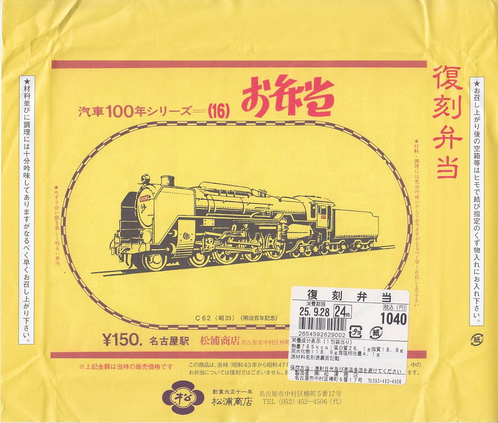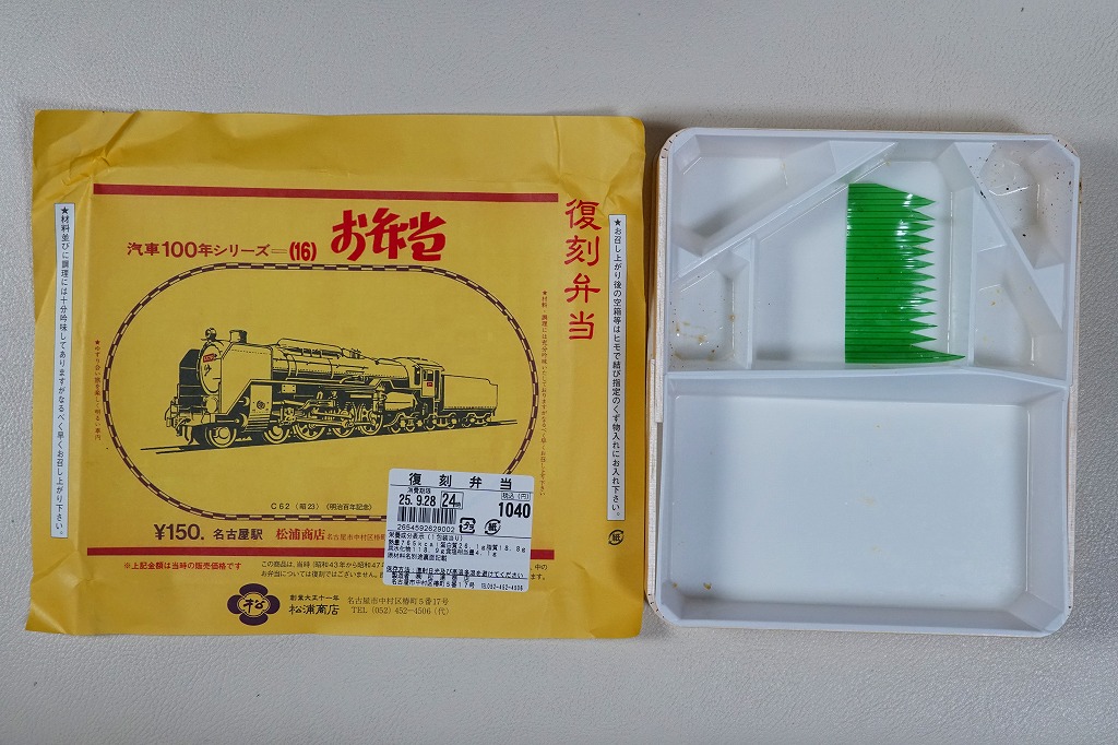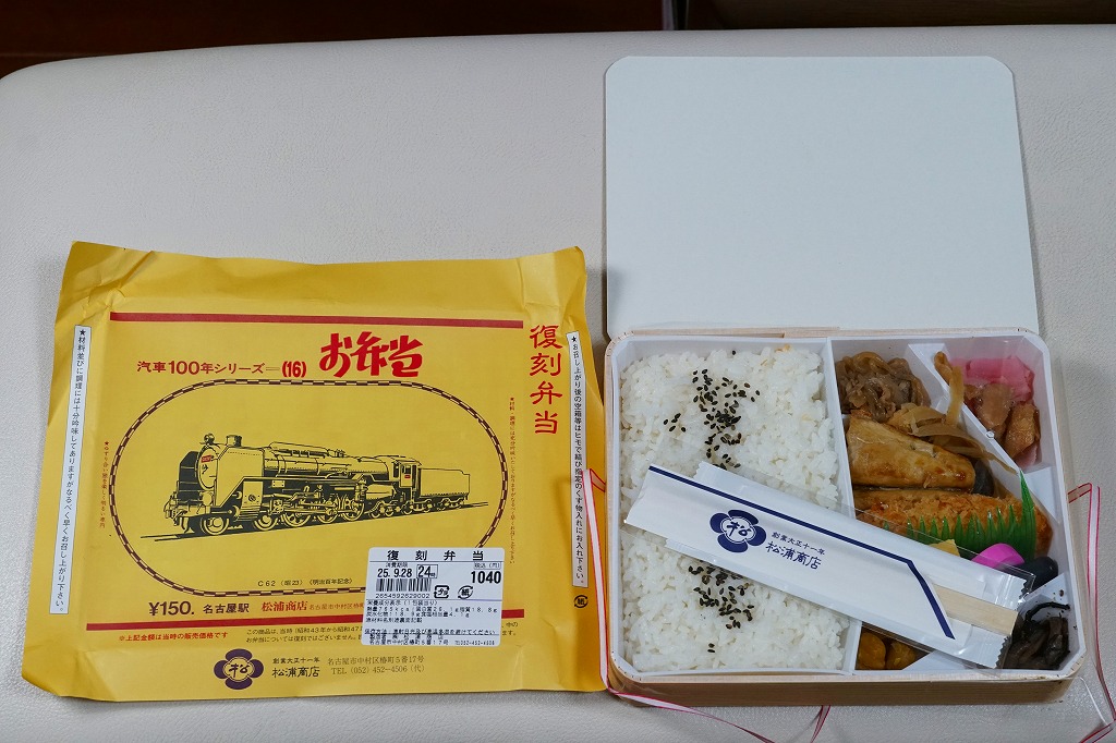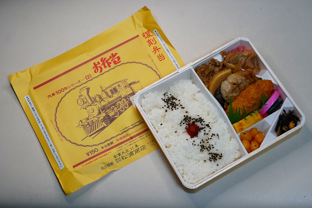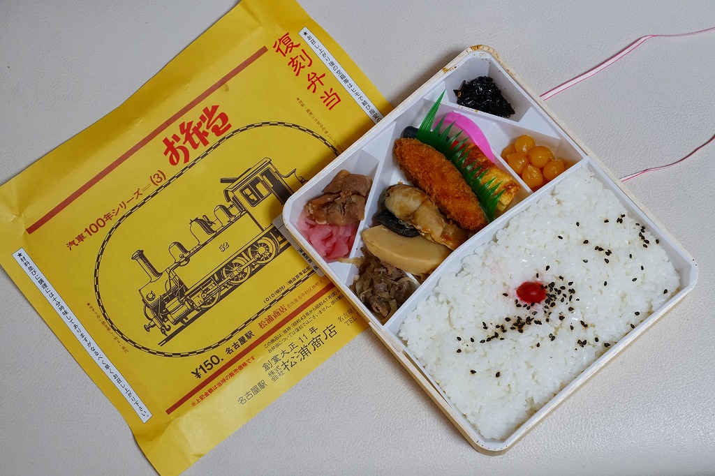 2007(平成19)年9月に、名古屋駅の新幹線改札外にあった駅弁実演販売コーナーで発売。掛紙は昔の名古屋駅弁のものを使用、発売時は「大正11年創業当時の掛紙」「昭和の御大典の掛紙」「時刻改正の掛紙」「国際観光年(1967年)の掛紙」を日替わりで使用した。2017年頃から、1972年の名古屋駅弁で使われた汽車100年シリーズの掛紙20種類のうちどれかが使われる模様。今回はその16番目の、国有鉄道C62形式蒸気機関車のバージョンで売られていた。