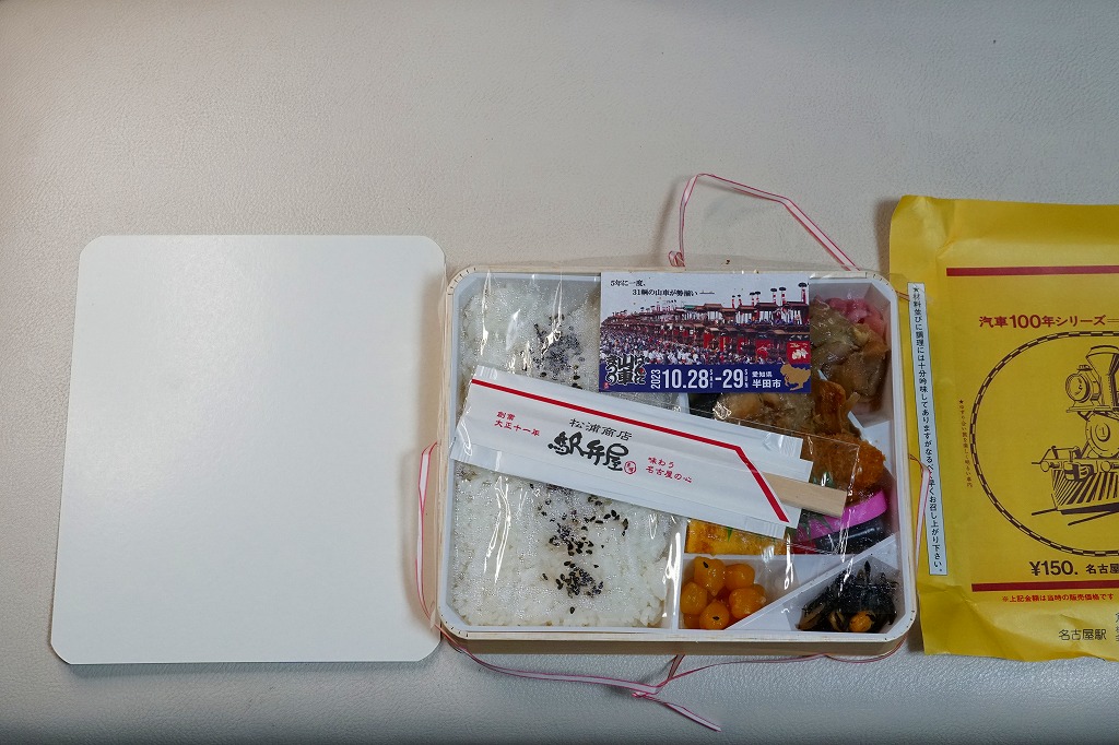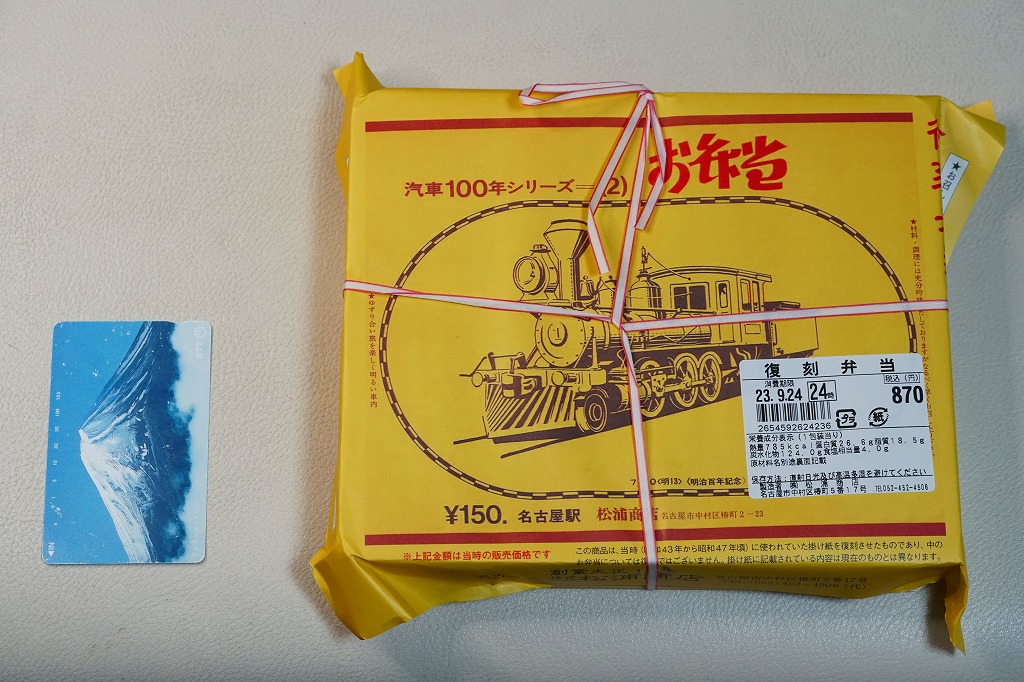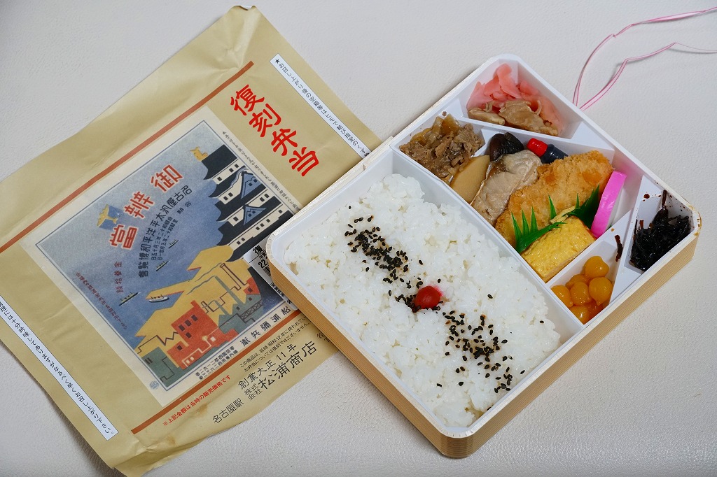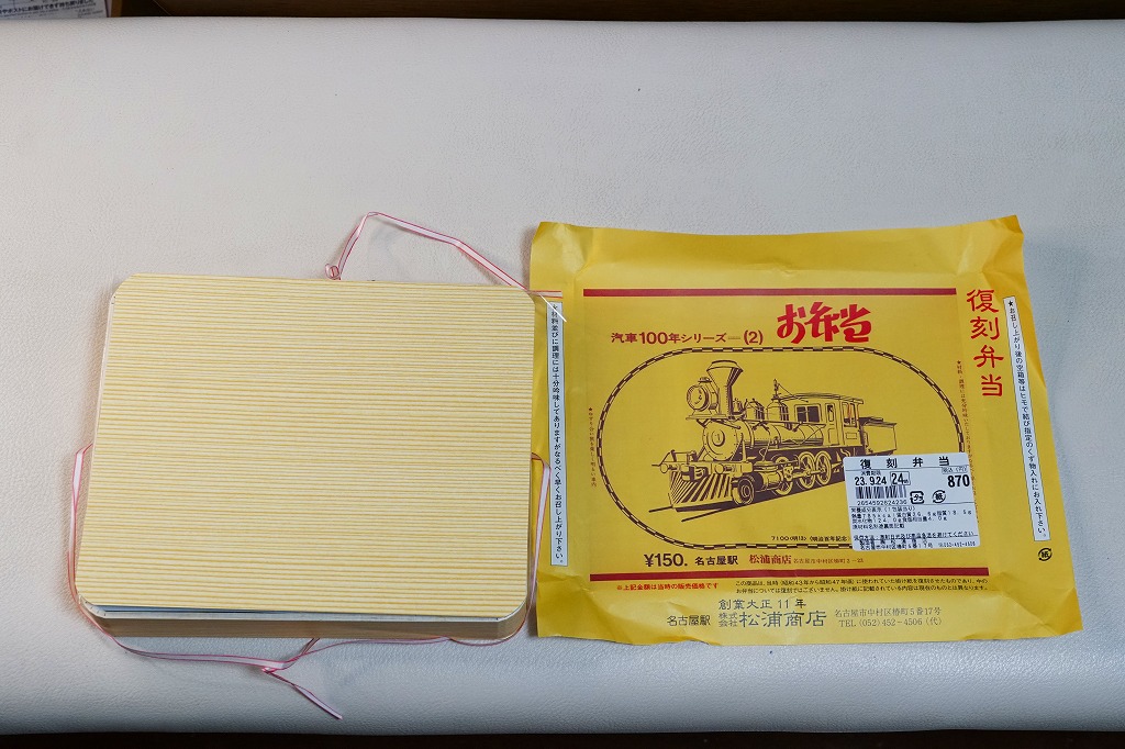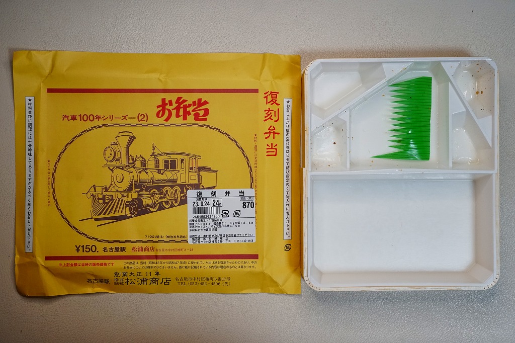 2007(平成19)年9月に、名古屋駅の新幹線改札外にあった駅弁実演販売コーナーで発売。掛紙は昔の名古屋駅弁のものを使用、発売時は「大正11年創業当時の掛紙」「昭和の御大典の掛紙」「時刻改正の掛紙」「国際観光年(1967年)の掛紙」を日替わりで使用した。2017年頃から、1972年の名古屋駅弁で使われた汽車100年シリーズの掛紙20種類のうちどれかが使われる模様。今回はその16番目の、国有鉄道C62形式蒸気機関車のバージョンで売られていた。