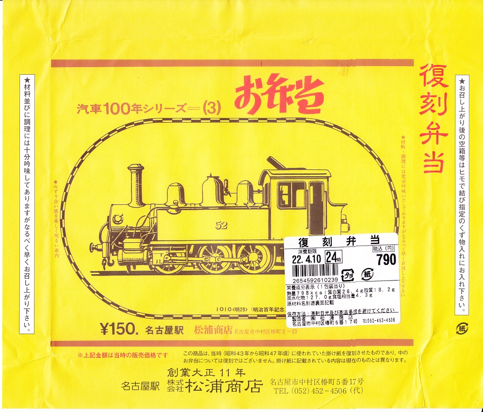 2022(令和4)年4月10日に購入した、名古屋駅弁の掛紙。今回は「汽車100年シリーズ=(3)」として、国有鉄道1010形式蒸気機関車の側面図を描いた。1010形なのに「52」と描かれるのは、私鉄の山陽鉄道が1896(明治29)年にアメリカから輸入した際に11形52号機とし、1906(明治39)年の国有化で1909(明治42)年に1010形1011号機に番号を振り直す前の姿か、その写真を参考に描いたものか。この名古屋駅弁はこの時点で、JR東海の新幹線や東海道本線の駅のキヨスクやコンビニ「ベルマート」で手広く売られており、今回は名古屋から遠く三島駅で買った。