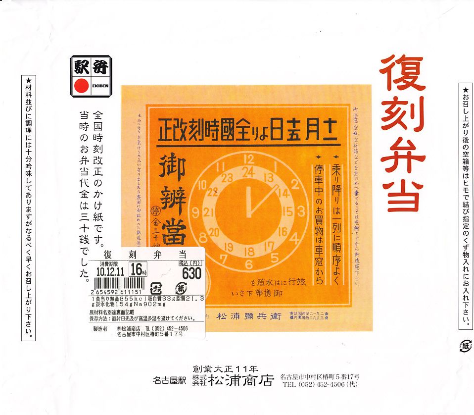 2010(平成22)年12月11日に購入した、名古屋駅弁の掛紙。中身は上記の2021年のものと同じ。当時に4種類が日替わりで使われたという掛紙は、この時は「時刻改正の掛紙」に該当。そのデザインから、時刻表の表記が午前午後の12時制から現在の24時制に変わった1942(昭和17)年11月15日のダイヤ改正のものではないかと思う。