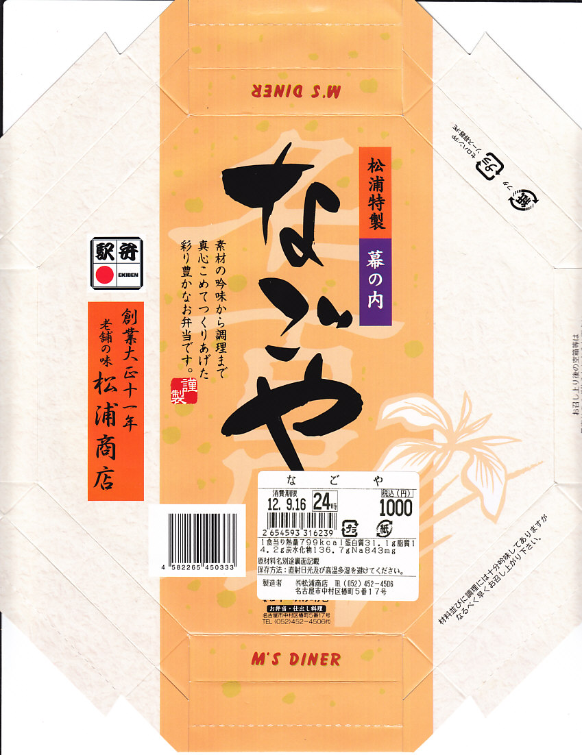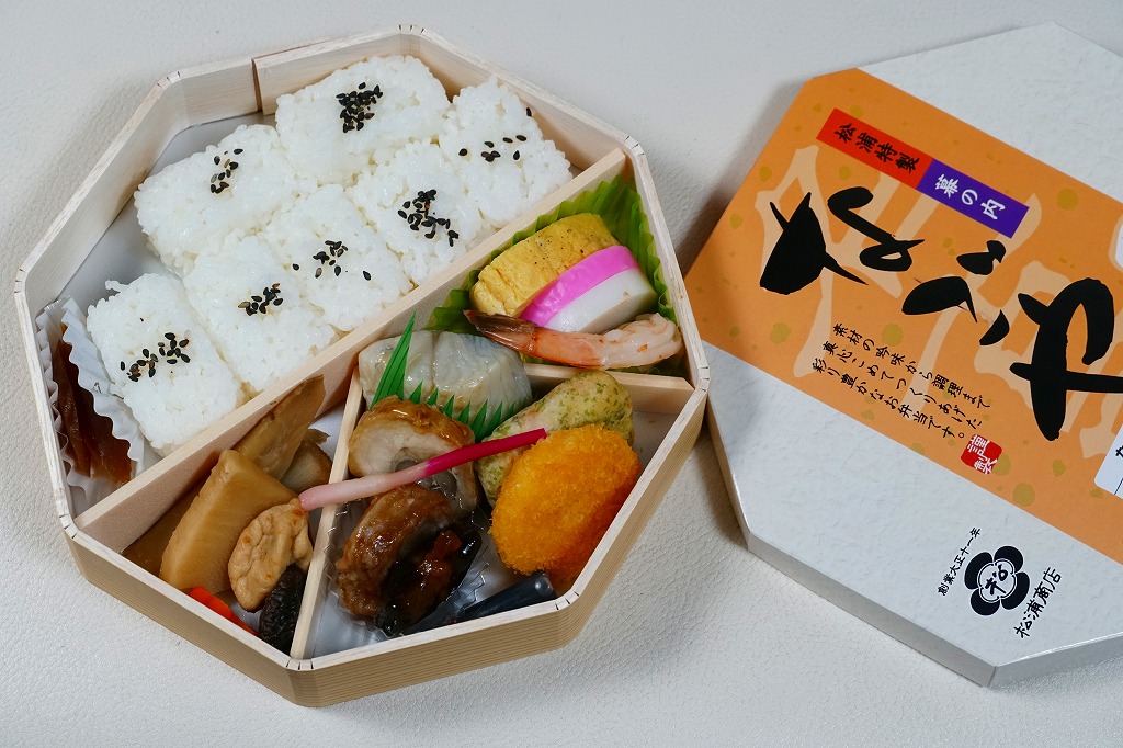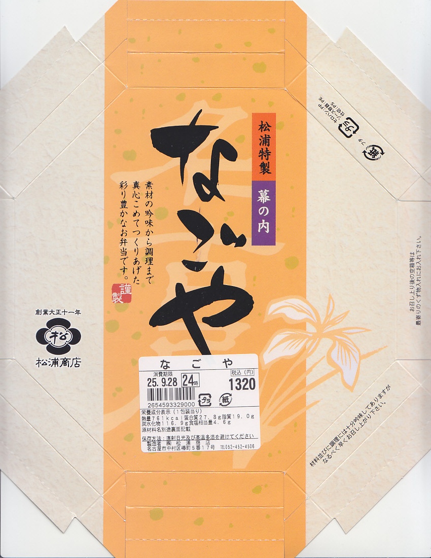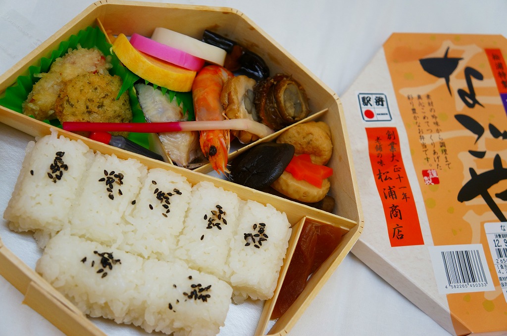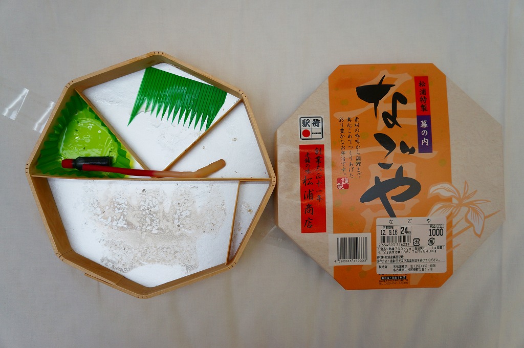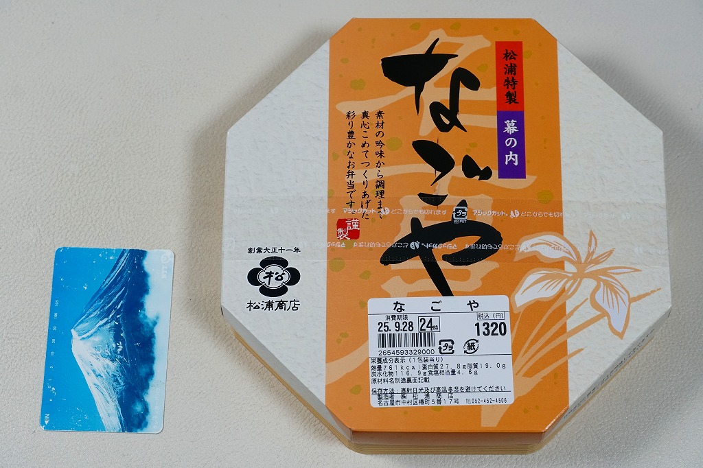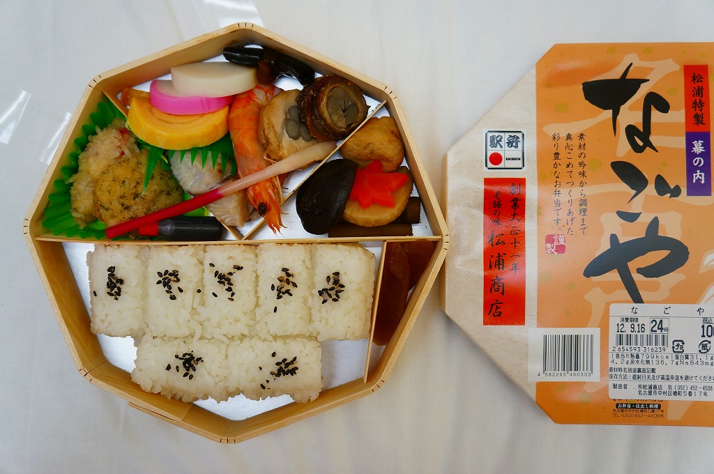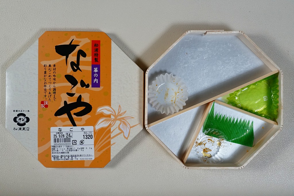駅弁の名前は単に「なごや」とも。名古屋駅の幕の内弁当の、松浦商店版。正八角形の容器の半分に俵飯を、半分におかずとして、タケノコやシイタケなどの煮物、玉子焼に紅白のかまぼこと海老、焼きサバにチキンロール、アナゴ八幡巻にカニカマフライに磯扇フライなどを詰める。名古屋の濃い目の味付けで白いご飯が進む内容で構成したという、眺めて食べて美しい正統派の幕の内駅弁。「幕の内こだま」がカジュアルならば、こちらはフォーマル。価格は2012年の購入時で1,000円、2014年4月の消費税率改定で1,030円、2016年時点で1,050円、2022年時点で1,080円、2023年時点で1,150円、2024年時点で1,190円、2025年時点で1,240円、9月の購入時で1,320円、12月時点で1,380円。