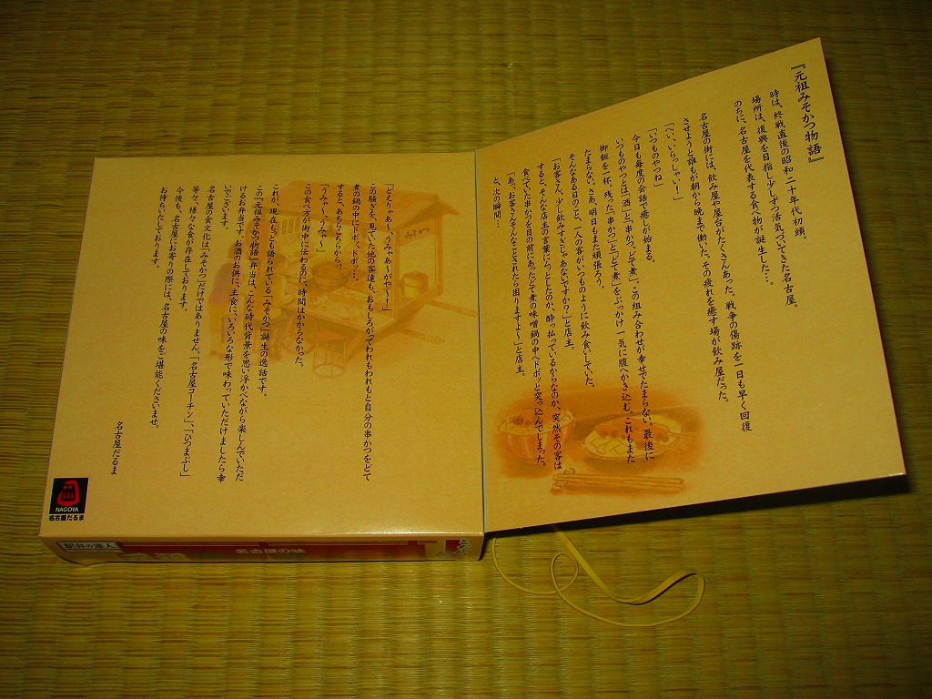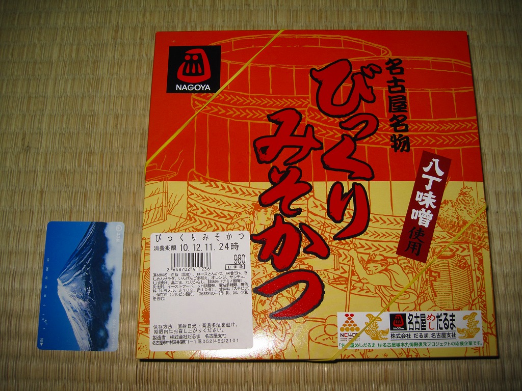 名古屋駅弁「びっくりみそかつ」の縮小版。パッケージのデザインや中身を変えないまま、御飯を少なくみそかつを小さく、それに従い容器の大きさもやや小さくなり、価格を約7割に抑えた。それでも見栄えと味の重さは同じように確保され、やっぱり十分に胃に重たい。この駅弁業者が使用する袋にもでかでかと「びっくりみそかつ」の名が記されるということは、このシリーズが最も売れていたのだろう。2004年頃までの販売か。