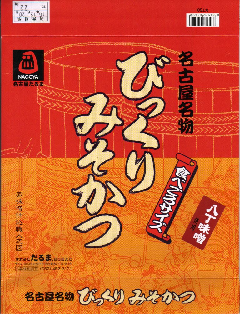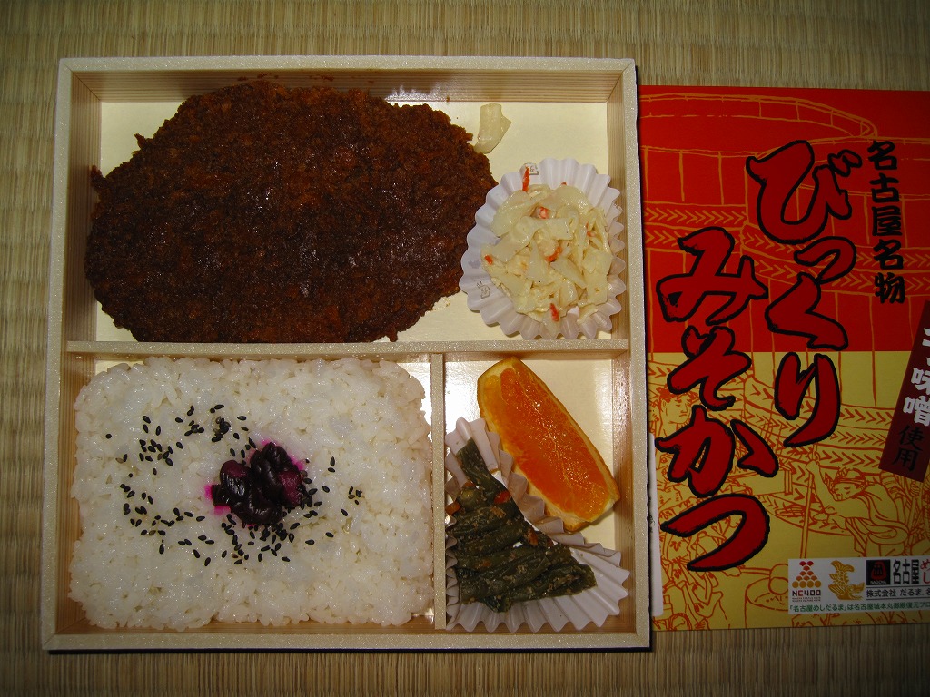 東海道・山陽新幹線「700系のぞみ」の運転開始に合わせ、1999(平成11)年4月に発売か。2000年代は名古屋駅弁で筆頭格の存在だった。正方形の容器に、八丁味噌の製造風景を背景に駅弁の名前を書いたボール紙でふたをして、割りばしに加えてプラスティックのナイフとフォークを添付する。中身は梅干しでなく柴漬けを据えた日の丸御飯に、きしめんサラダ、いんげんごま和え、オレンジ、そして赤黒く「びっくり」するほど大きく、それでいて極端に薄くもない「みそかつ」が置かれるもの。価格は2010年の購入時で980円、2014年時点で1,090円、2015年時点で1,166円、2017年時点で1,188円を経て1,010円、2020年時点で1,100円、2023年時点で1,200円。
