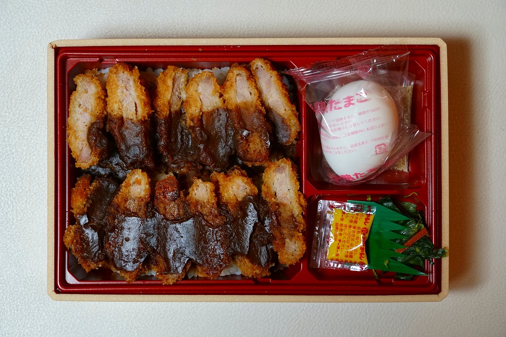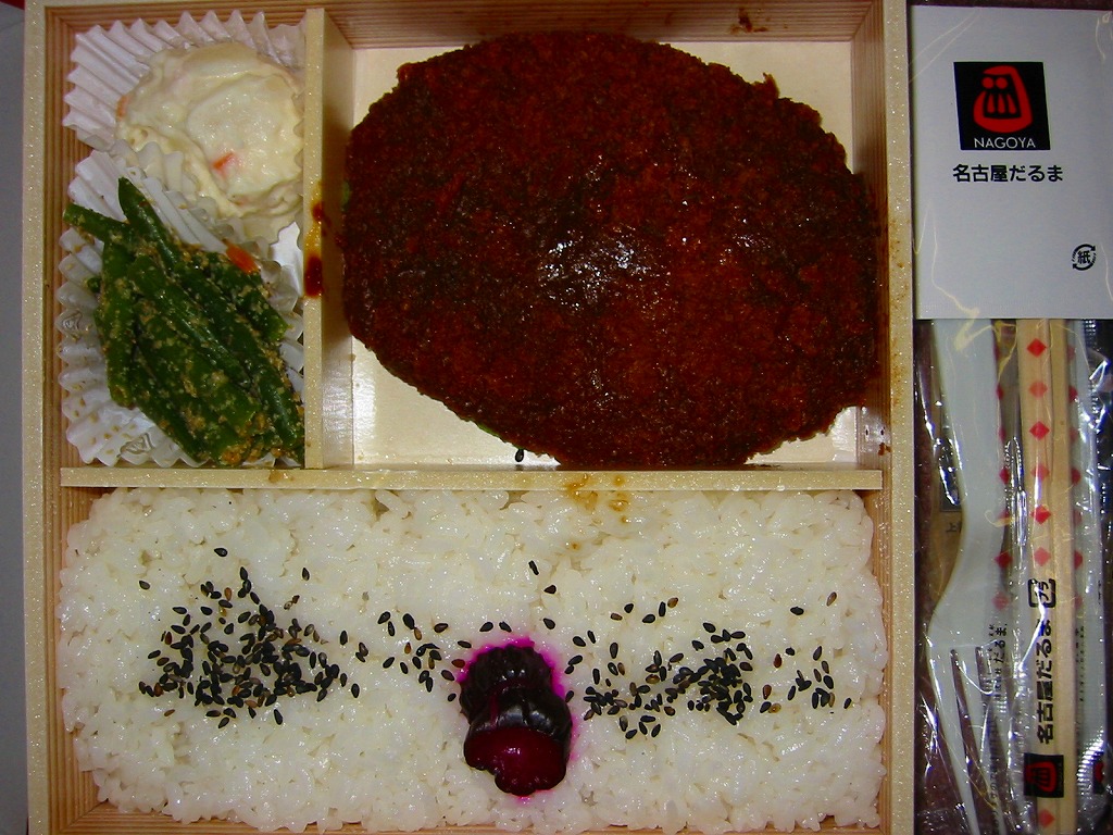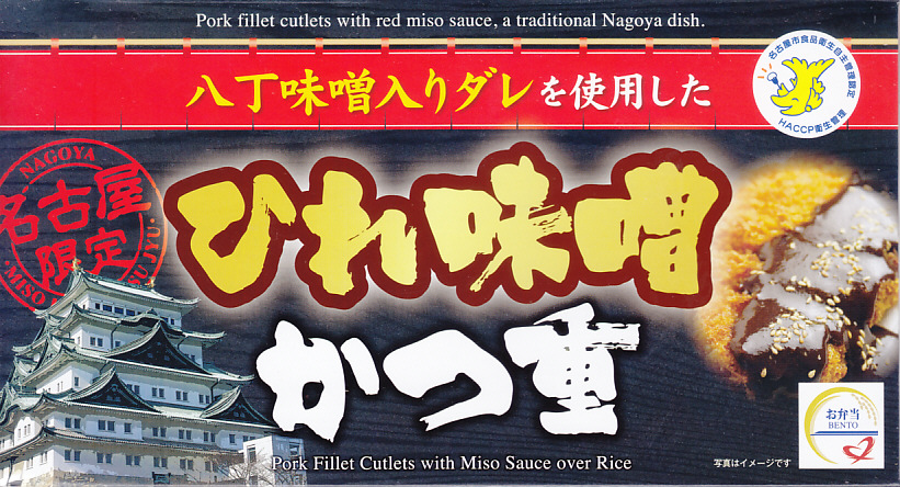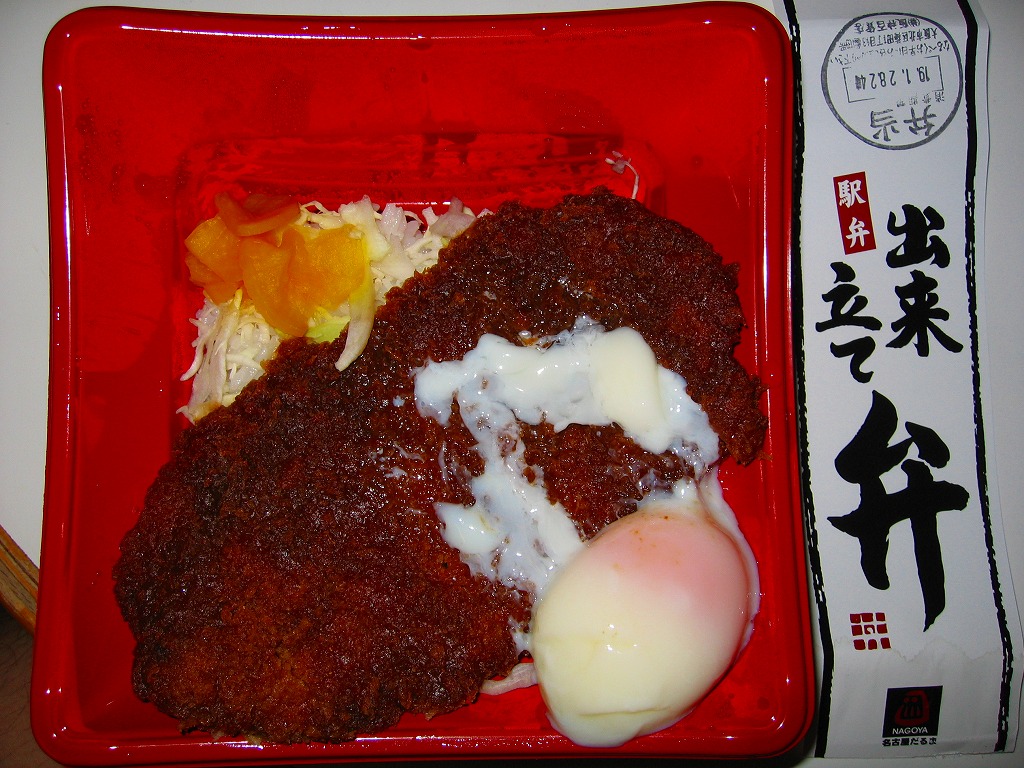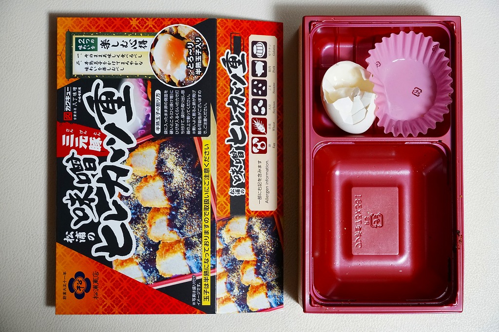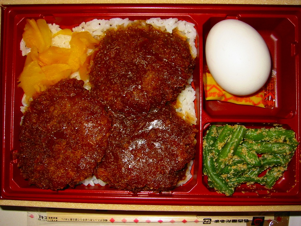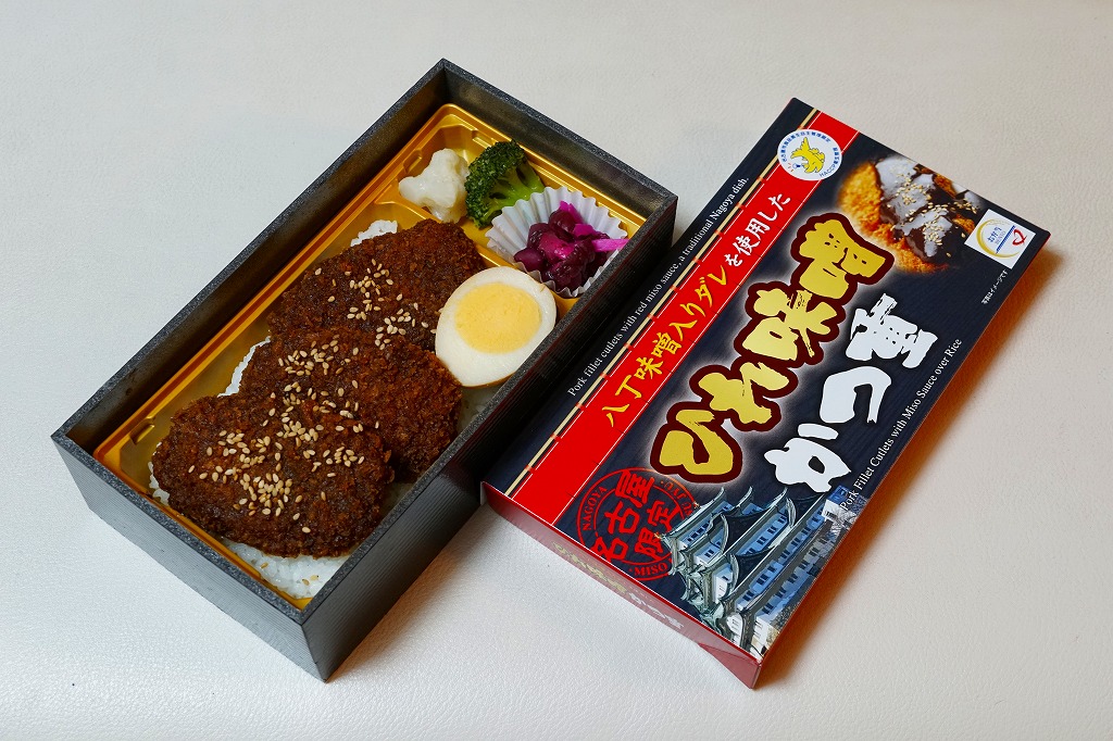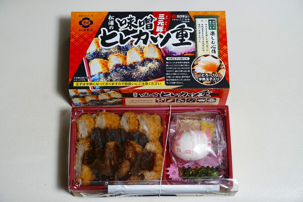 2002(平成14)年頃に発売か。赤いトレーを入れた長方形の容器に透明なふたをかけてボール紙の枠にはめる。中身は白御飯の上に八丁味噌のタレにどっぷり漬けたヒレカツを3個載せて、インゲン胡麻和えとともに半熟卵をひとつ添えている。