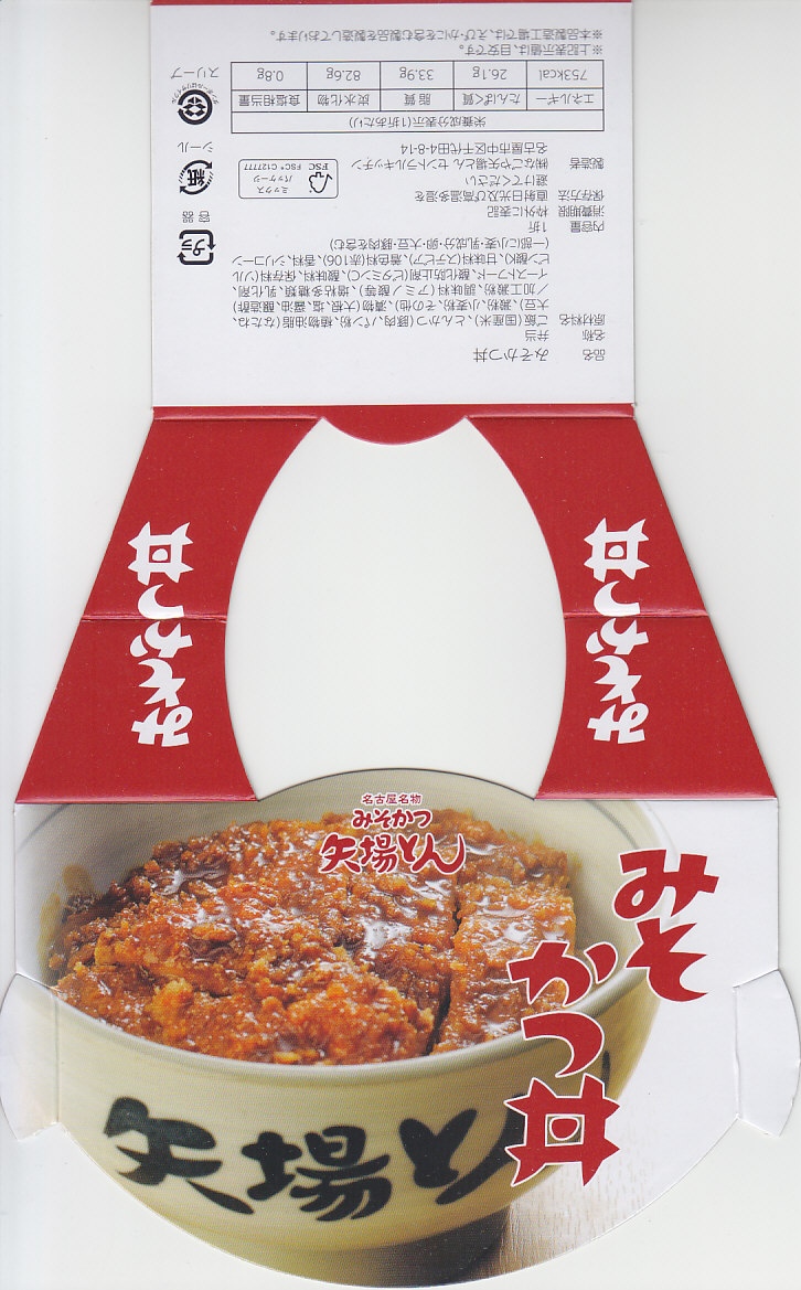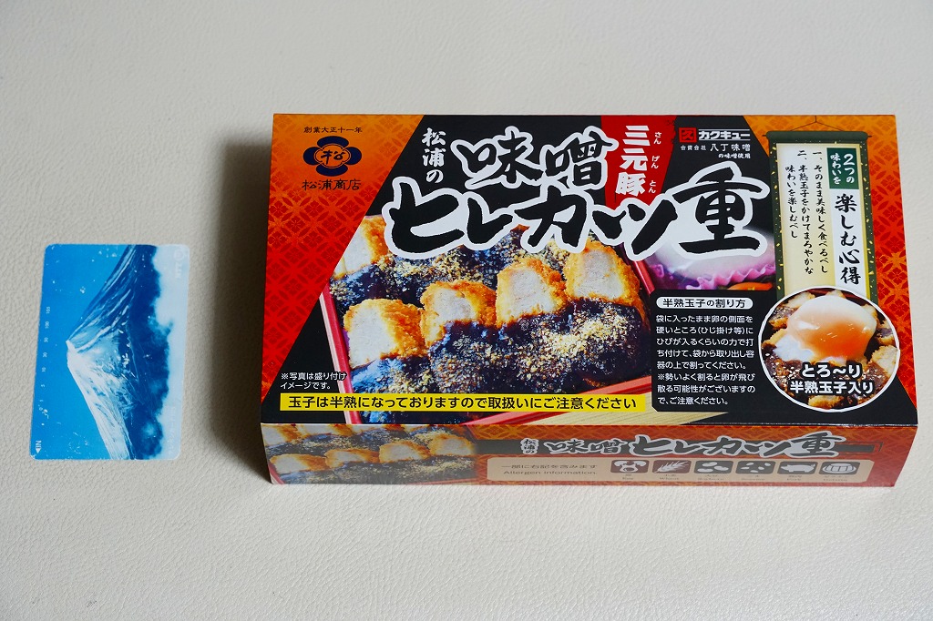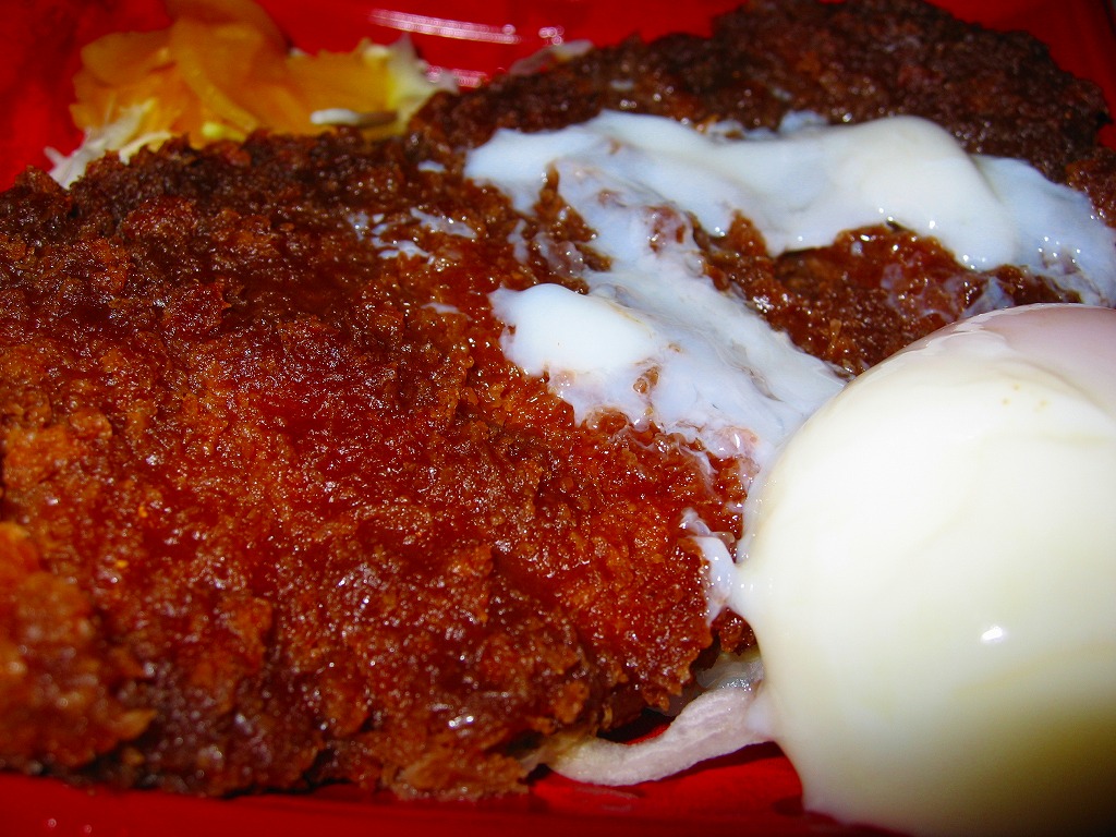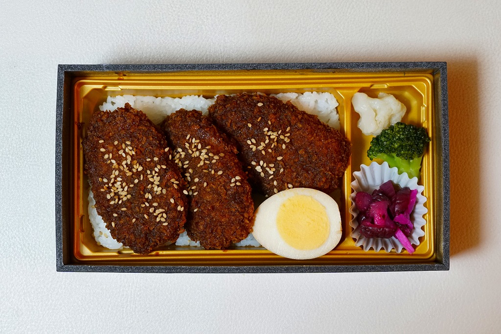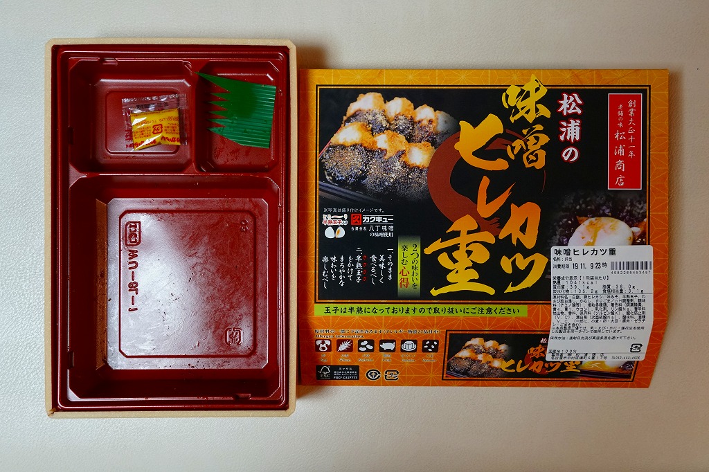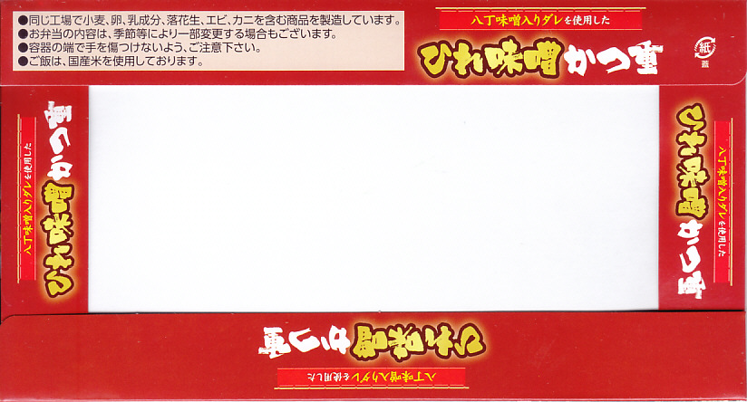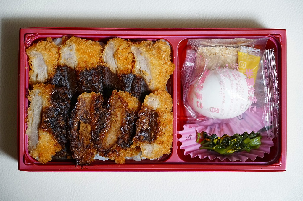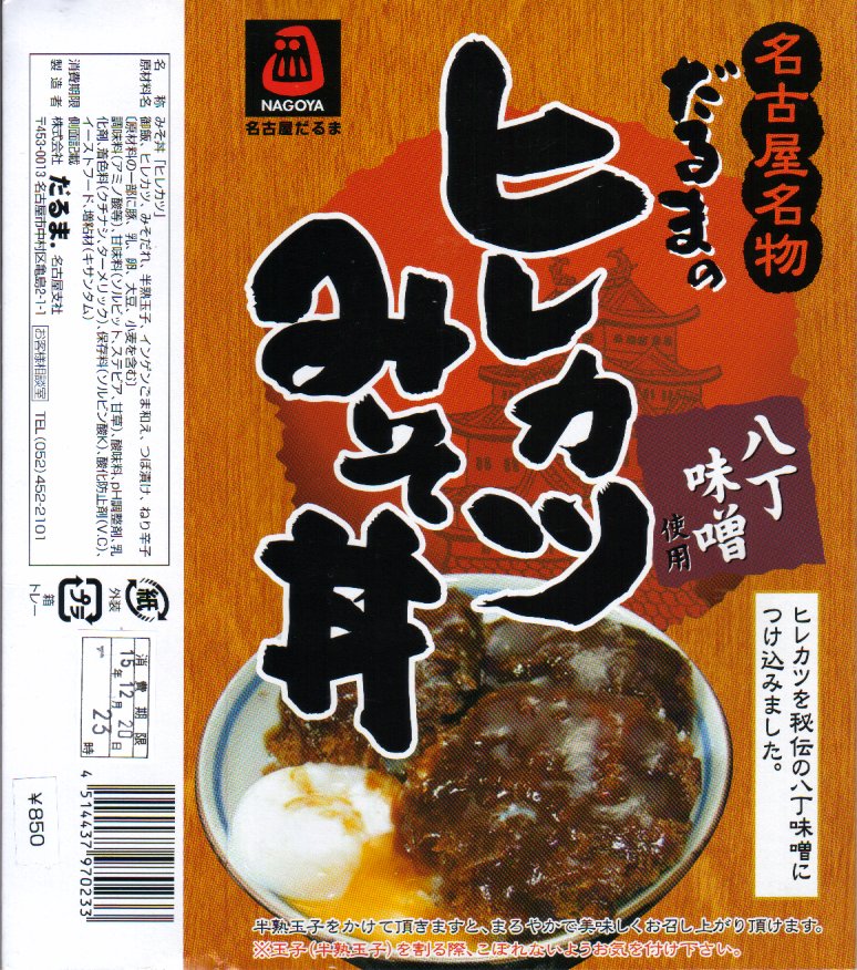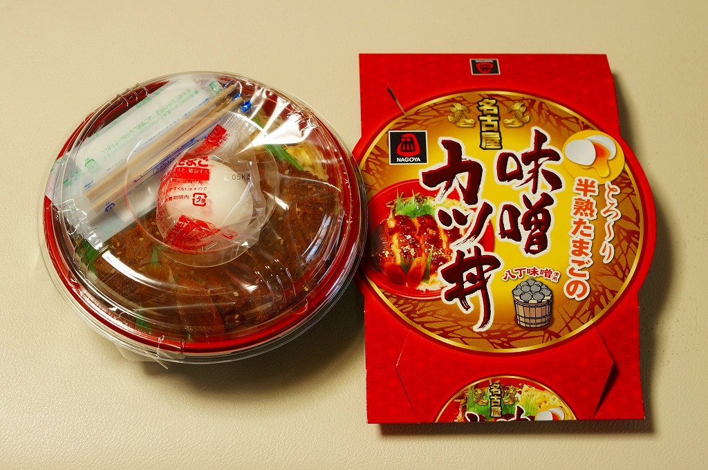 2002(平成14)年頃に発売か。赤いトレーを入れた長方形の容器に透明なふたをかけてボール紙の枠にはめる。中身は白御飯の上に八丁味噌のタレにどっぷり漬けたヒレカツを3個載せて、インゲン胡麻和えとともに半熟卵をひとつ添えている。