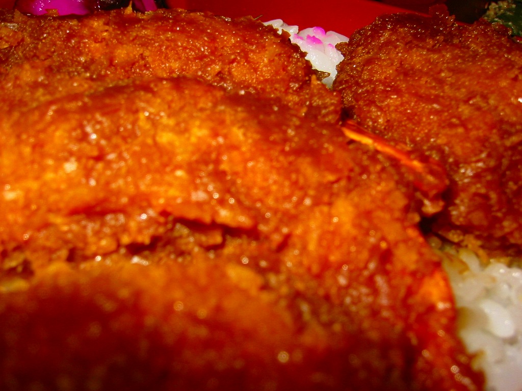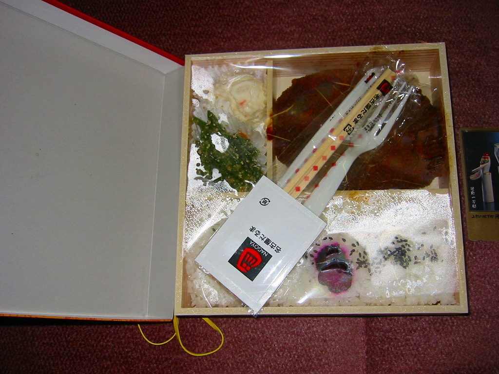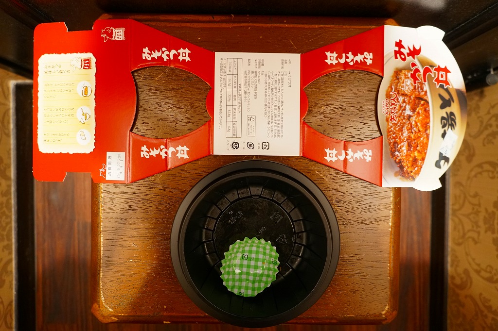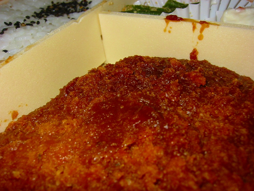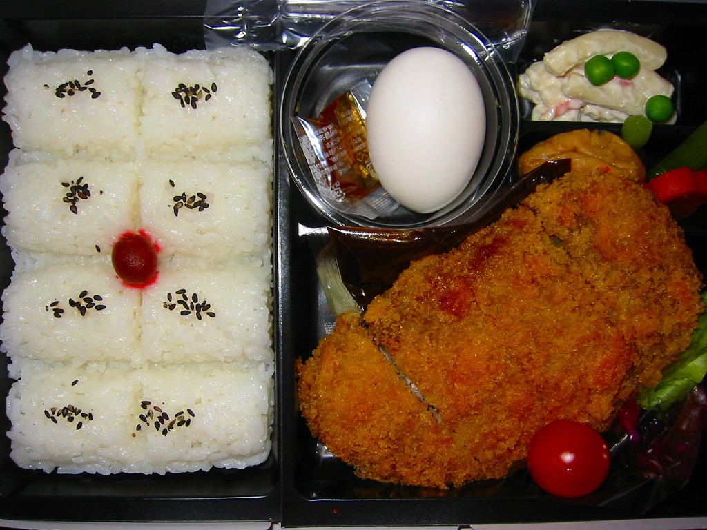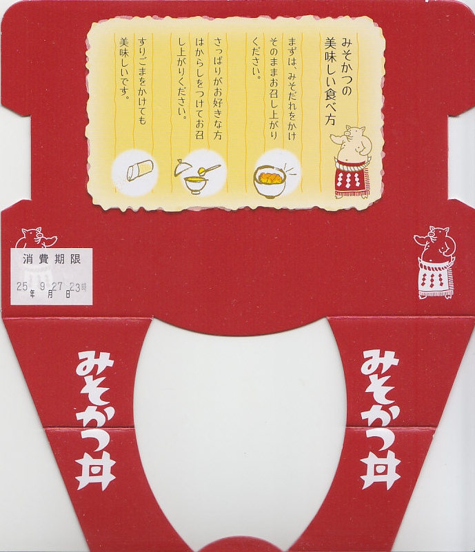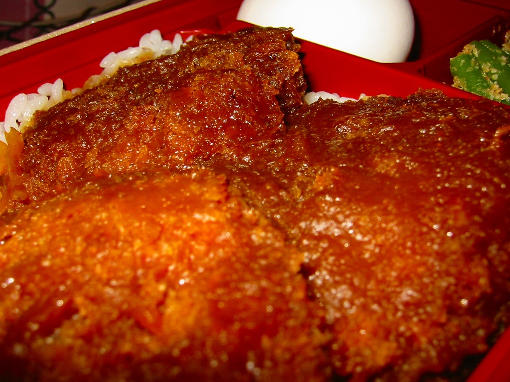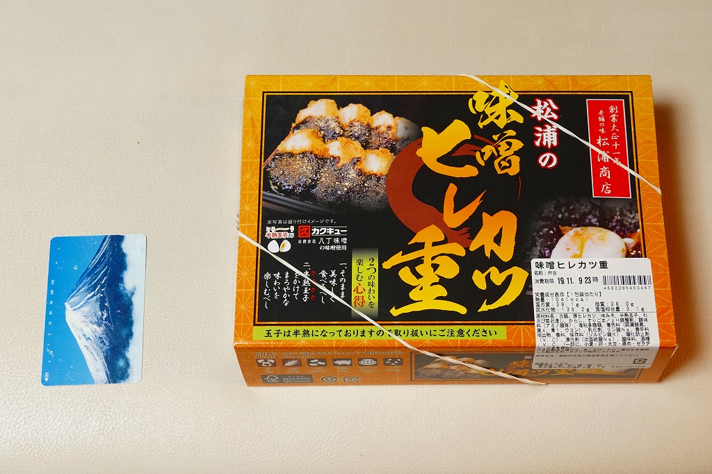 2002(平成14)年頃に発売か。赤いトレーを入れた長方形の容器に透明なふたをかけてボール紙の枠にはめる。中身は白御飯の上に八丁味噌のタレにどっぷり漬けたヒレカツを3個載せて、インゲン胡麻和えとともに半熟卵をひとつ添えている。
