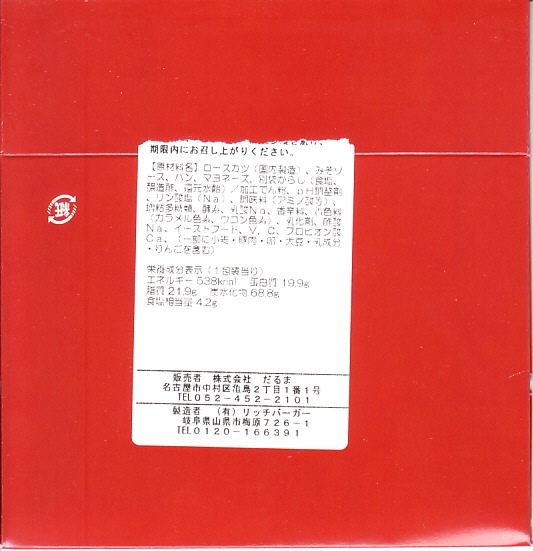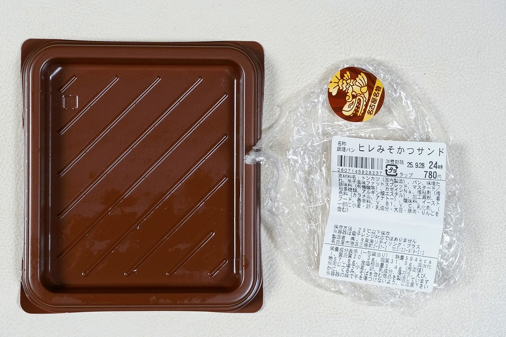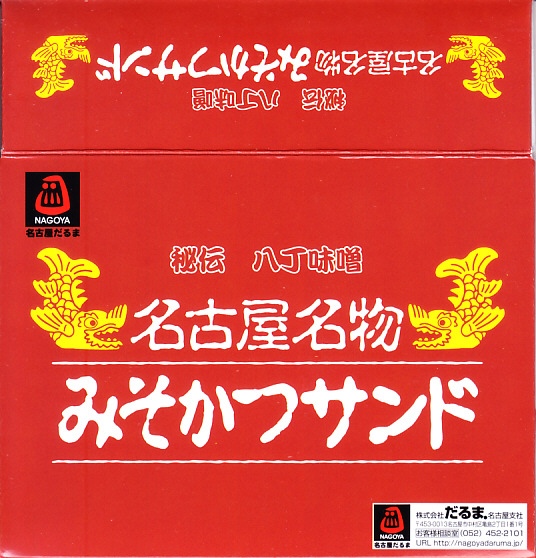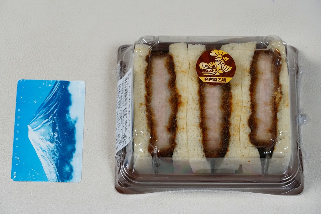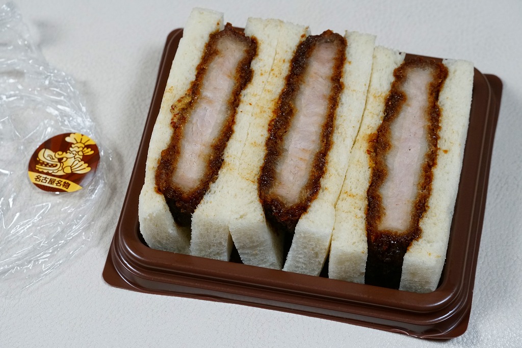 2018(平成30)年までにはこの姿で名古屋駅にて販売か。ヒレカツのみそだれ漬けを耳なし食パンに挟んだカツサンドを3切れ、プラ容器に詰めてフィルムで巻いて、「名古屋名物」と書くしゃちほこ柄のシールを貼る。名前どおり、見た目どおりのカツサンド。購入2日後の9月30日に外装だけリニューアルし、1切れ幅のスリーブを巻くようになった。