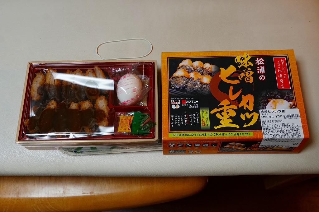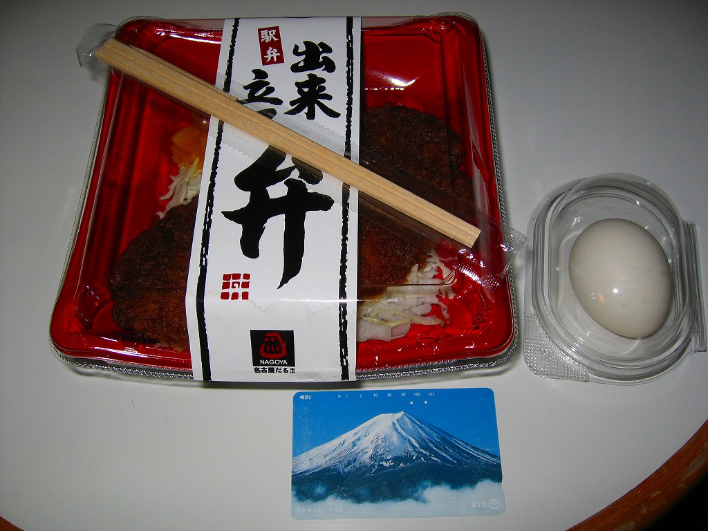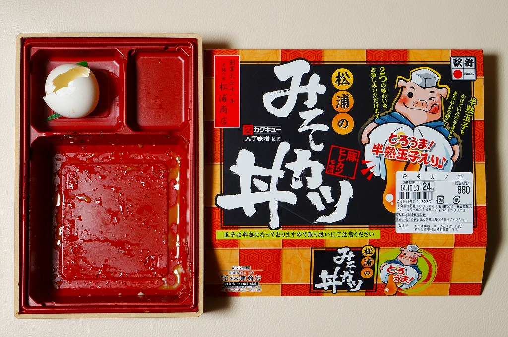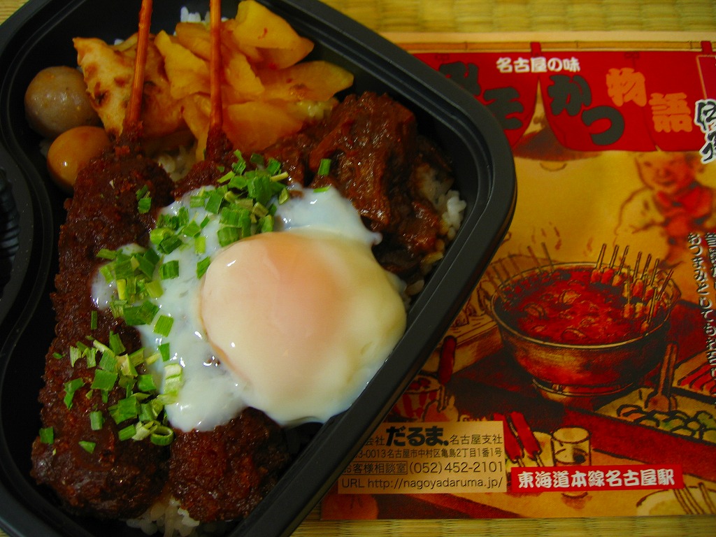 食べる際にこれをカツの上に割ることを推奨するが、駅弁を置く平坦地と卵を割る角さえ確保できれば、うまく卵がこぼれない程度の窪みが確保されているから、成功率は高いと思う。これで味噌ダレの味の角が丸まり、カツとタレのまろやかな風味が口に広がるから、赤味噌嫌いでも大丈夫かもしれない。これが名古屋の新名物「みそ丼」。2009年までに「だるまのみそかつヒレ重」と交代。
