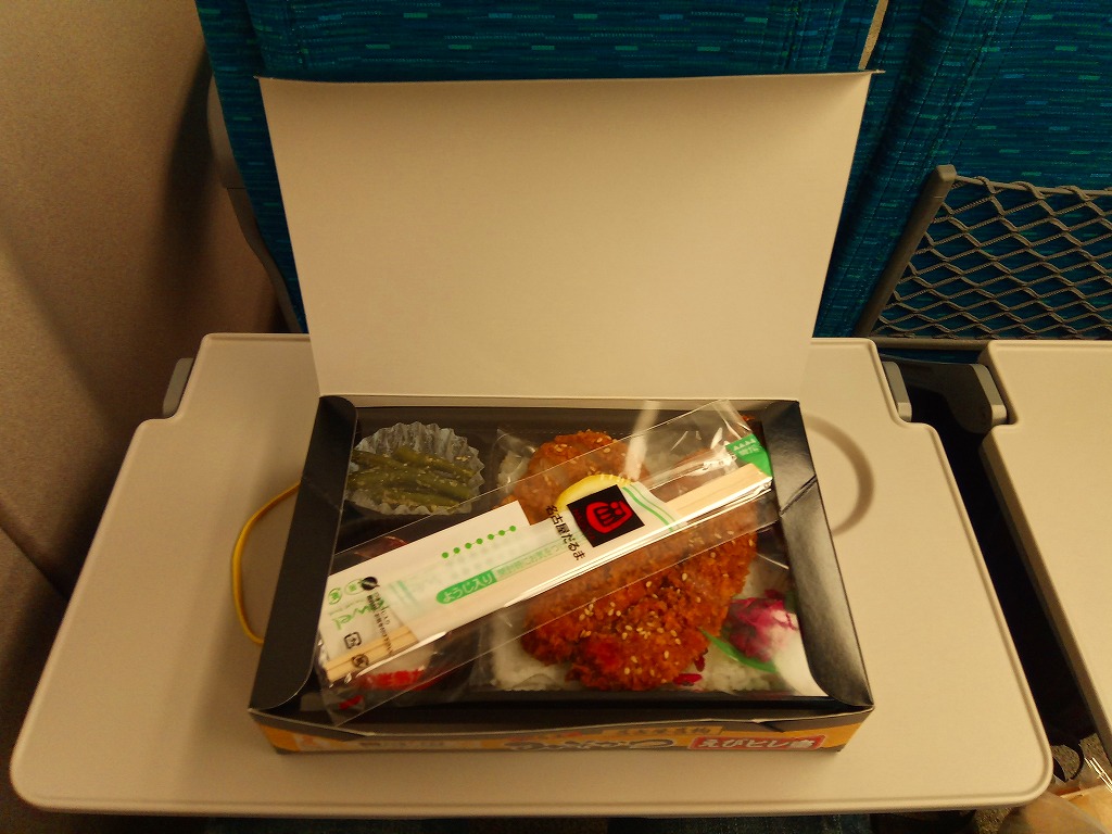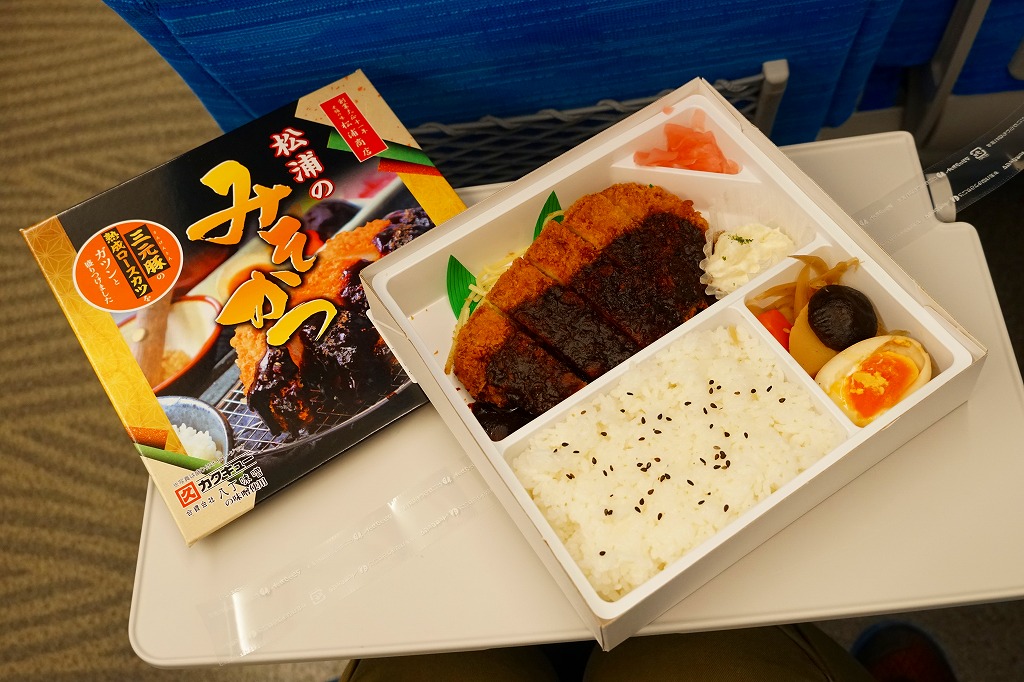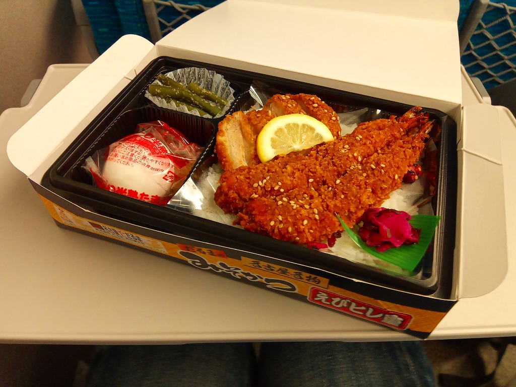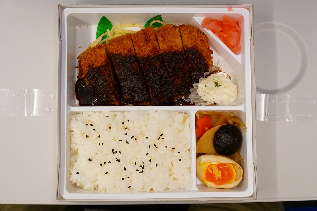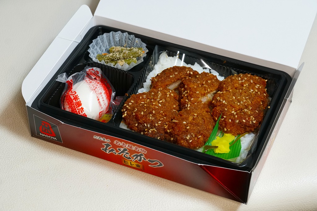 2016(平成28)年の夏までに発売か。白飯の上に、真っ黒になったヒレ味噌カツを3枚載せ、煮玉子も置き、ブロッコリーと柴漬けを添える。ジェイアール東海パッセンジャーズの駅弁なのに、東京、品川、新横浜駅や京都、新大阪駅では売らない、名古屋駅限定の駅弁。無駄のないシンプルさが潔い。2022年までの販売か。