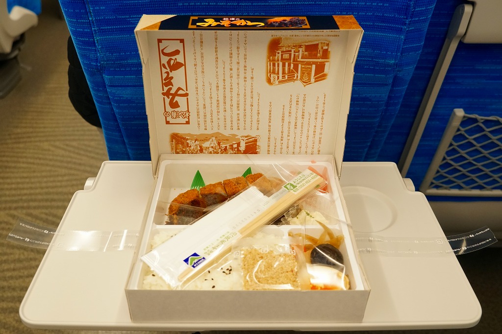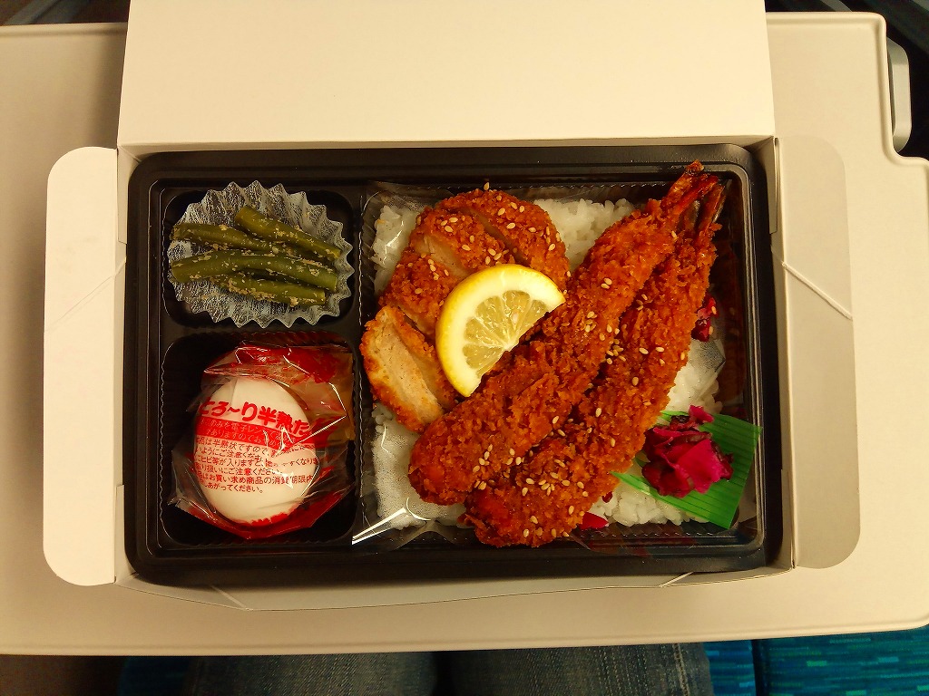 2010(平成22)年までに発売か。白飯にみそエビフライを2本と小さなみそかつを載せ、柴漬け、山菜、半熟卵を添える。見た目どおり、期待どおりの味。内容がほとんど同じで、名前や中身が微妙に異なる駅弁は、ここにはいくらでもあるので、印象が混同するし、混同するくらい風味に違いがない。
