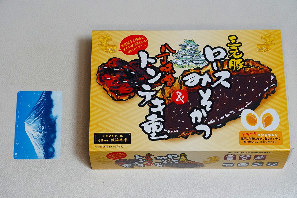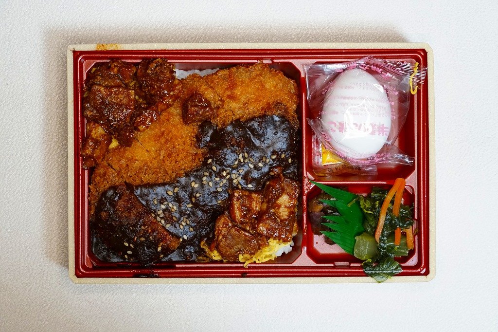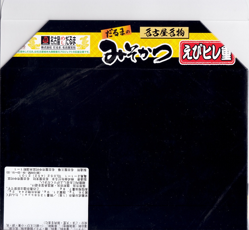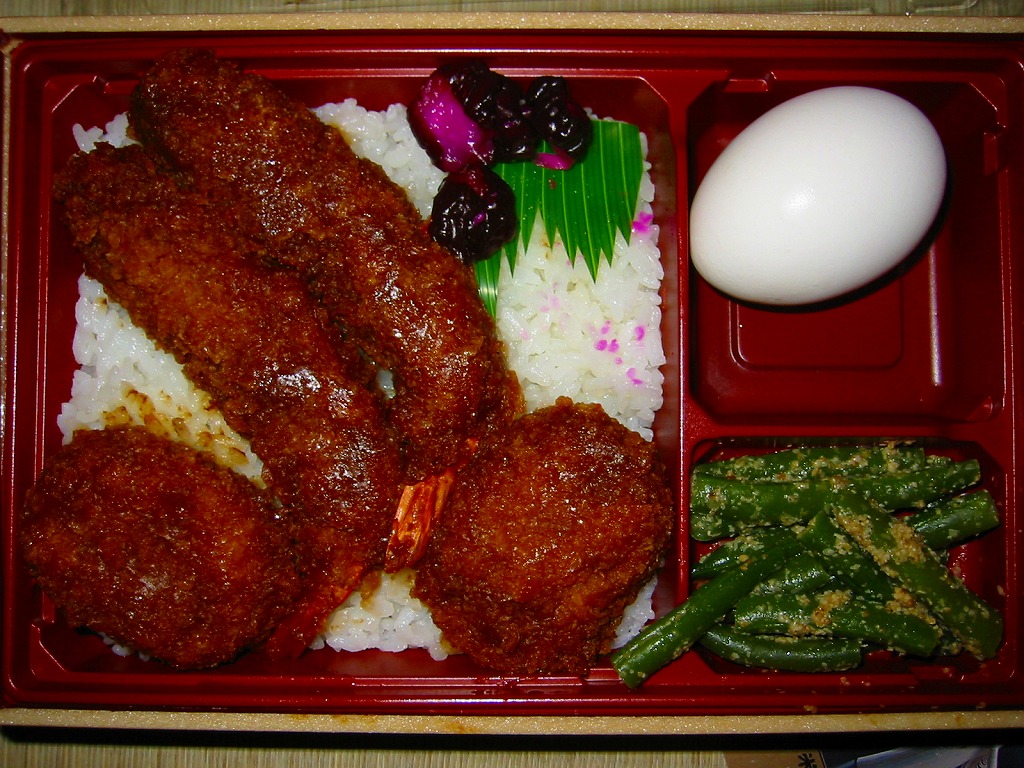 2002(平成14)年頃に発売か。赤いトレーを入れた長方形の容器に透明なふたをかけてボール紙の枠にはめる。中身は白御飯の上に八丁味噌のタレにどっぷり漬けたヒレカツとエビフライを2個ずつ載せて、インゲン胡麻和えとともに半熟卵をひとつ添えている。