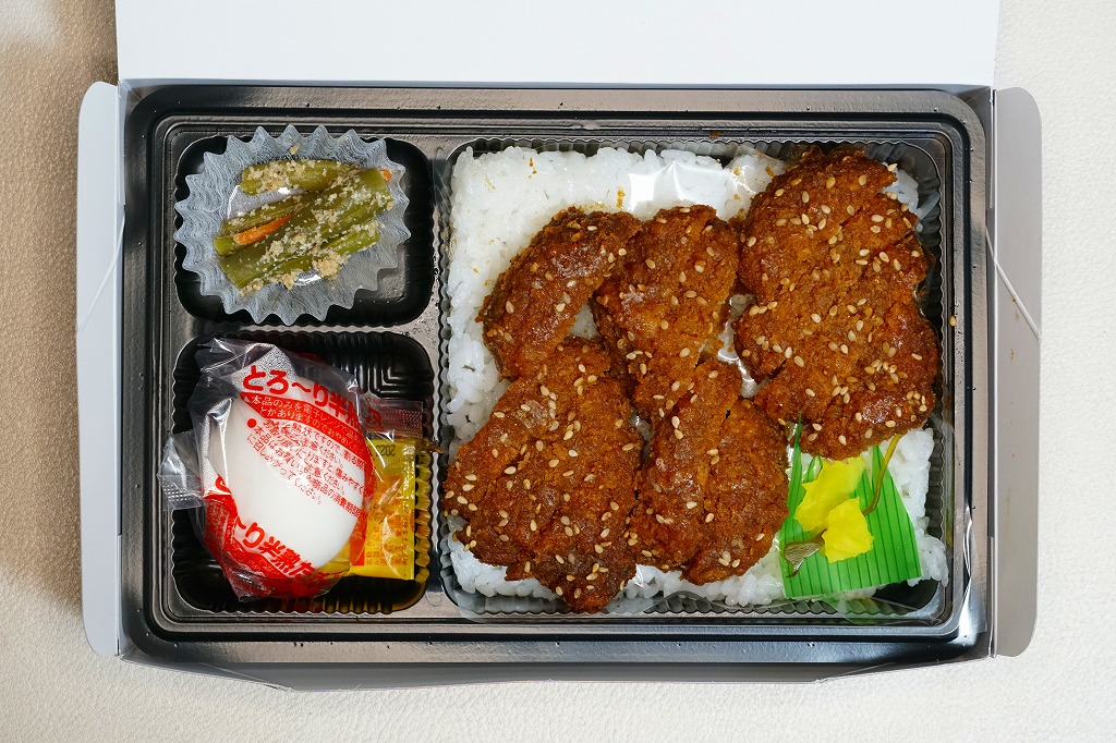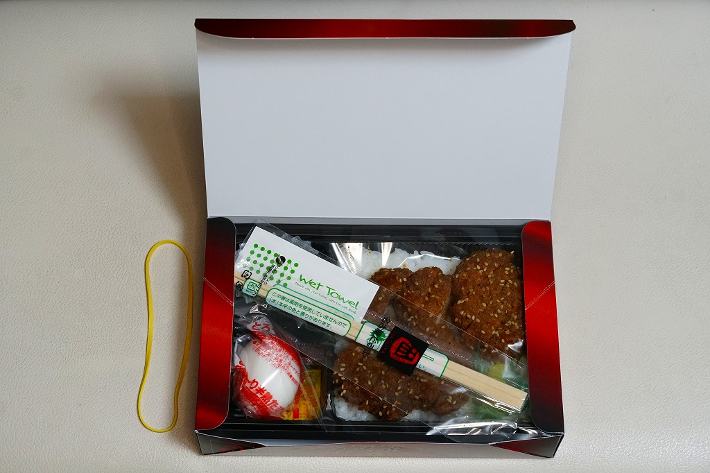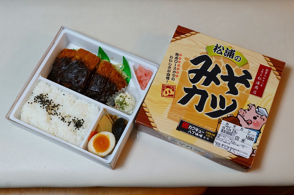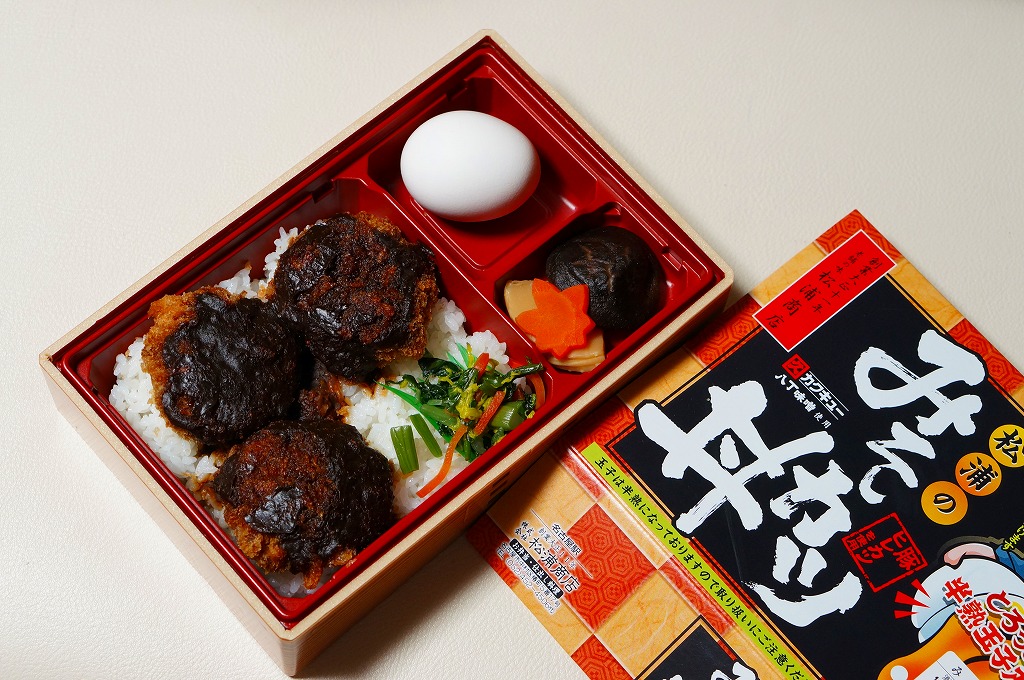 調製元の創業88周年を記念して、2010(平成22)年に発売。商品名と中身の美しい写真が賑やかなふたの裏面には、この駅弁の宣伝文が記される。中身は白飯、カクキューの八丁味噌を使う三元豚のみそカツ、スパゲティ、ポテトサラダ、煮玉子、シイタケやタケノコなどの煮物、きんぴらごぼう、大根桜漬。飯とカツでほぼすべてといった印象で、添付のすりゴマと辛子も活用して、力強いみそかつ弁当を列車内でいただける。価格は2010年の発売時で900円、2014年時点で930円、2015年時点で980円、2020年時点で1,000円、2022年時点で1,050円、2023年時点で1,140円、2024年時点で1,180円、2025年時点で1,230円。