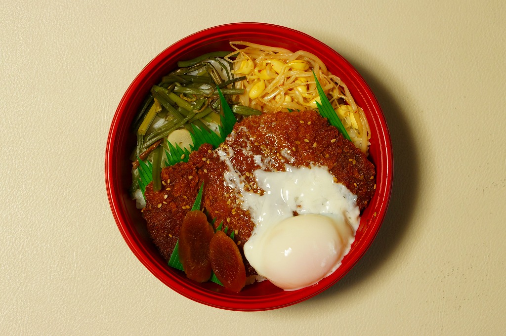 似たような駅弁がここにはいくつもあると思うが、これそのものは2015(平成27)年1月の京王百貨店の駅弁大会での実演販売でデビューか。惣菜向けの円形プラ容器に白御飯を詰めて、みそかつを1個置いて、山菜煮ともやし炒めですき間を埋め、守口大根漬を添え、半熟卵を1個付ける。分かりやすい飯+カツ+半熟卵+付合せ。簡素な容器の使用も、ここでは特徴を後押ししている感じ。駅でどう売られているかは分からない。この時だけの販売だったのかもしれない。