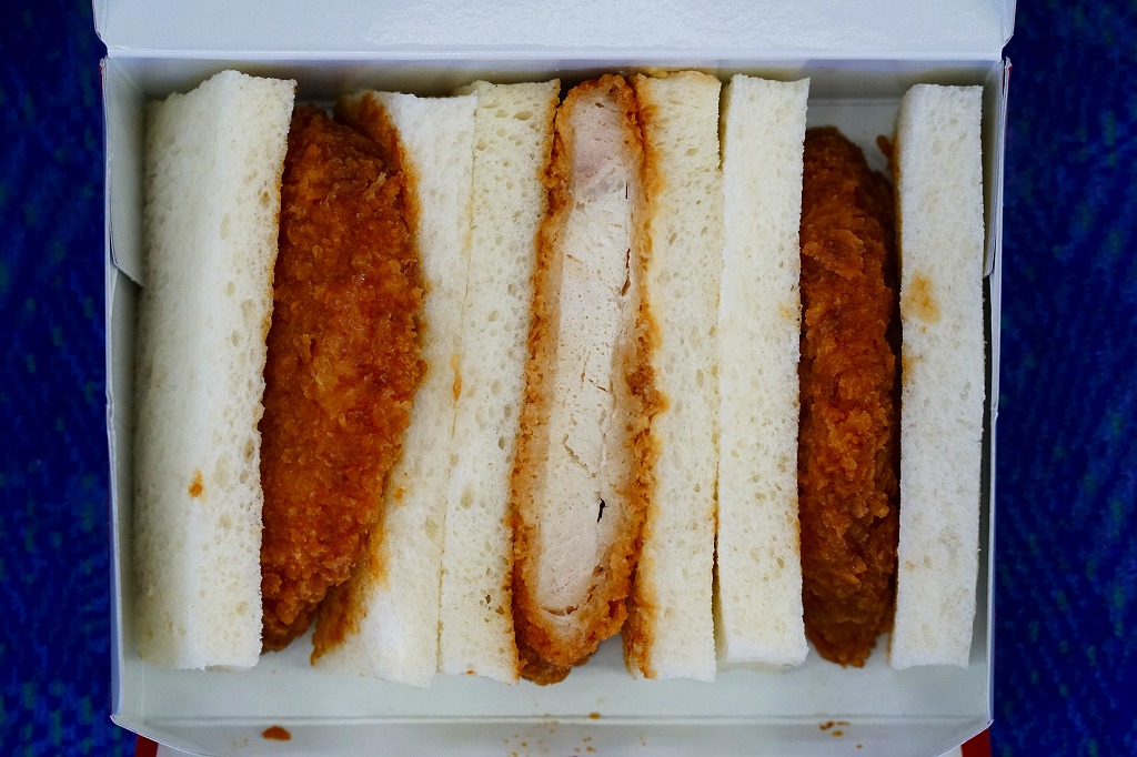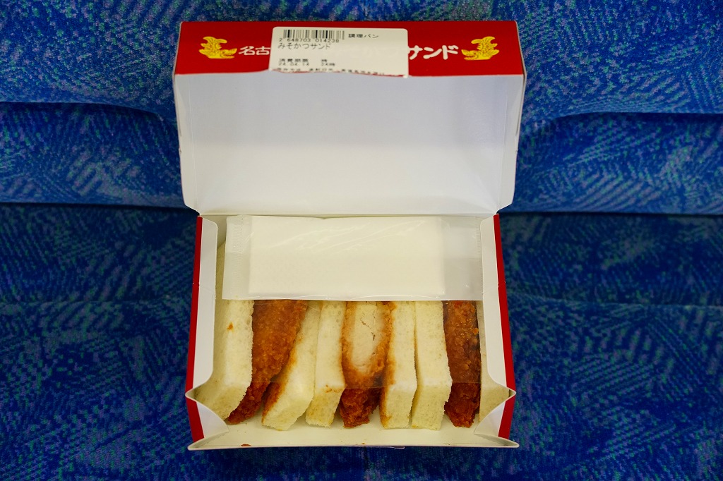 2005(平成17)年2月に中部国際空港の空弁として発売。のちに名古屋駅の駅弁売店でも売られるようになり、今回は岐阜駅のキヨスクで買えた。商品名のとおり、赤味噌のソースに浸けたロースカツのみを耳なし食パンに挟んだサンドイッチを3切れ、赤味噌色の紙箱に収める。今の名古屋エリアの駅売店に、あってしかるべき駅弁だと思う。価格は2005年の発売時で580円、2010年時点で600円、2015年時点で670円。