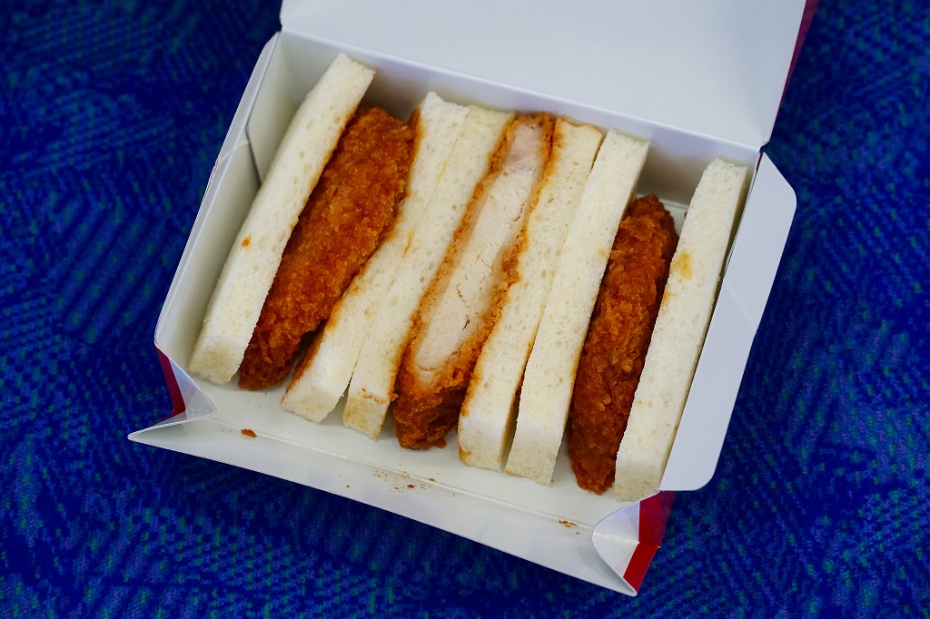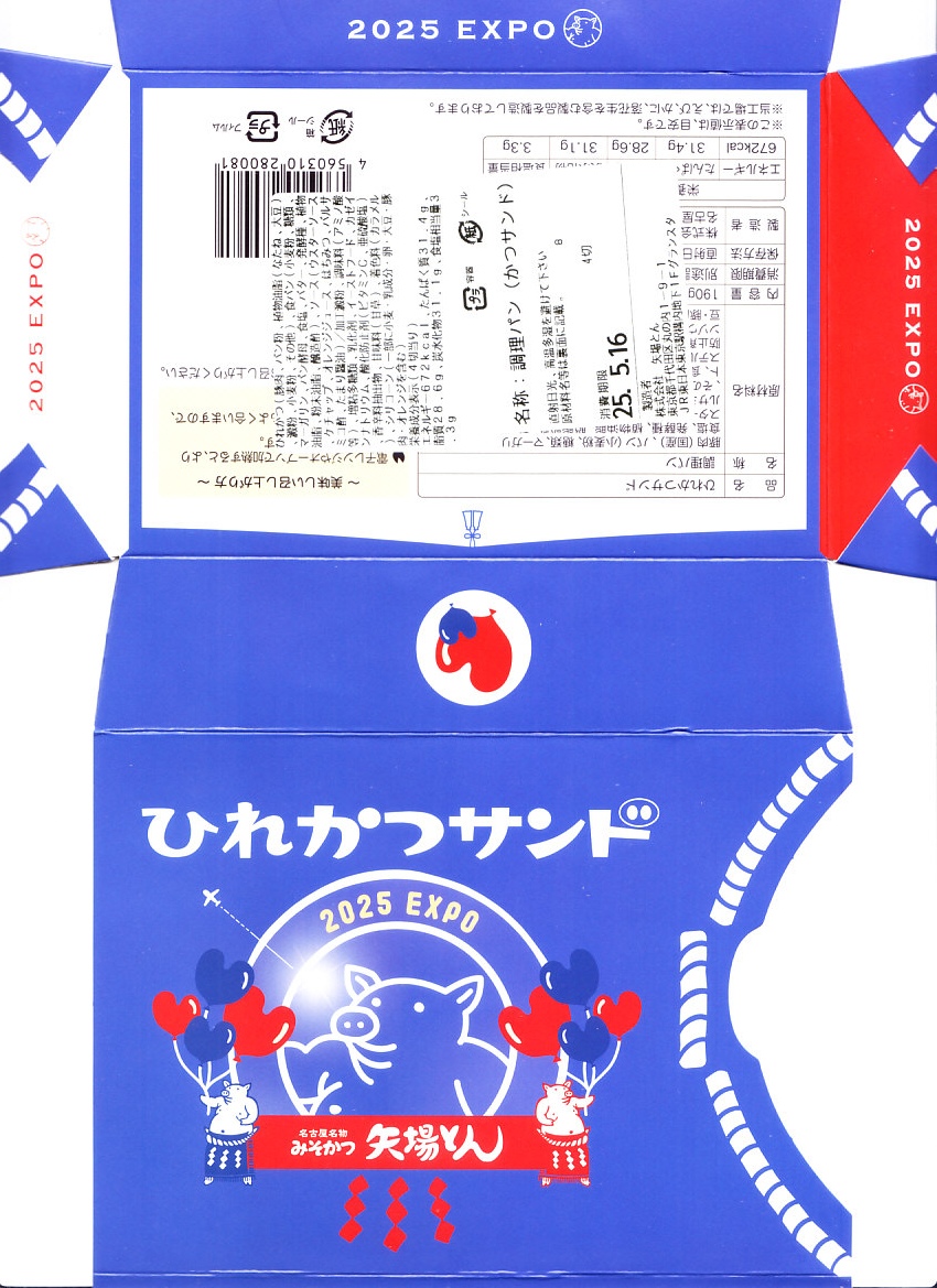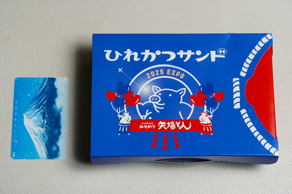 名古屋で親しまれ、名古屋駅構内にも店舗がある、名古屋名物みそかつ専門店で買えるカツサンド。2025(令和7)年4月13日から10月13日まで開催される大阪・関西万博に、4月13日から5月12日まで出店し、カツサンドやライスバーガーやグッズなどを販売した。これは東京駅の同店舗で買えたもの。専用紙箱での赤と青の配色は、万博の公式キャラクターにちなんだものだと思う。
