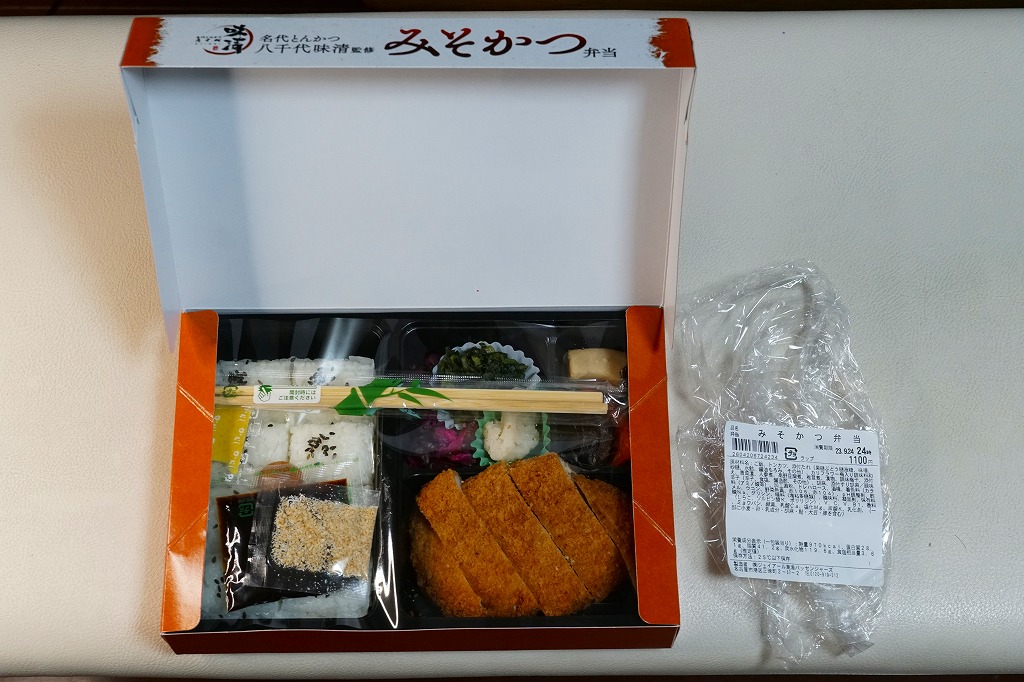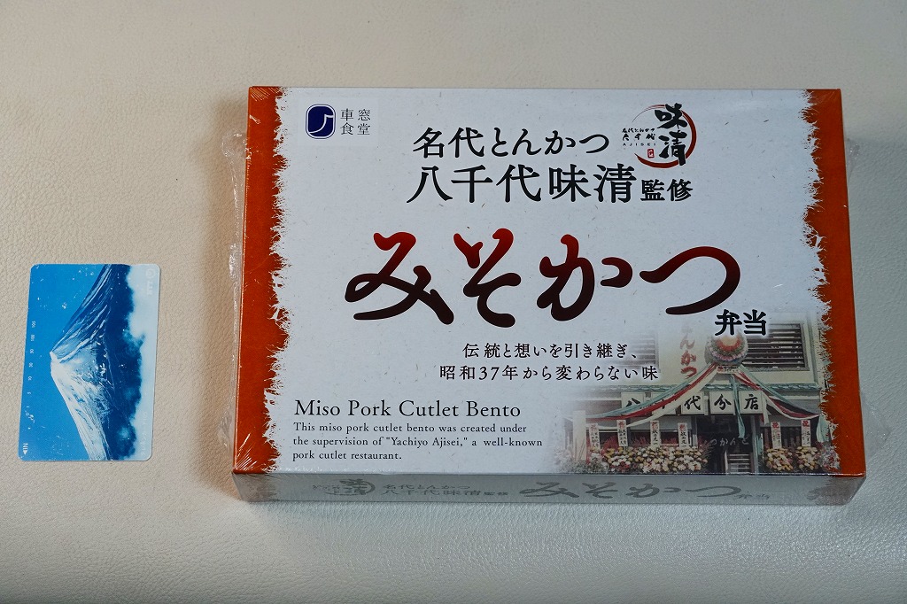 既存の名古屋駅弁「名古屋みそかつ弁当」に、名古屋を代表する老舗洋食屋という「名代とんかつ八千代味清」の監修を追加し、2020(令和2)年までにリニューアルか。商品名を書いた専用の紙箱に収めた黒いプラ製トレーに、日の丸俵飯風の型押し白飯、とんかつ、カリフラワー、青菜漬け、ニンジンとしいたけとタケノコの煮物と高野豆腐、しば漬けを詰める。みそかつのタレと胡麻と辛子は別添。シンプルできれいな、みそかつ弁当。価格は2020年時点で930円、2022年時点で950円、2023年時点で1,050円、9月の購入時で1,100円、2025年時点で1,200円。