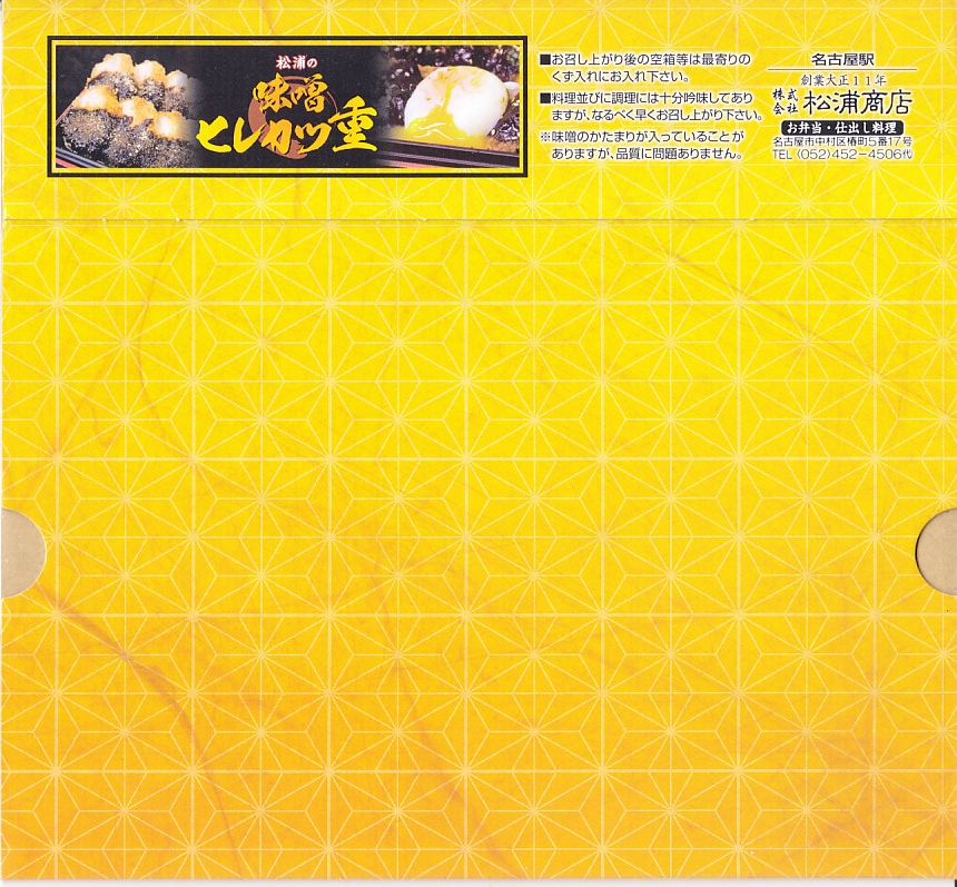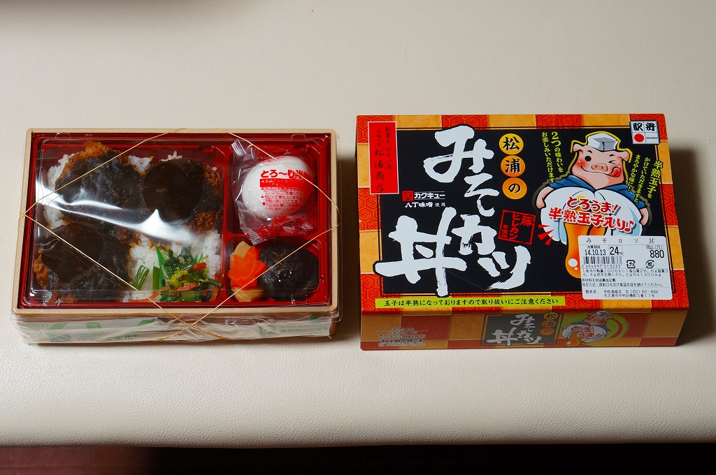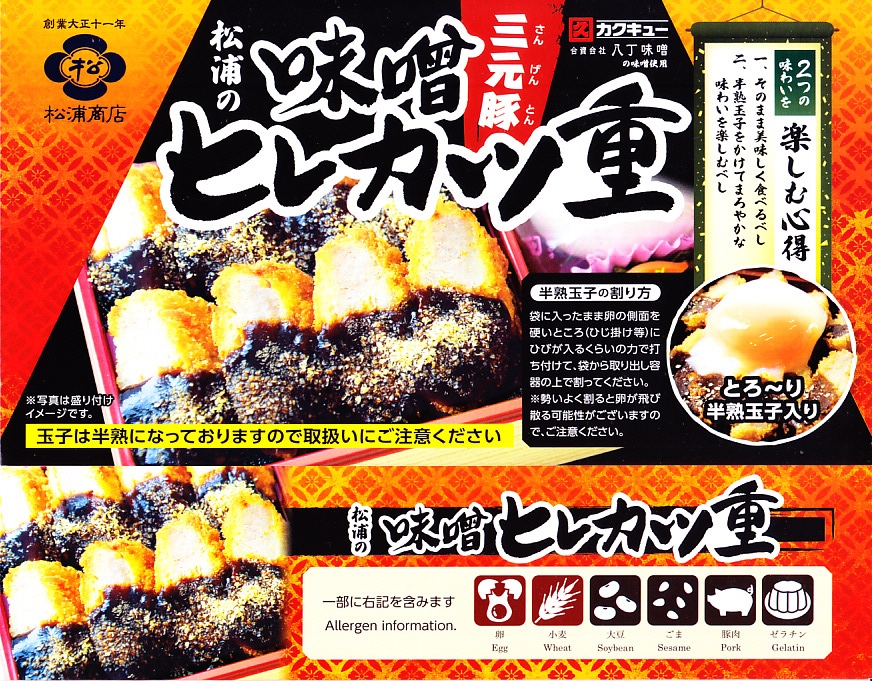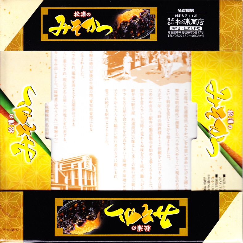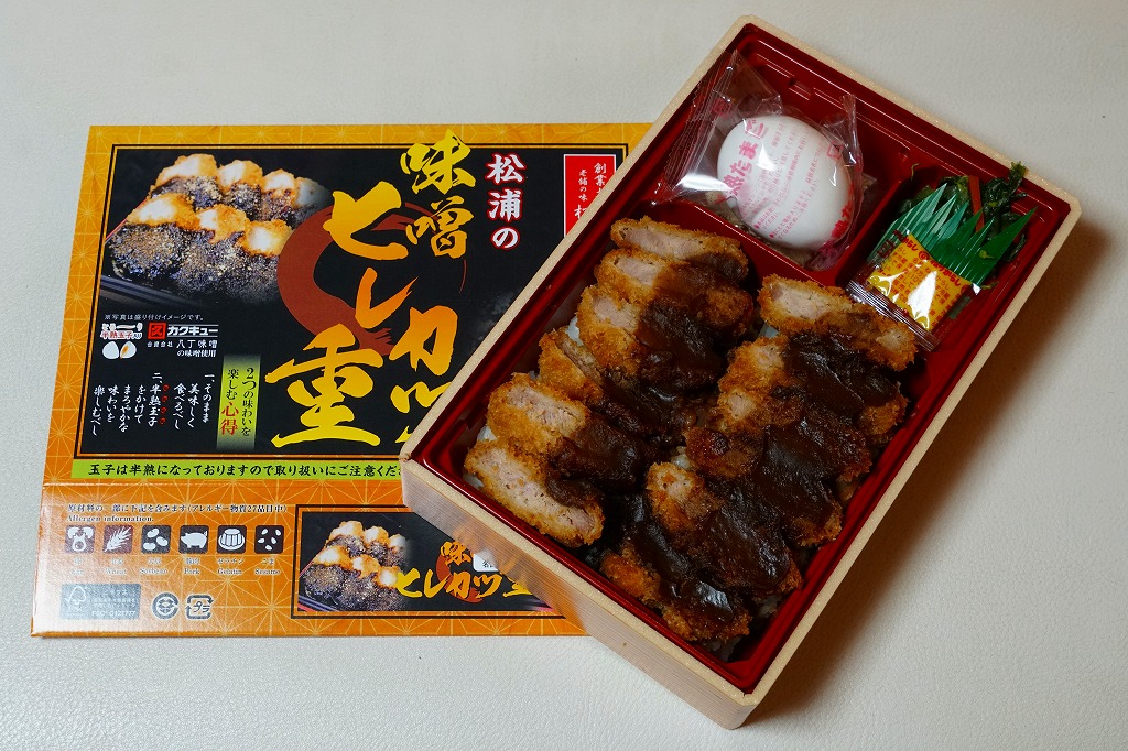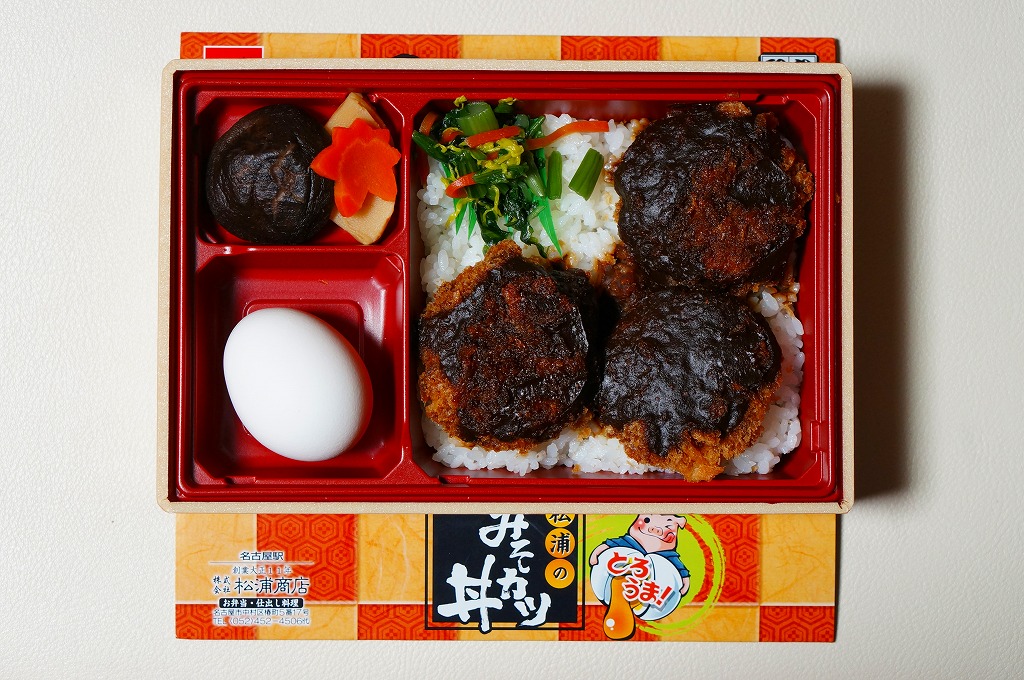 名古屋駅にあふれる味噌カツの駅弁のうち、数少ない松浦商店のもので、2011(平成23)年頃の発売か。白飯に丸い味噌カツを3個置き、半熟卵、シイタケとタケノコとニンジンの煮物、和え物を添える。カクキューの八丁味噌を使うとか、半熟卵でまろやかな味になるとか書いてあるが、常温の駅弁として食べると他社や他種のものに比べて、肉質以外の差はないに等しい。普通においしくいただける。価格は2014年の購入時で880円、2018年時点で900円。2019年8月に「松浦の味噌ヒレカツ重」へリニューアル。