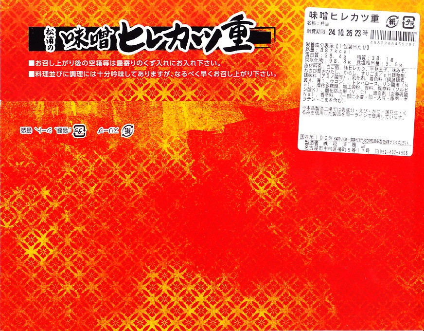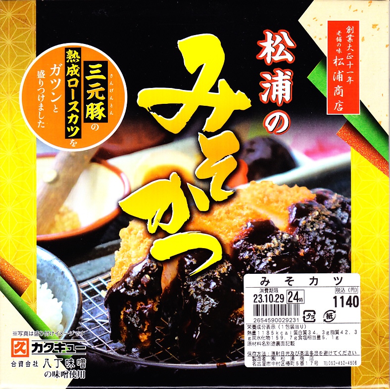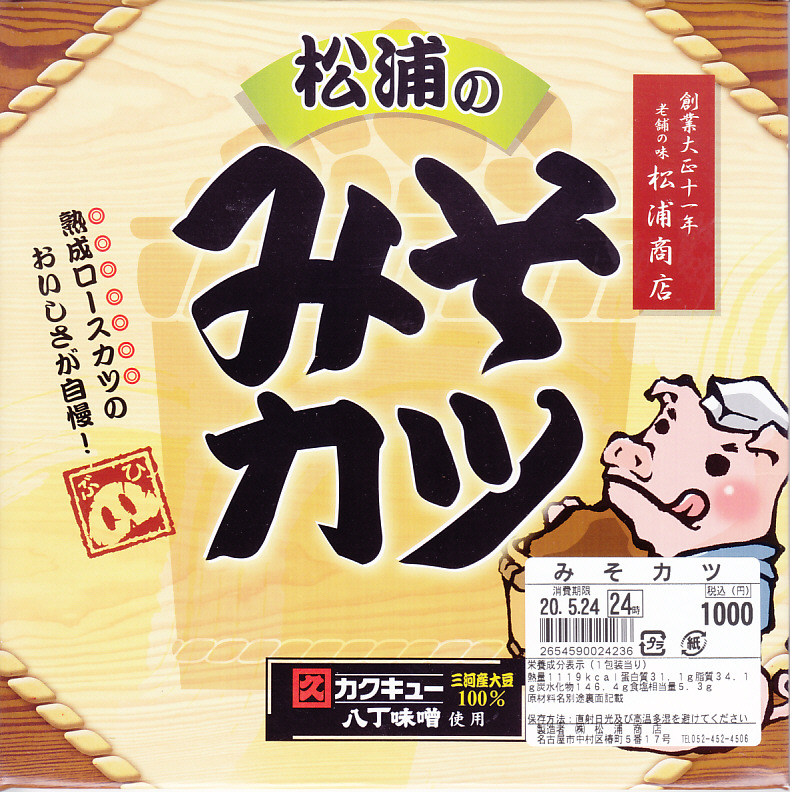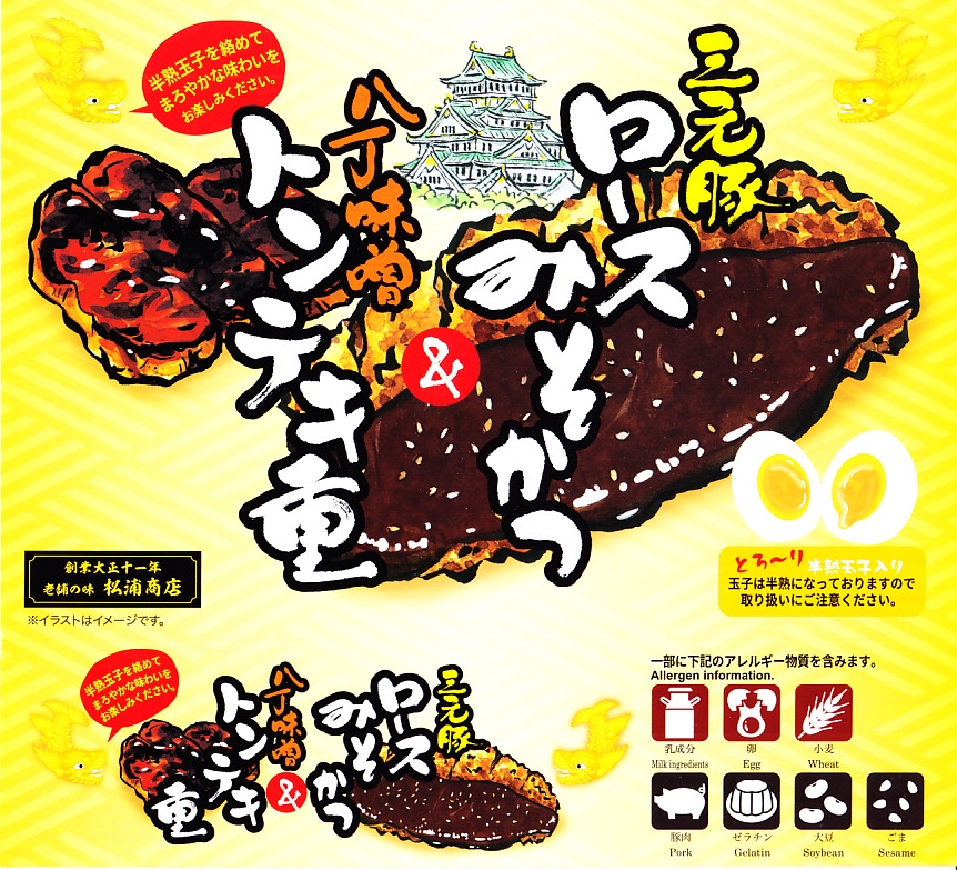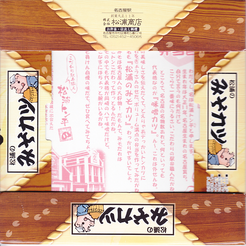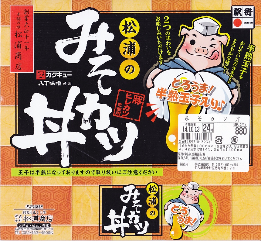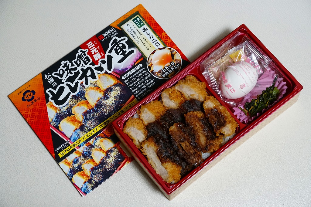 名古屋駅にあふれる味噌カツの駅弁のうち、数少ない松浦商店のもので、2011(平成23)年頃の発売か。白飯に丸い味噌カツを3個置き、半熟卵、シイタケとタケノコとニンジンの煮物、和え物を添える。カクキューの八丁味噌を使うとか、半熟卵でまろやかな味になるとか書いてあるが、常温の駅弁として食べると他社や他種のものに比べて、肉質以外の差はないに等しい。普通においしくいただける。価格は2014年の購入時で880円、2018年時点で900円。2019年8月に「松浦の味噌ヒレカツ重」へリニューアル。