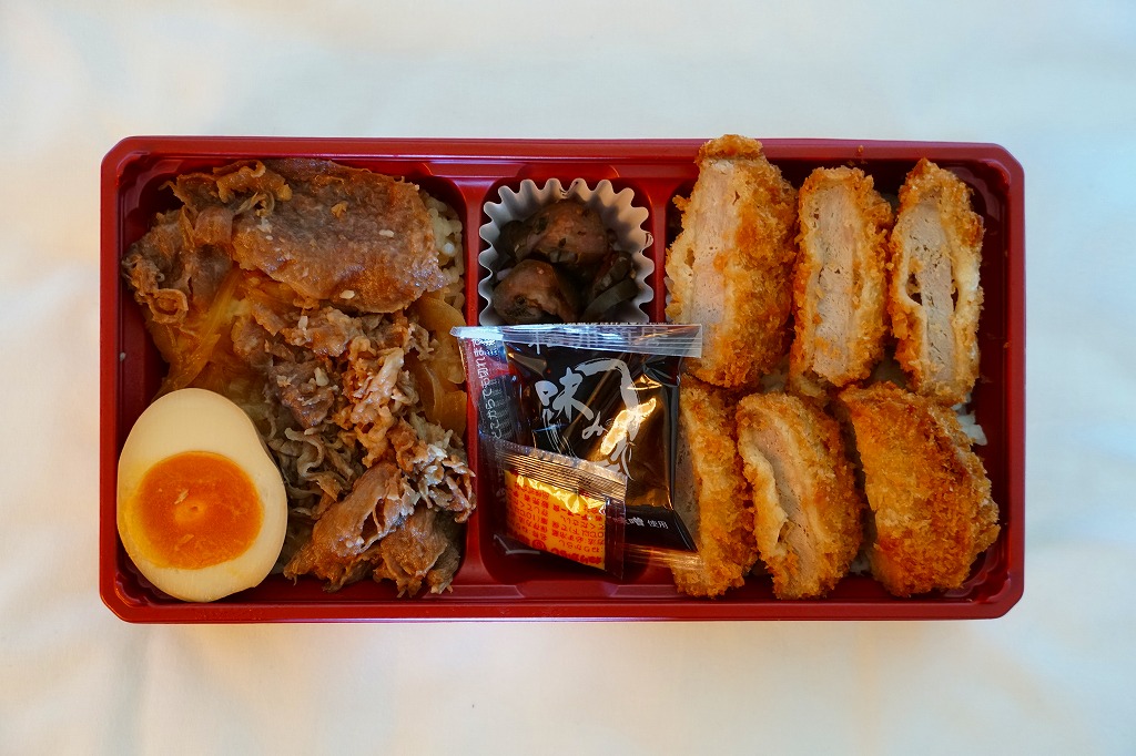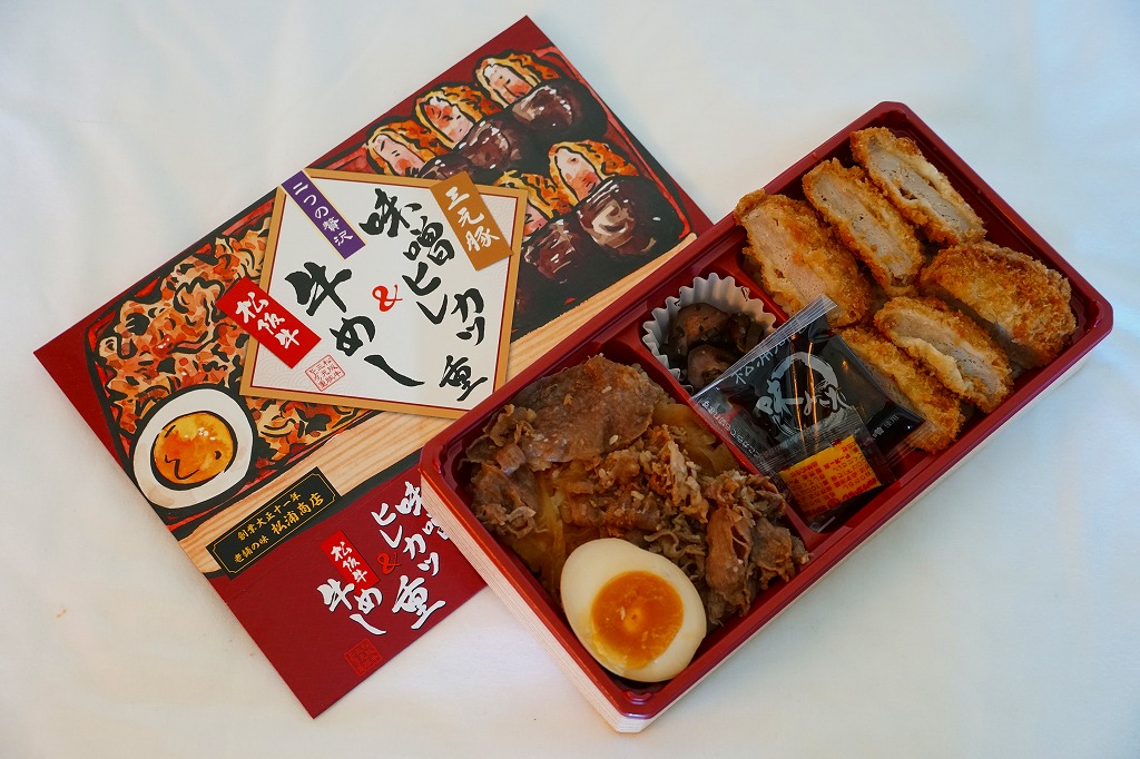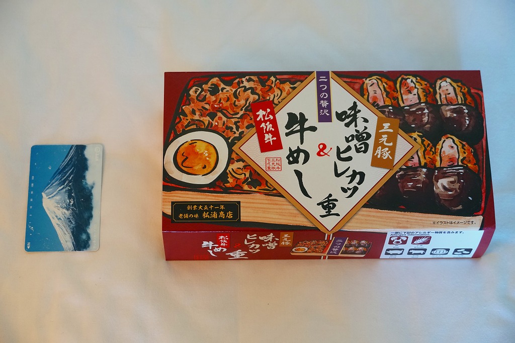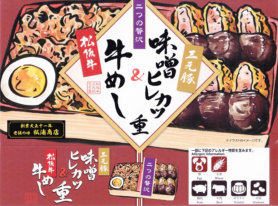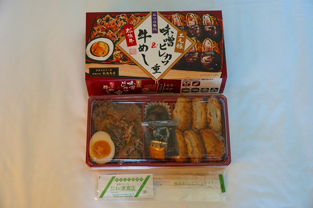 秋冬の駅弁大会シーズンに向けた、2021(令和3)年秋の新商品か。名前のとおり、スリーブに文字と絵柄で示されるとおり、容器の左半分が松阪牛の牛めし重、右半分が三元豚の味噌ヒレカツ重となり、これに味付け卵としば漬けを添える。名古屋駅で買えた牛やカツの弁当よりも、脂身の香り豊かな牛丼であり、赤味噌の風味豊かなカツ丼であったと思う。このシーズン限り、半年間の販売か。駅弁催事専用商品だったのかもしれない。