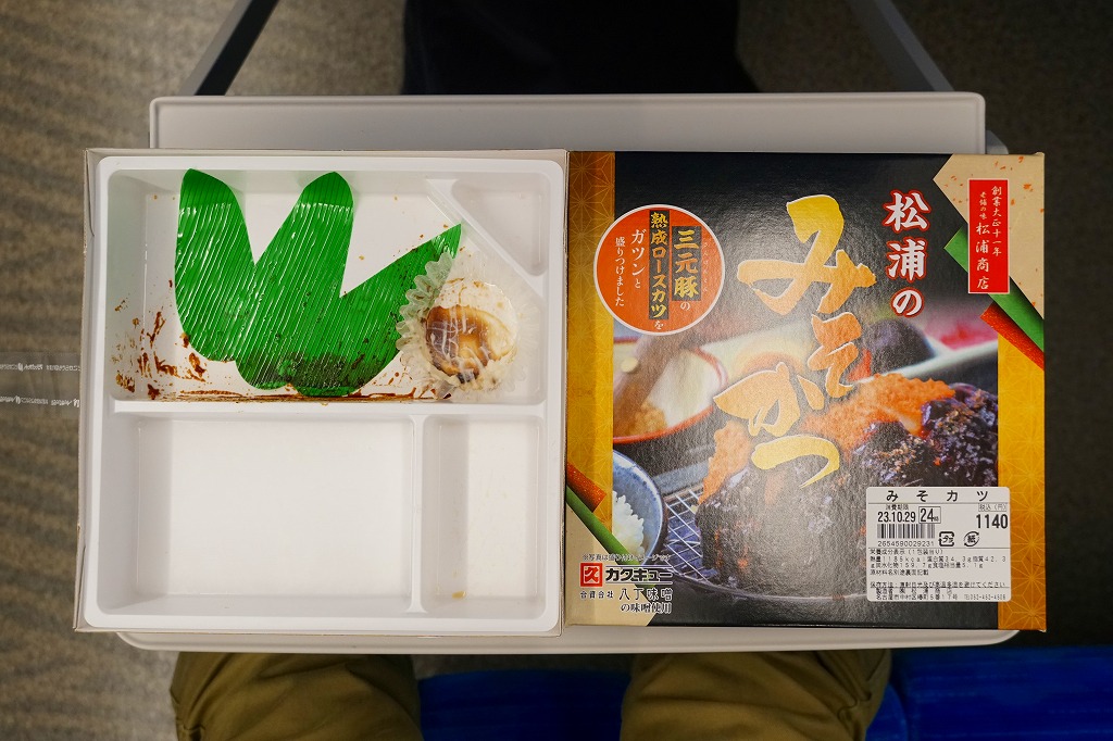2024年までに名古屋駅の駅弁売り場でも発売か。1947年に名古屋市街で創業したとんかつ店の商品で、市内に加え大阪や東京などでもチェーン展開する有名店「矢場とん」の持ち帰り弁当であり、従前から名古屋駅構内を含む同社の店舗で買うことができた。黒くて丸いプラ容器に、白飯を詰め、とんかつを載せ、柴漬けを添える。「みそかつ丼」たるみそだれは、弁当に添付するソースとは思えない大きさで別添し、容器を留める紙枠に食べ方を書いている。からしとすりごまも添付し、お好みの味付けでいただける仕組み。このブランドと内容でみそかつ丼を売られては、駅弁屋のものはとてもかなわない。