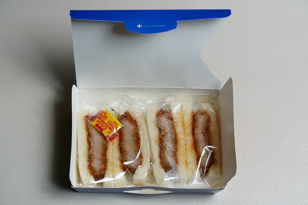 ひれかつのみそだれ漬けのみの具を耳な食パンで挟んだカツサンドを4切れ、袋詰めして紙箱に収め、パプリコ萬家姫という辛子を添える中身は、通常版と同じ。他の市販のみそかつサンドより、さっぱりした感じ。価格は東京でも通販でも980円、万博会場では1,200円。