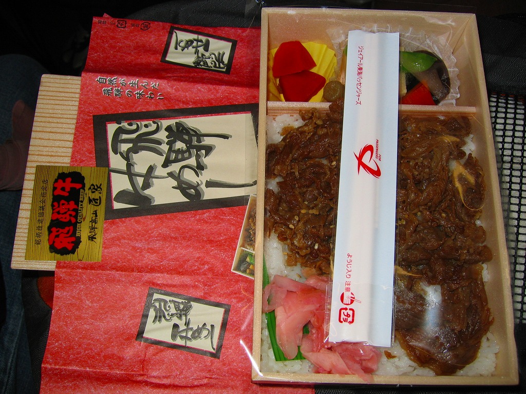 2004(平成16)年までに発売か。長方形の容器に赤い掛紙を巻いて、食品表示ラベルを貼りプラ帯で留める。中身は白御飯に飛騨牛すき焼き肉を載せ、赤かぶ漬や数点の煮物を添える。
